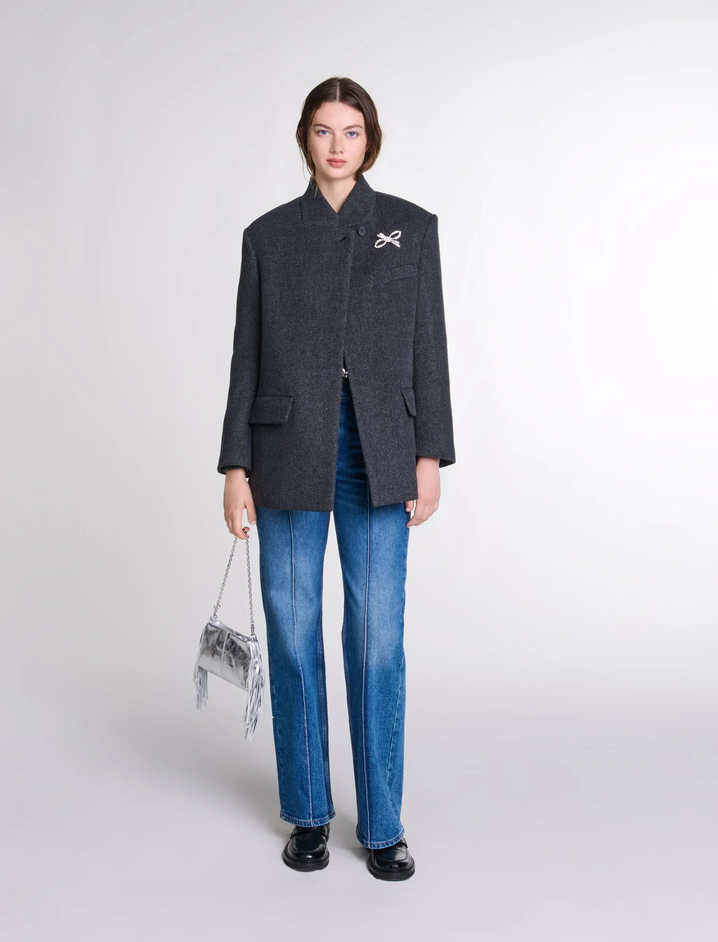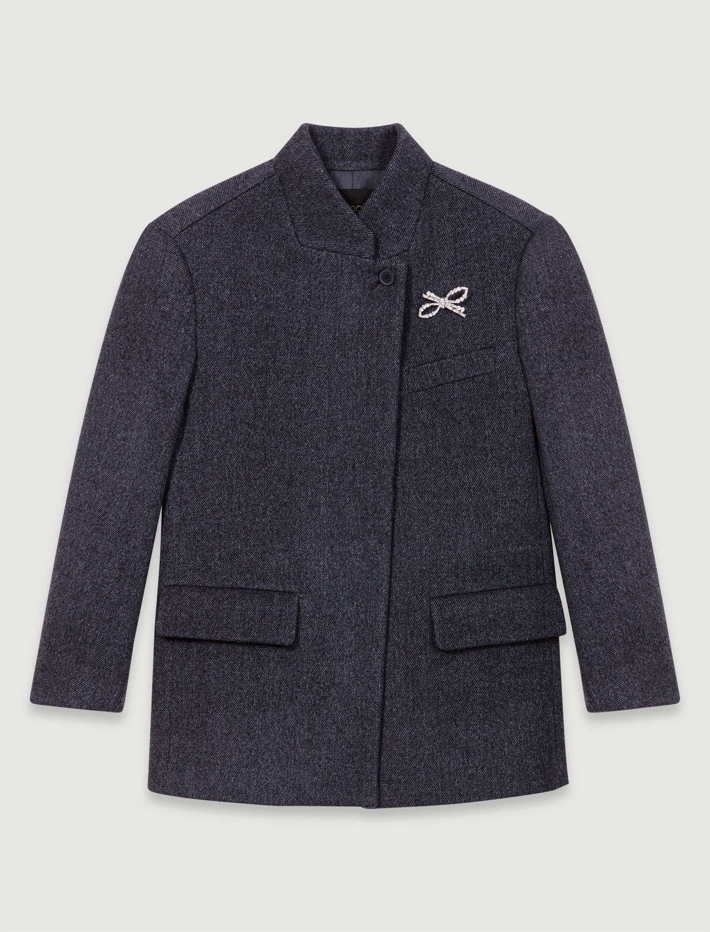 Confeccionado en lana y forrado de satén, este abrigo corto es una reinterpretación elegante y refinada de una chaqueta. Un broche joya adornado con un lazo de strass añade un toque de brillo.