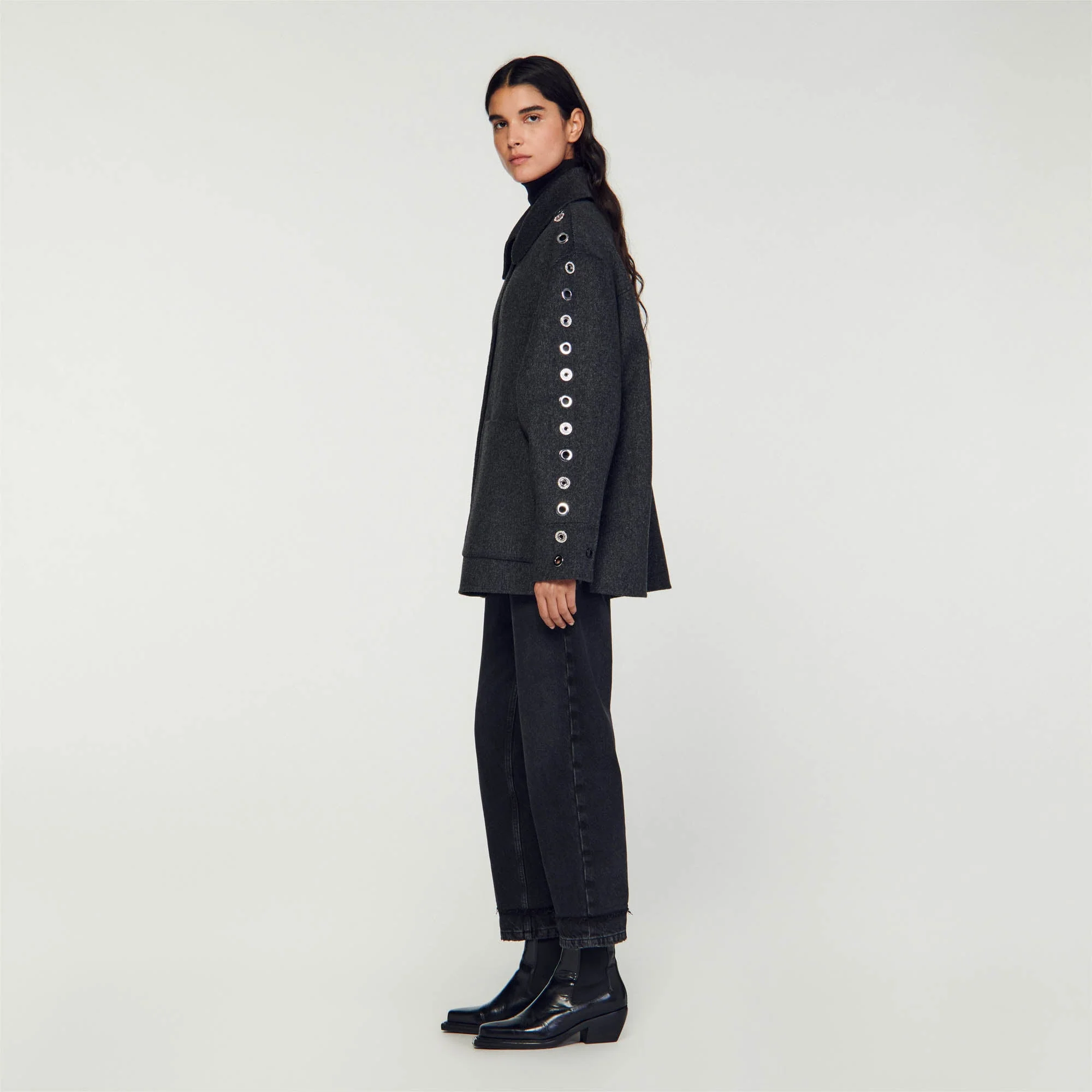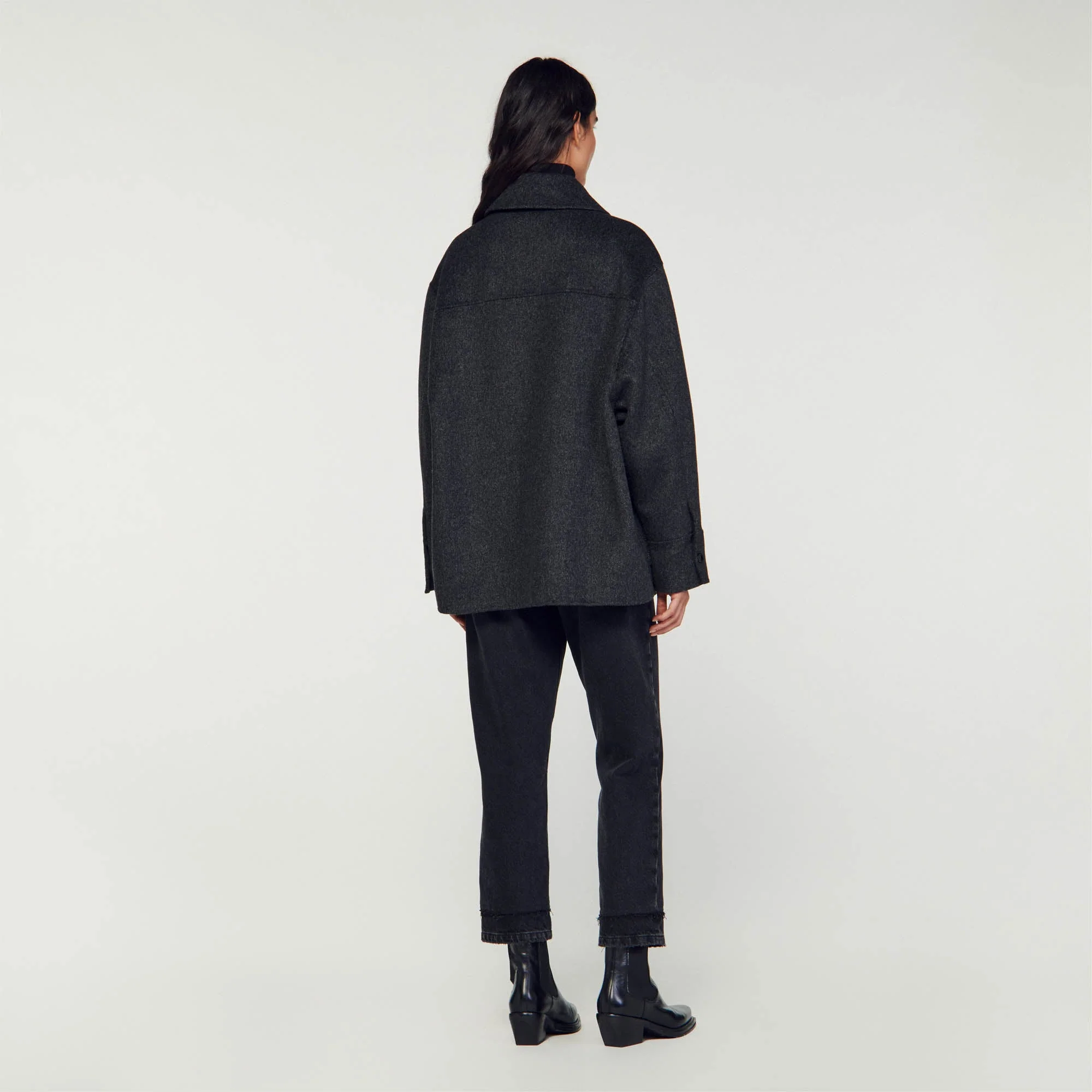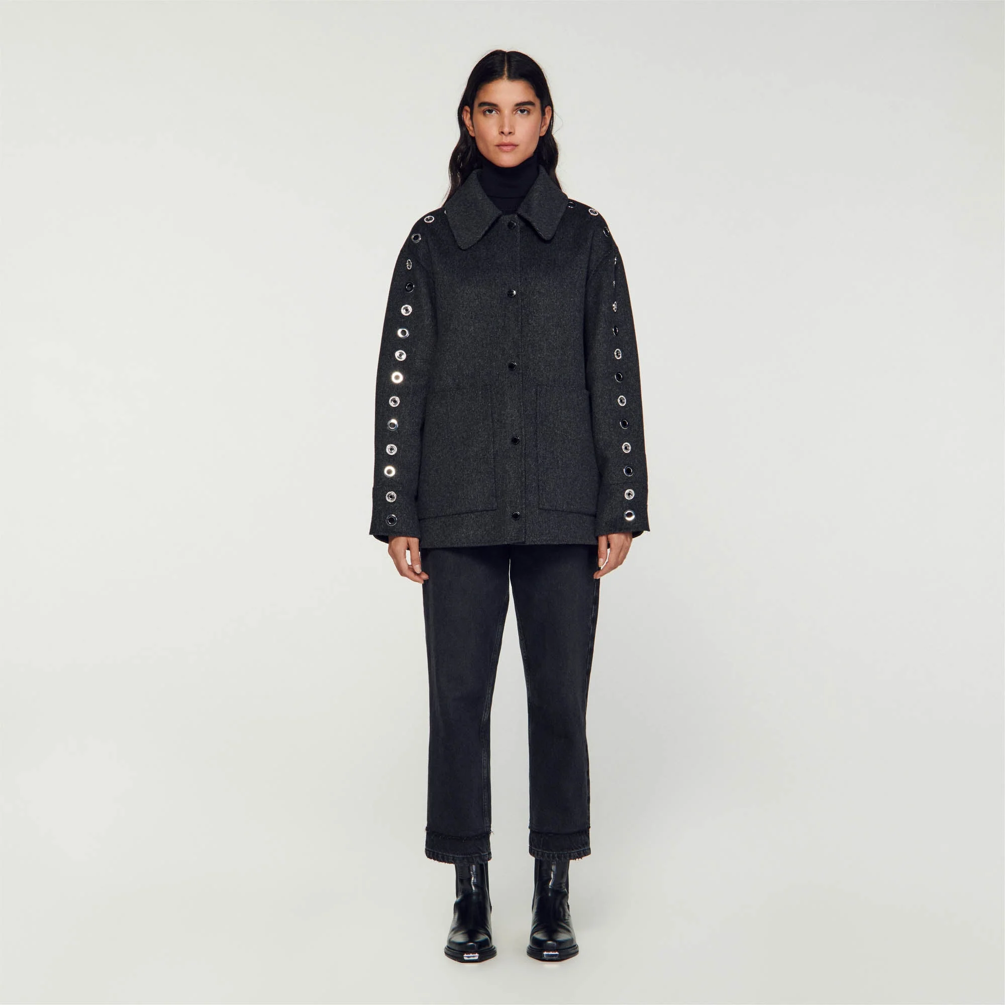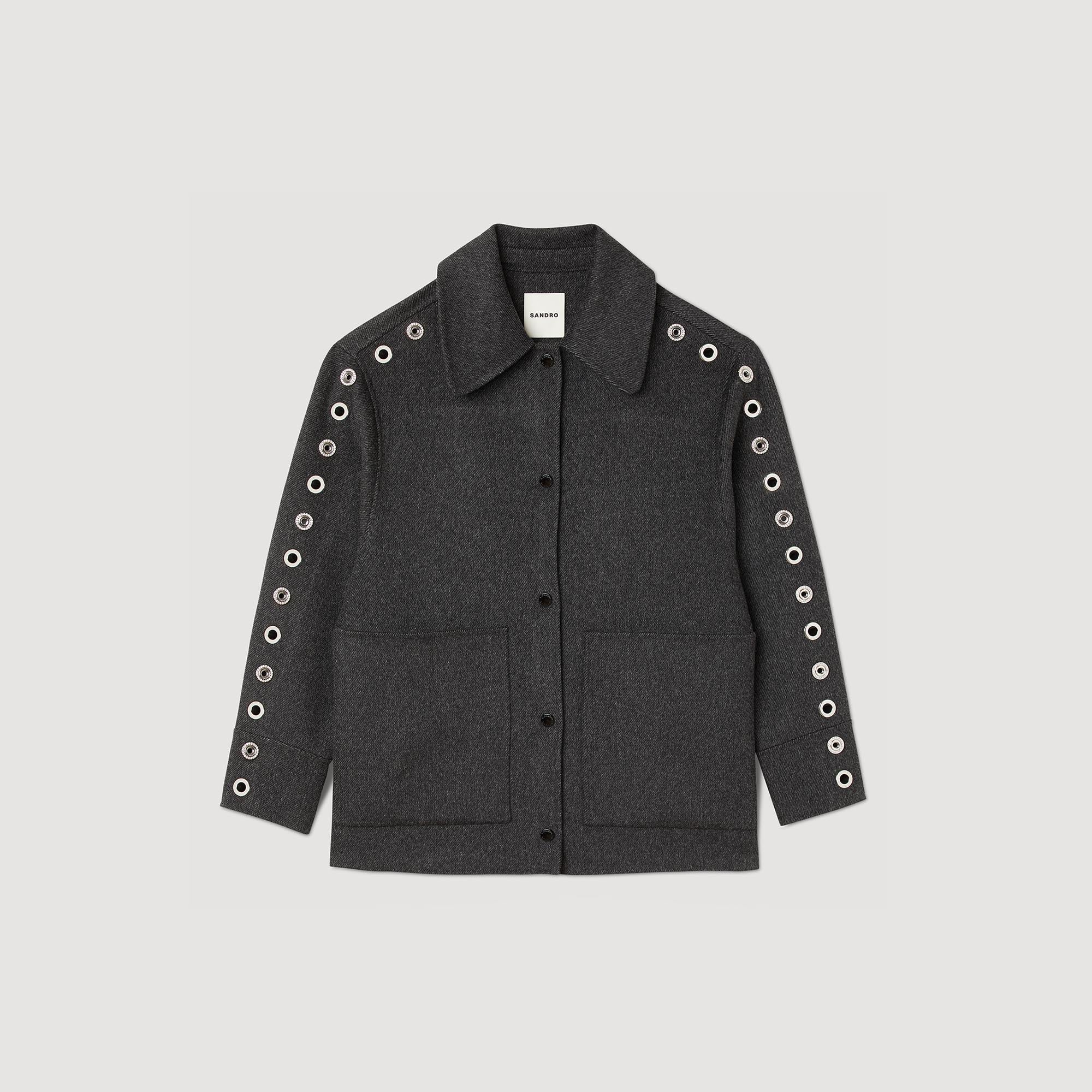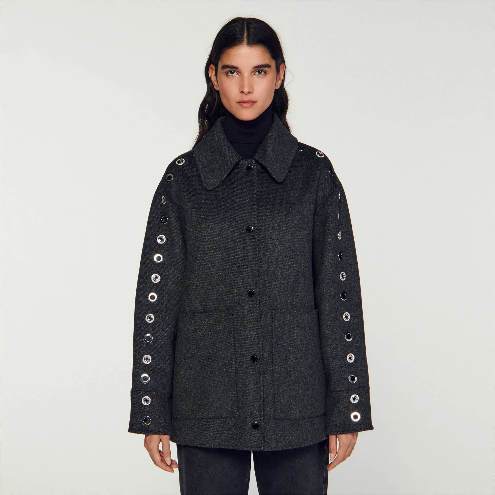 Abrigo oversize estilo sobrecamisa con mezcla de lana, con cuello camisero, manga larga adornada con detalles de ojetes, cierre con automáticos y grandes bolsillos de parche en los laterales.• Abrigo reversible Sandro Mujer