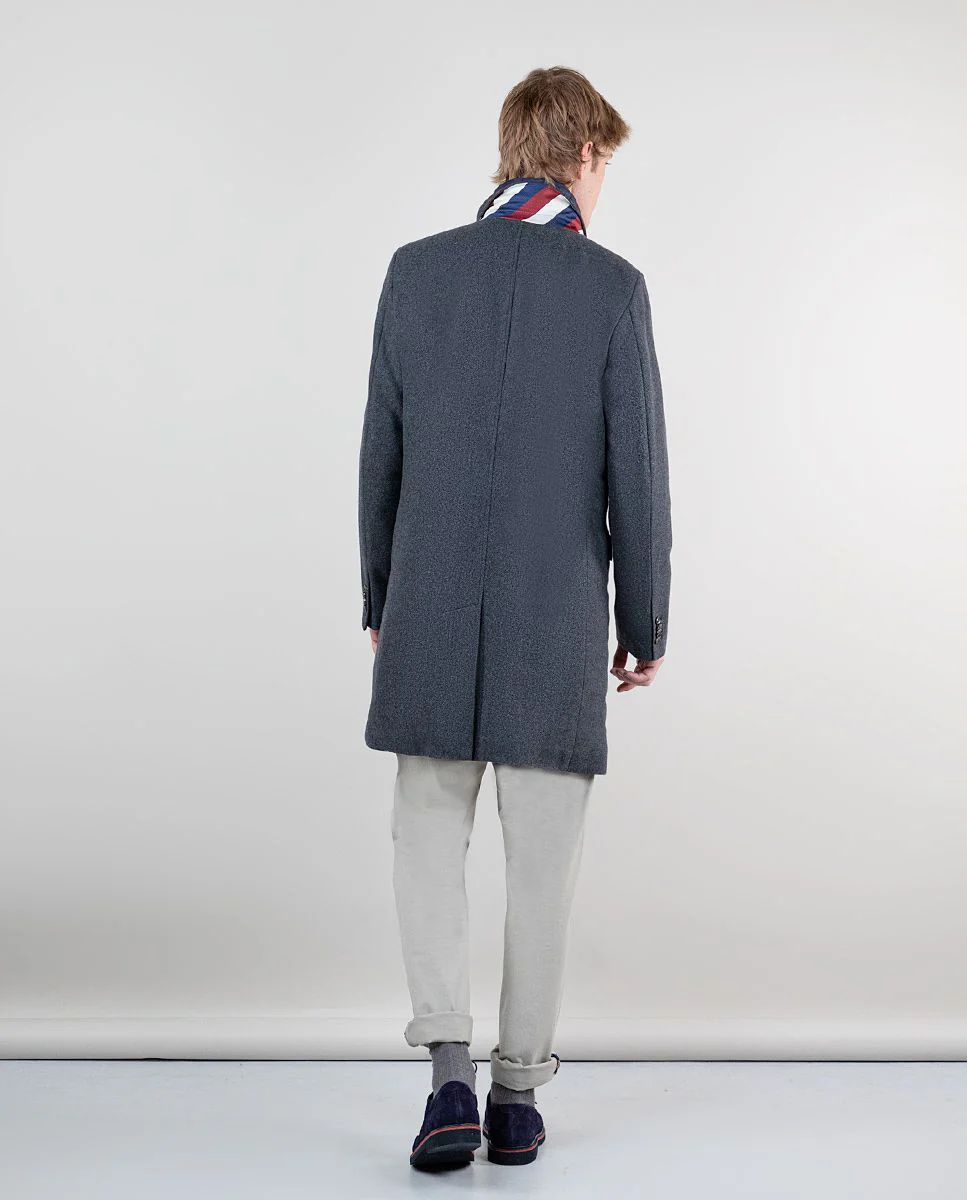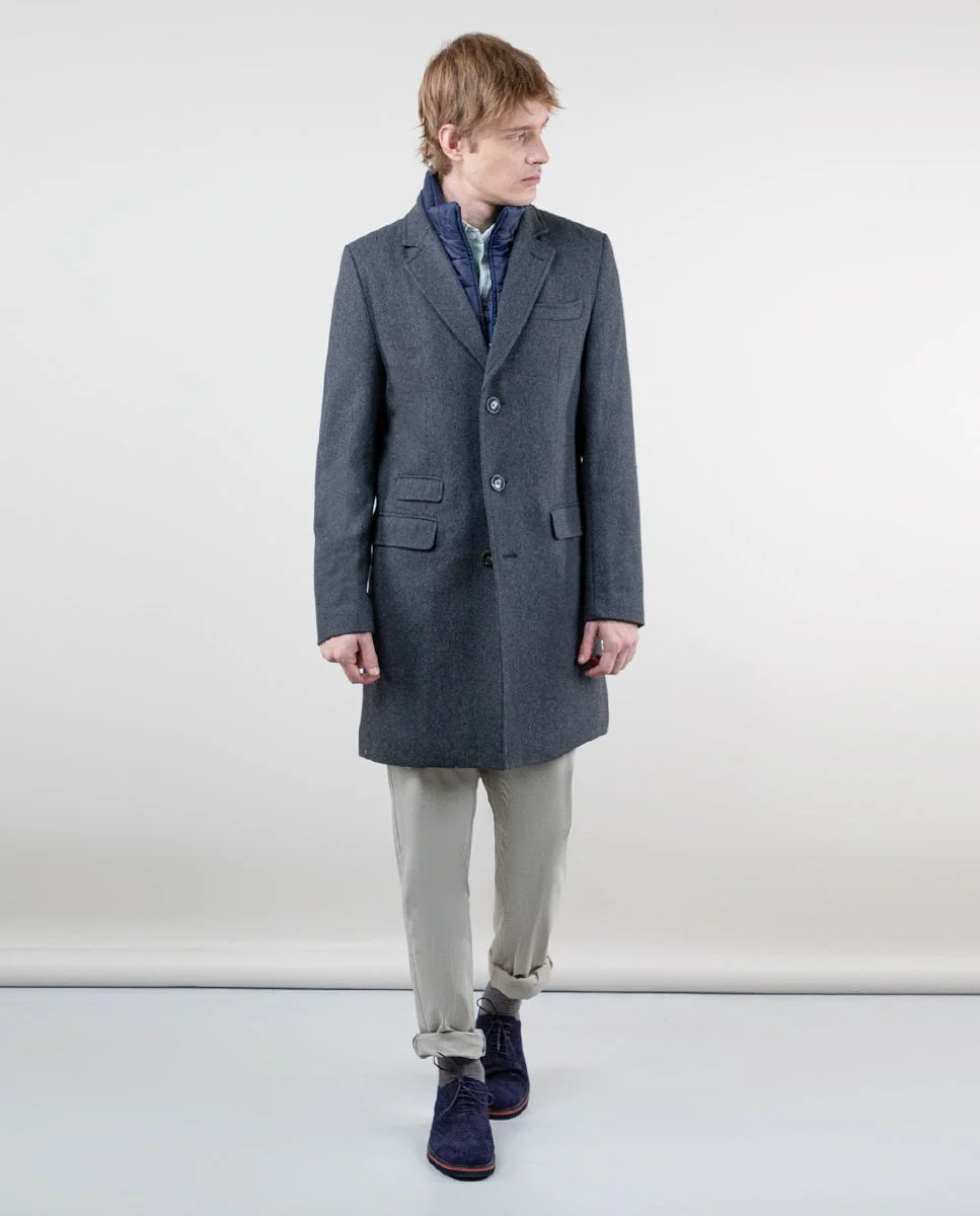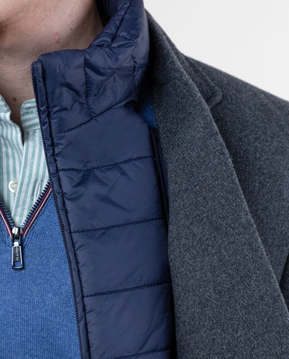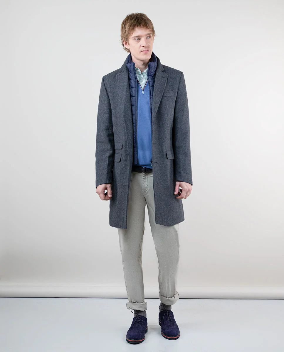 Nuestro abrigo de hombre más emblemático, de paño liso y confeccionado en lana con un acabado repelente al agua. Cuello con solapa de muesca y ojal, cierre mediante tres botones. Un bolsillo insertado a la altura del pecho, tres bolsillos de cartera a la altura de cadera y bolsillos interiores. Tiene puño de cuatro botones y una abertura en la parte posterior. Lleva vista interior con acolchado sostenible y extraible. Forro interior guateado con franjas a contraste. En el bajo cuello lleva tejido corbatero como detalle. Dato interesante: el tejido de este abrigo es transpirable, repelente al agua y la temperatura se mantiene ante cualquier estado del ambiente además de aislar del frío. El relleno acolchado que lleva el abrigo es de Sorona®, un relleno térmico especial fabricado por Dupont que además de retener el calor corporal, es aislante, transpirable y reciclado.