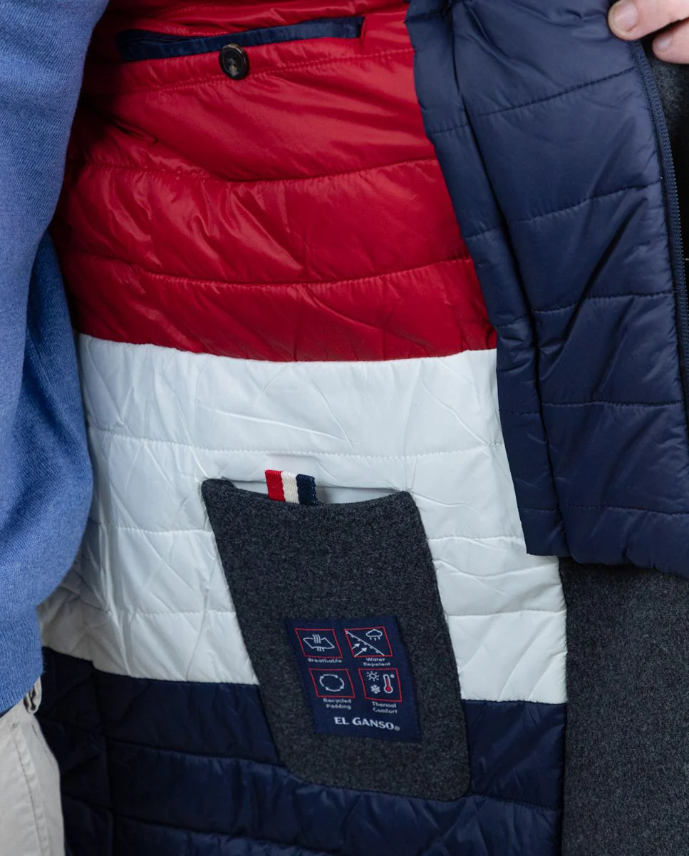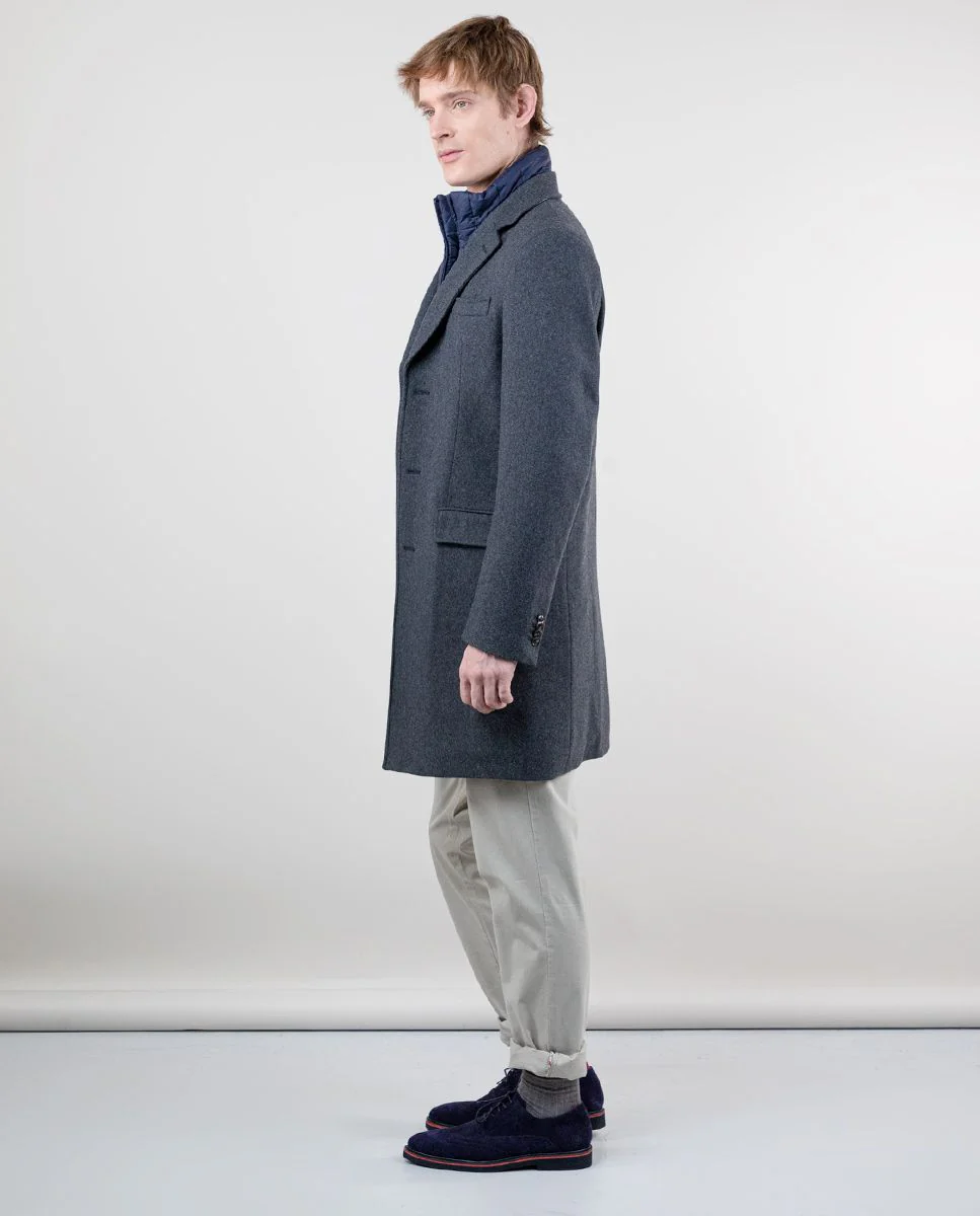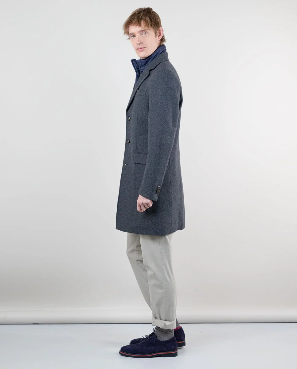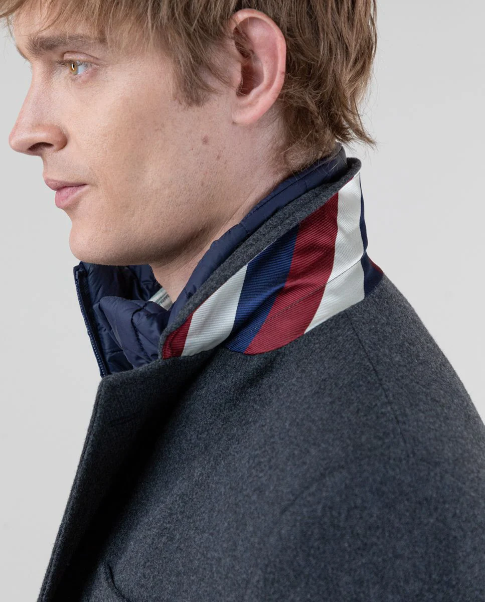 Nuestro abrigo de hombre más emblemático, de paño liso y confeccionado en lana con un acabado repelente al agua. Cuello con solapa de muesca y ojal, cierre mediante tres botones. Un bolsillo insertado a la altura del pecho, tres bolsillos de cartera a la altura de cadera y bolsillos interiores. Tiene puño de cuatro botones y una abertura en la parte posterior. Lleva vista interior con acolchado sostenible y extraible. Forro interior guateado con franjas a contraste. En el bajo cuello lleva tejido corbatero como detalle. Dato interesante: el tejido de este abrigo es transpirable, repelente al agua y la temperatura se mantiene ante cualquier estado del ambiente además de aislar del frío. El relleno acolchado que lleva el abrigo es de Sorona®, un relleno térmico especial fabricado por Dupont que además de retener el calor corporal, es aislante, transpirable y reciclado.