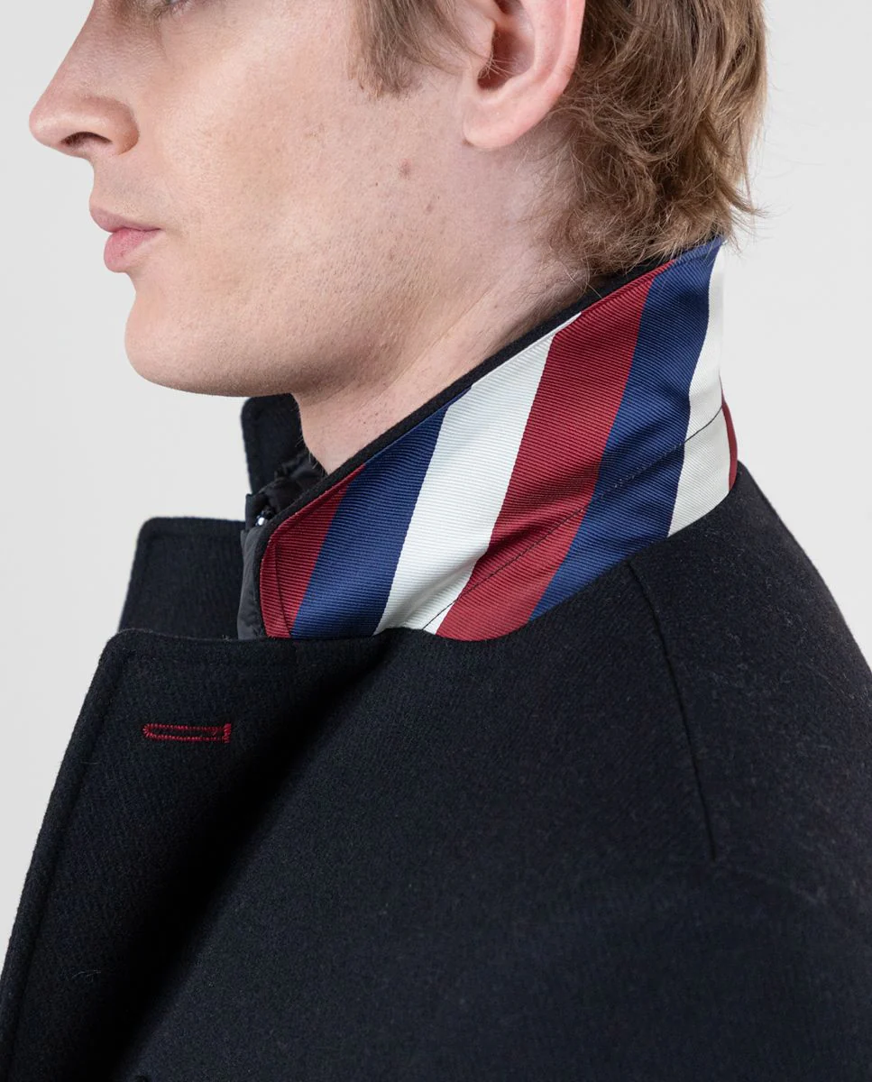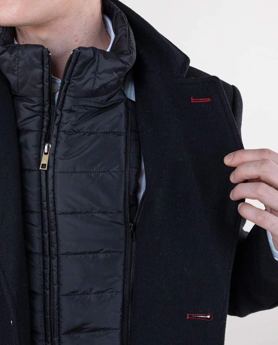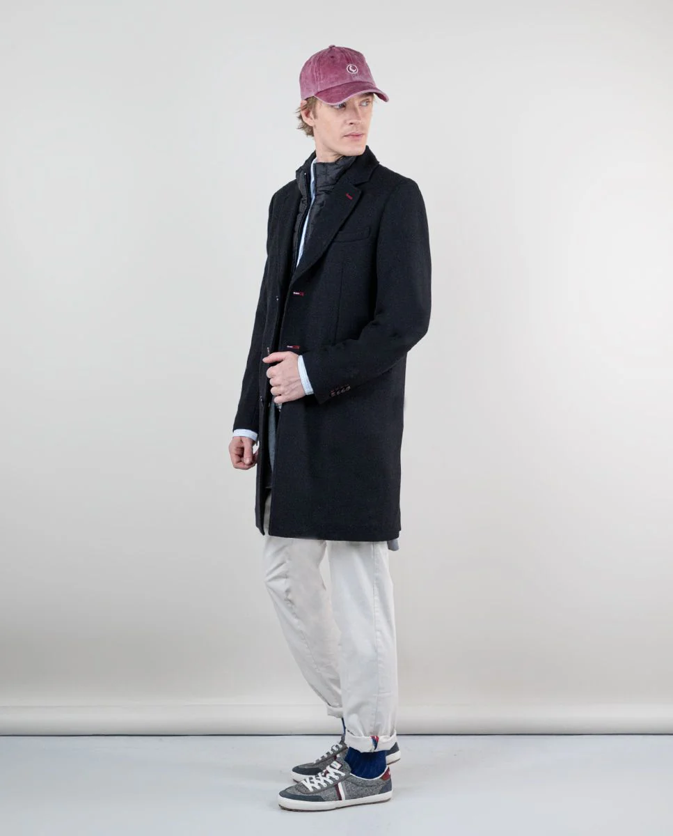 Nuestro abrigo de hombre más emblemático, de paño liso y confeccionado en lana con un acabado repelente al agua. Cuello con solapa de muesca y ojal, cierre mediante tres botones. Un bolsillo insertado a la altura del pecho, tres bolsillos de cartera a la altura de cadera y bolsillos interiores. Tiene puño de cuatro botones y una abertura en la parte posterior. Lleva vista interior con acolchado sostenible y extraible. Forro interior guateado con franjas a contraste. En el bajo cuello lleva tejido corbatero como detalle. Dato interesante: el tejido de este abrigo es transpirable, repelente al agua y la temperatura se mantiene ante cualquier estado del ambiente además de aislar del frío. El relleno acolchado que lleva el abrigo es de Sorona®, un relleno térmico especial fabricado por Dupont que además de retener el calor corporal, es aislante, transpirable y reciclado.