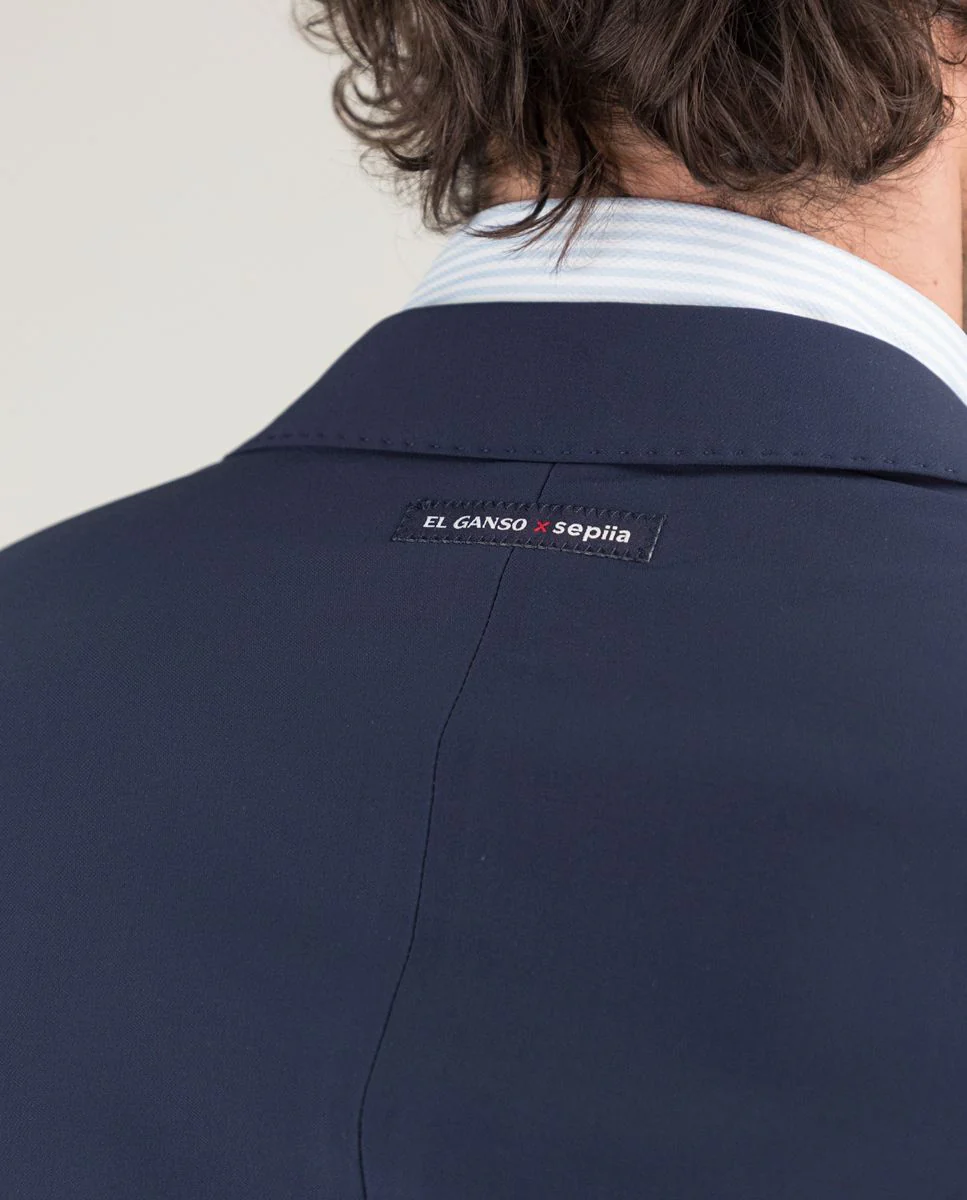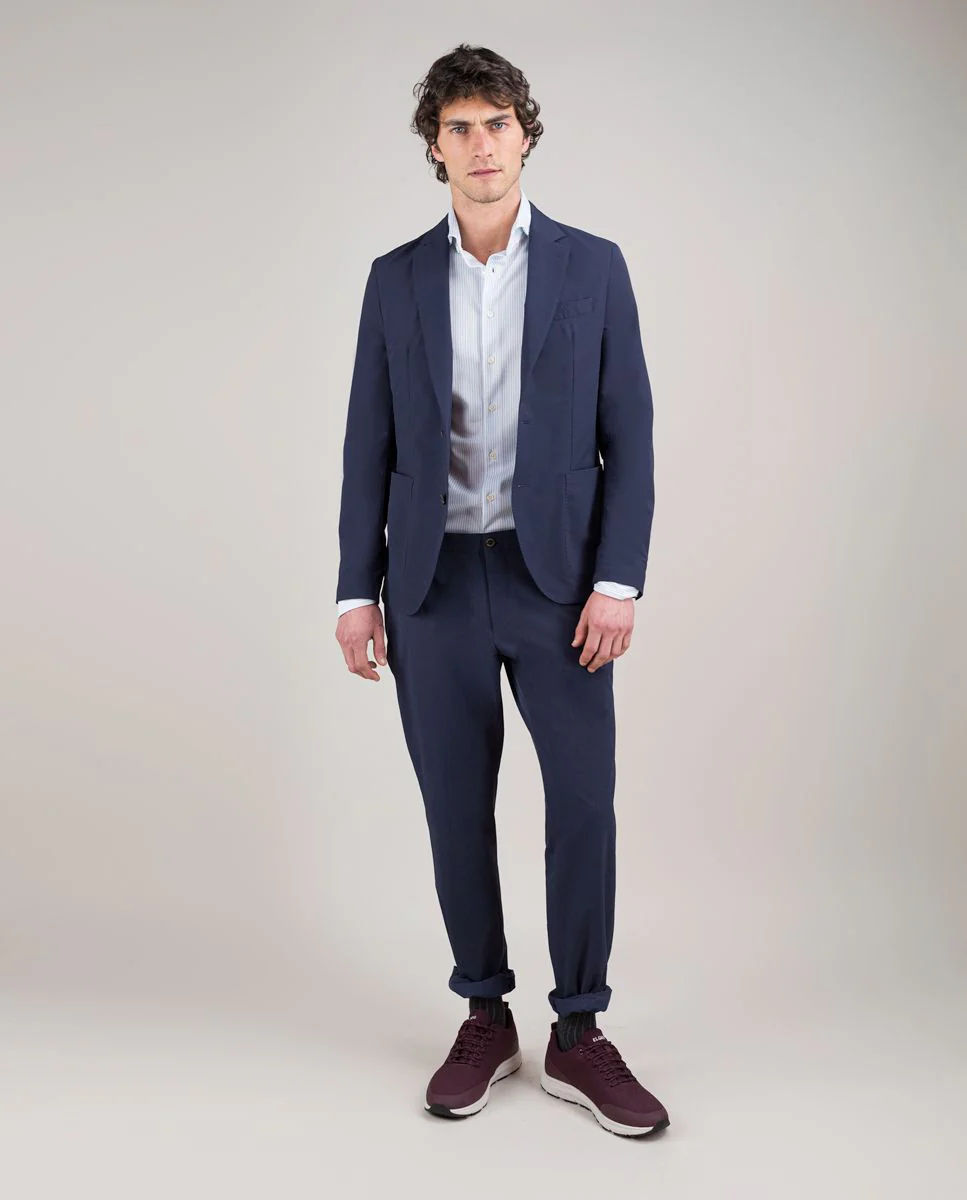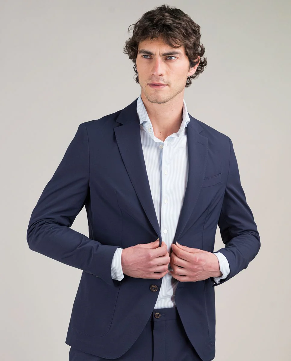 Americana lisa de hombre confeccionado con tecnología de Sepiia en tejido 100% poliéster técnico antibacteriano reciclable. Corte slim fit, cuello con solapa y cierre con botones. Manga larga terminada en puño con botones y bolsillos de solapa y de pecho. Disponible pantalón a juego. Estos tejidos han sido producidos en España y las prendas han sido confeccionadas en Portugal de una forma sostenible.