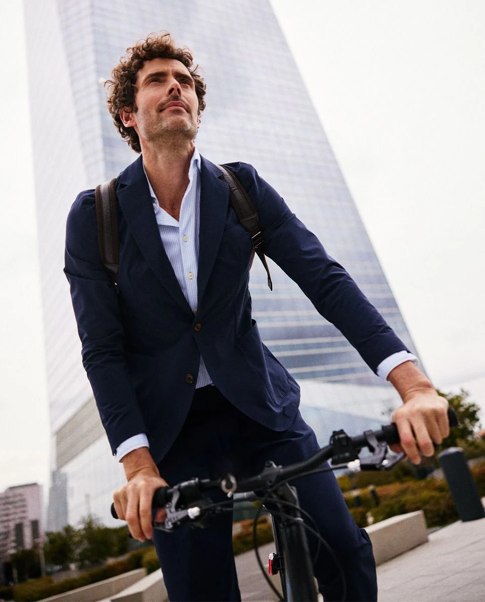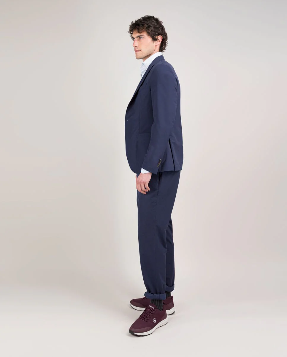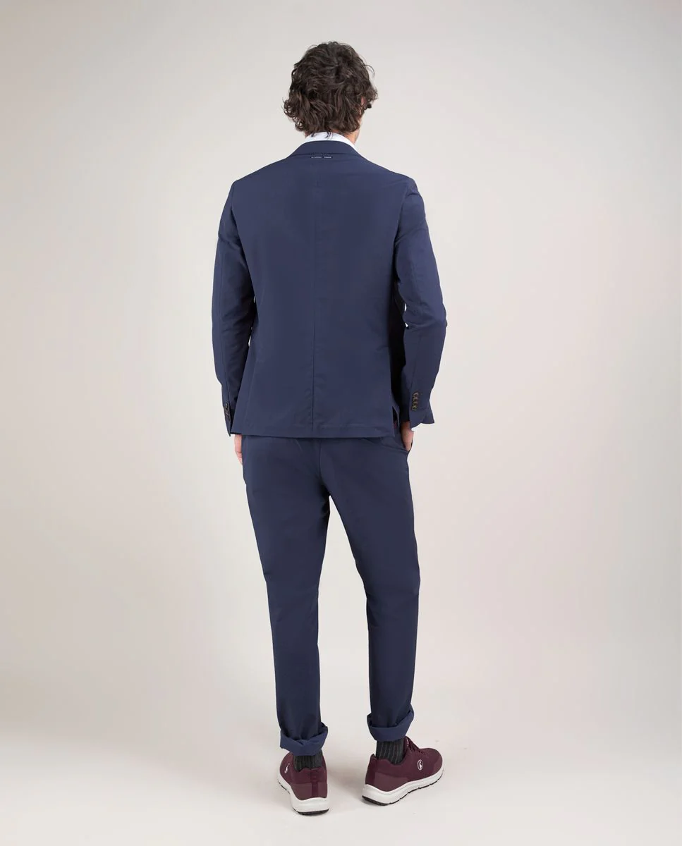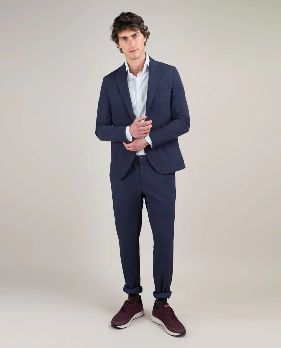Americana lisa de hombre confeccionado con tecnología de Sepiia en tejido 100% poliéster técnico antibacteriano reciclable. Corte slim fit, cuello con solapa y cierre con botones. Manga larga terminada en puño con botones y bolsillos de solapa y de pecho. Disponible pantalón a juego. Estos tejidos han sido producidos en España y las prendas han sido confeccionadas en Portugal de una forma sostenible.