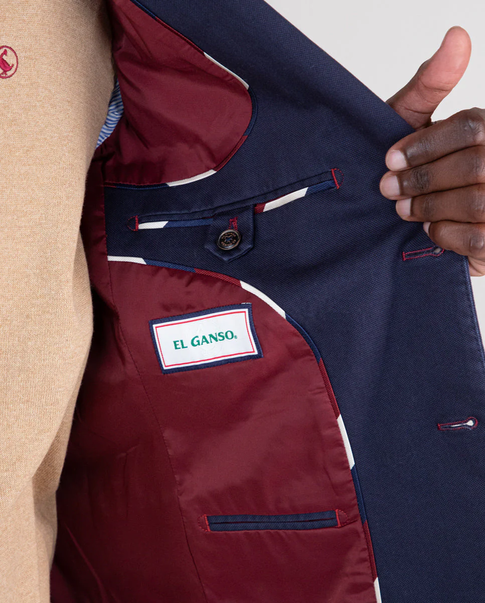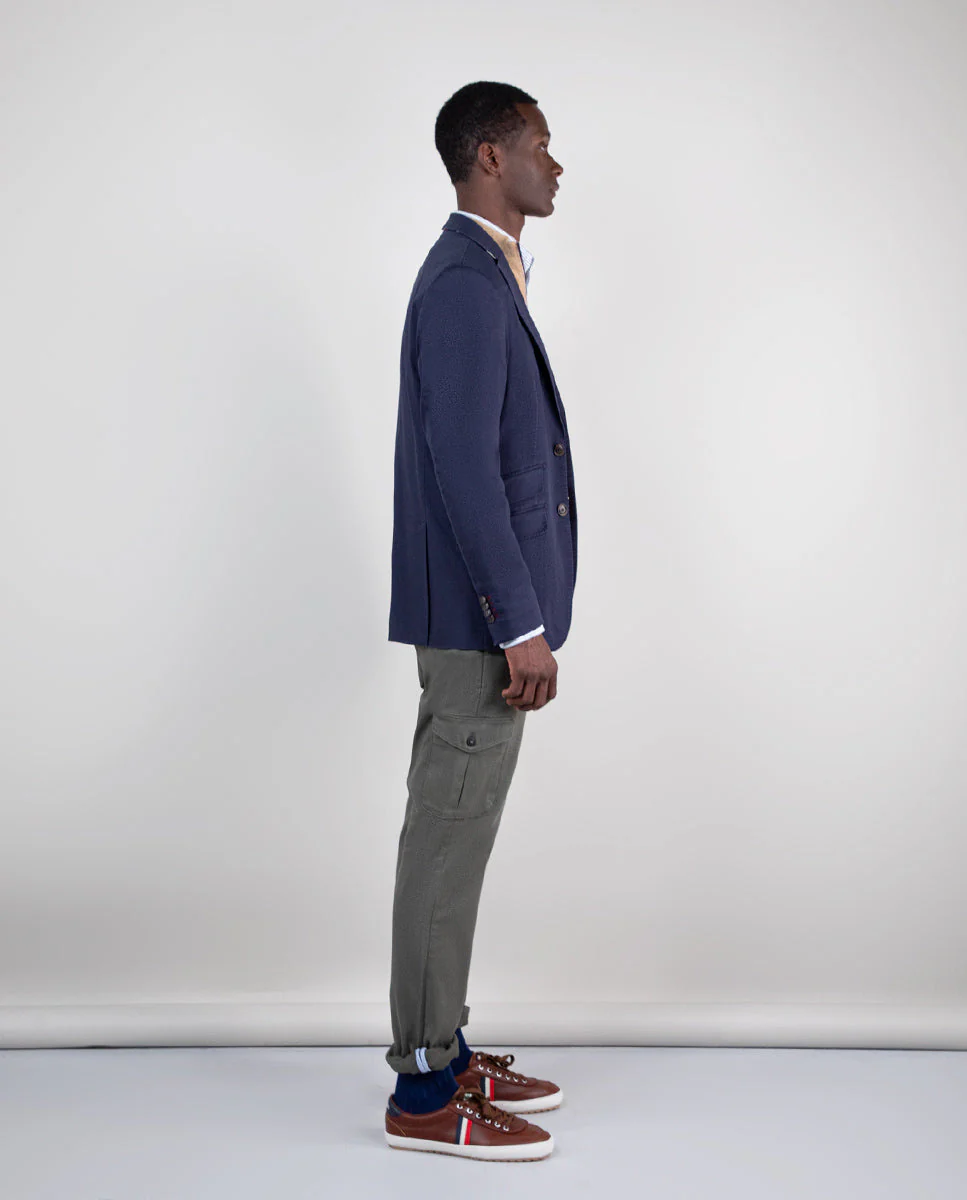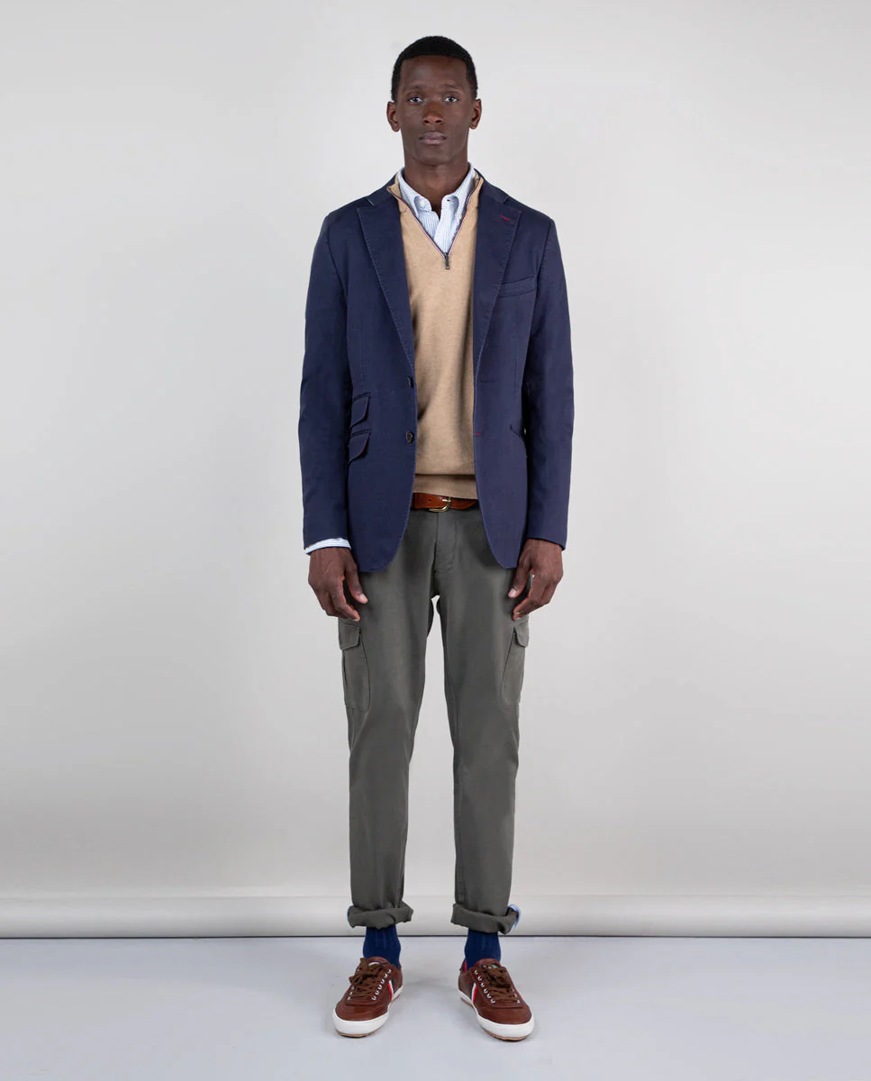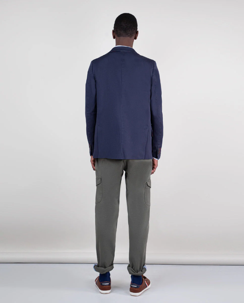 Americana lisa de hombre confeccionada con tejido compuesto de 98% algodón y 2% elastán, logrando un fit mas cómodo. Para conseguir ese color desgastado, la prenda ha sido tintada con acabado sulfuroso. Corte slim fit, cuello con solapa y cierre con botones. Manga larga terminada en puño con botones y bolsillos de solapa y de pecho. Cuenta con detalles en tejido rayas en bolsillos interiores y bajo cuello.