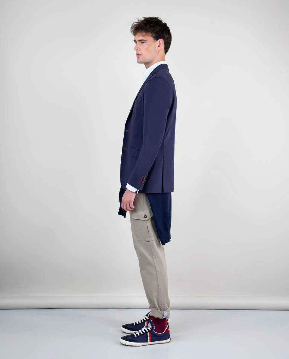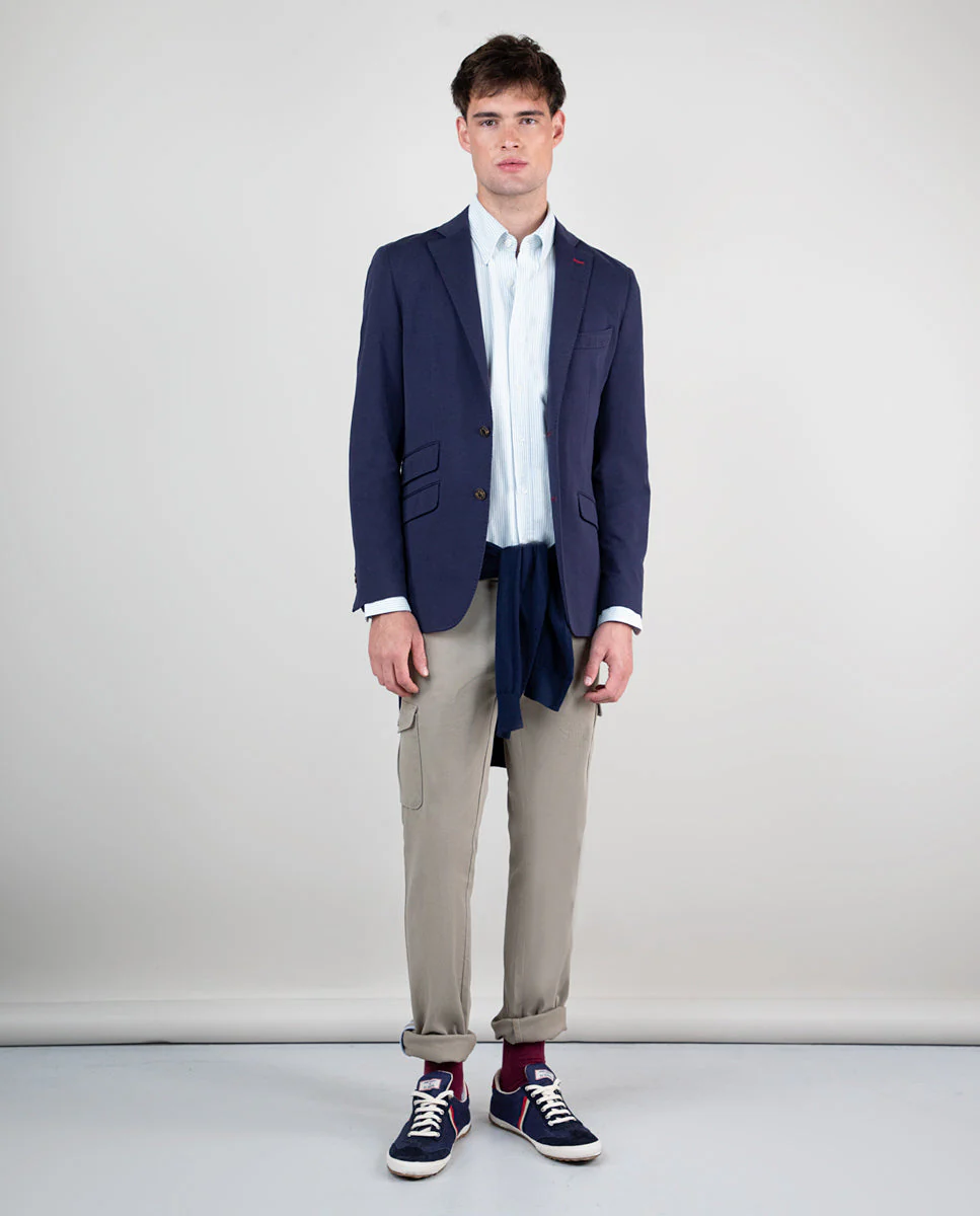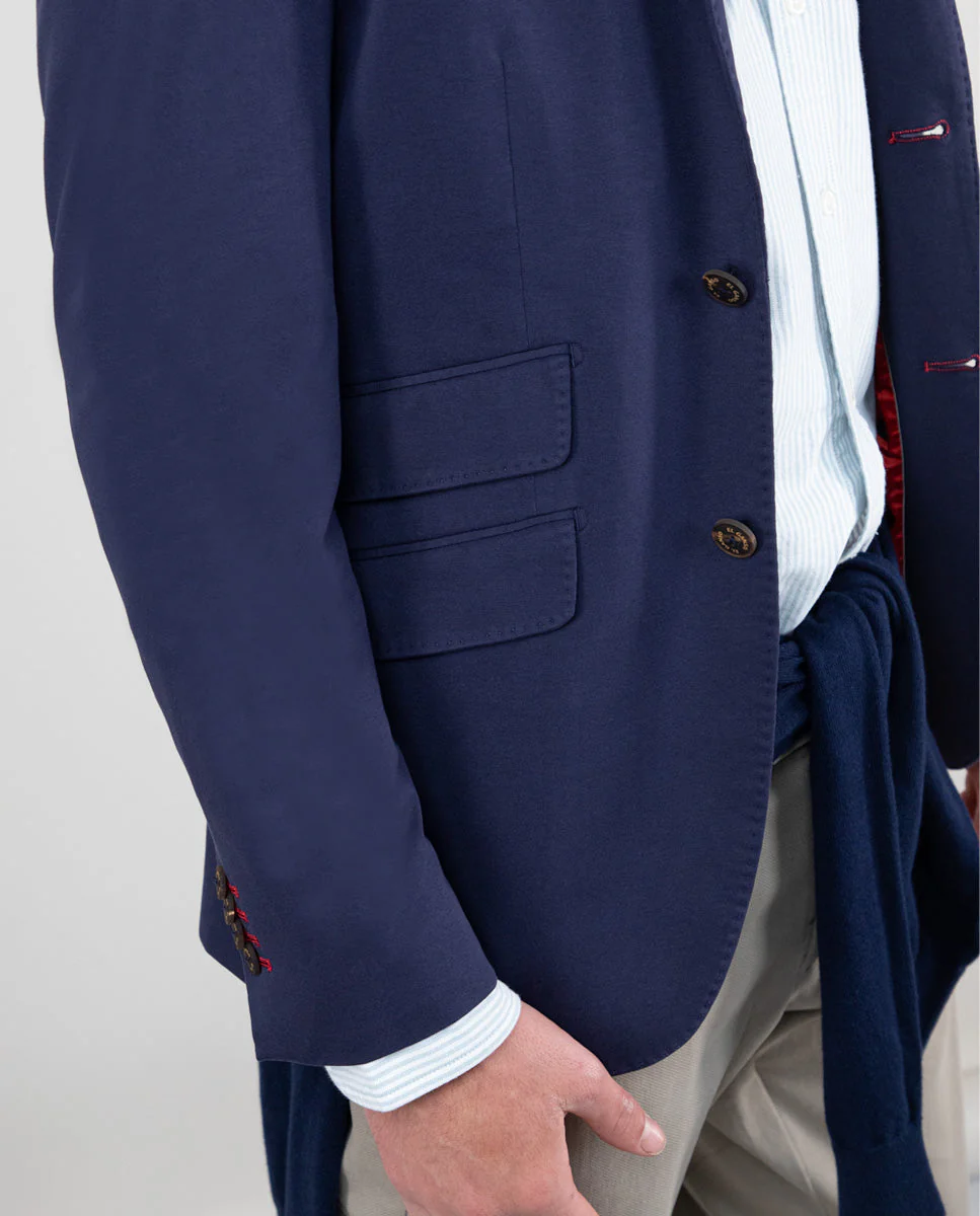 Americana liso gris confeccionada en 100% lana del fabricante italiano Marzotto. Corte Slim Fit, cuello con solapas de muesca y cierre con botones. Bolsillos de solapa en cadera, un bolsillo insertado a la altura del pecho. Pu帽o de 4 botones. Dos aberturas en la parte posterior. Detalle de tejido corbatero de rayas en el interior del cuello. Hecha en Portugal.