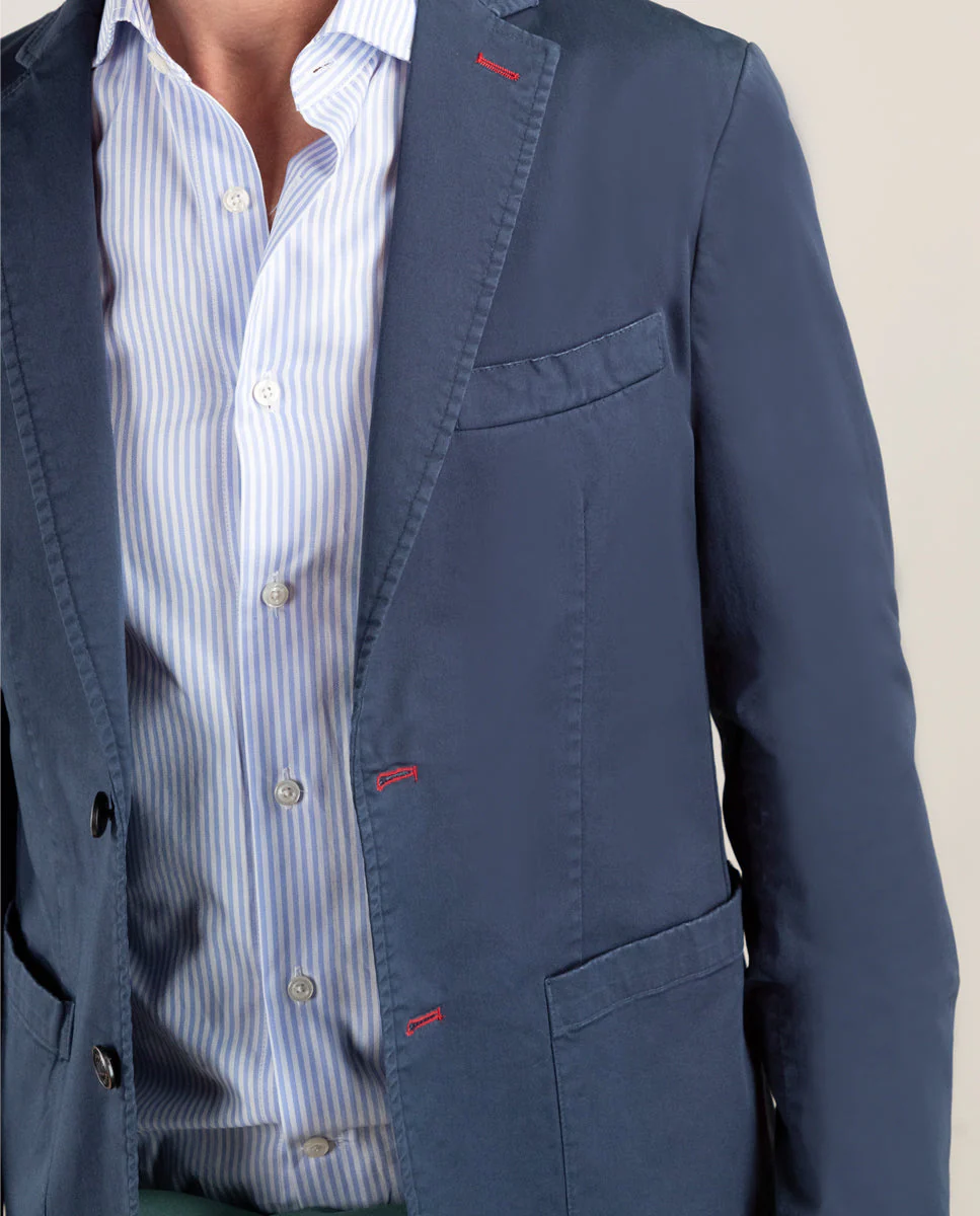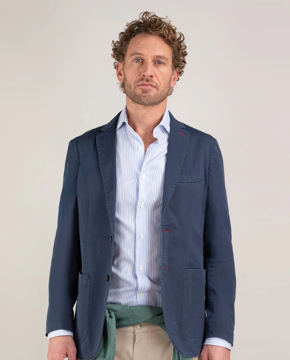 Americana de hombre confeccionada en algodón con tejido Garment Dyed. Efecto Lavado con un corte slim fit con solapa de pico, cierre con dos botones. Bolsillos frontales de vivo en pecho y de solapa en cadera.