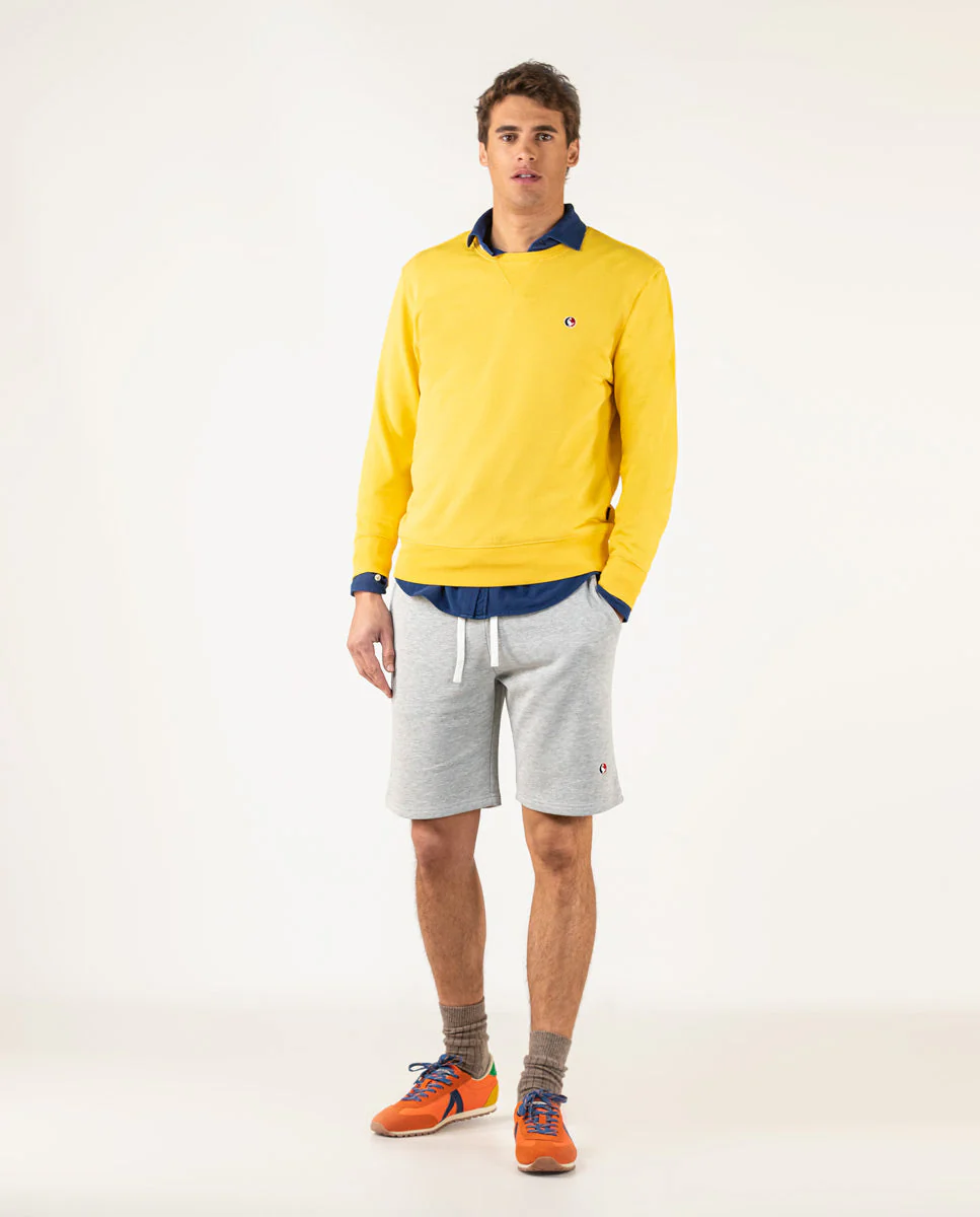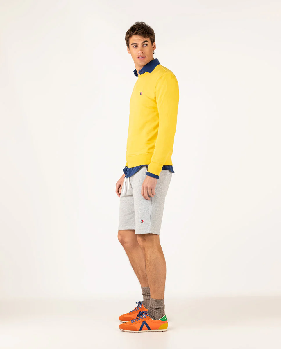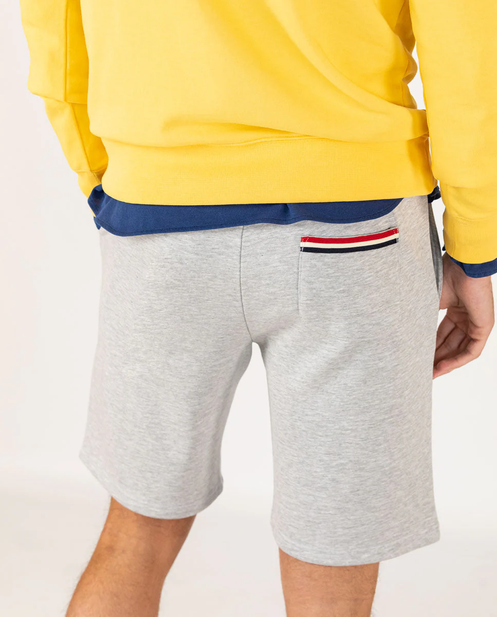 Bermuda jogger de hombre lisa confeccionada en algodón 80% BCI y 20% poliéster reciclado de cintura elástica regulable con cordón. Tiene bolsillos laterales y detalle de bolsillo plastrón en espalda. Lleva como detalles nuestra clásica cinta de bandera en el bolsillo trasero, topes decorativos en el cordón y nuestro logo icónico bordado en el bajo delantero.