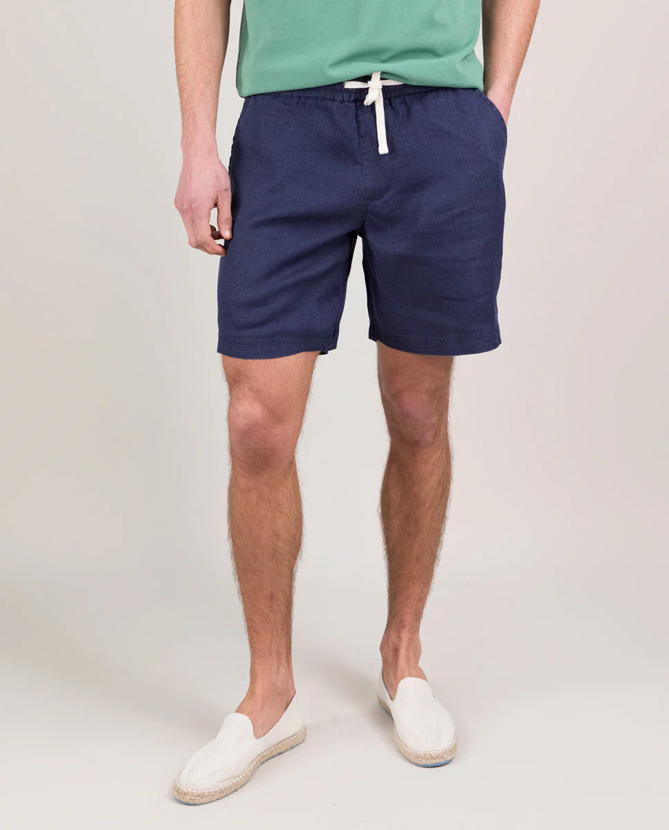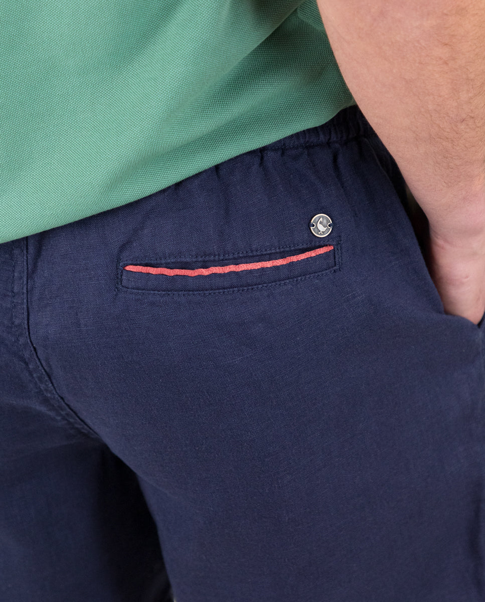 Bermuda hombre liso confeccionado en lino. Corte regular fit con cierre elástico. Lleva cordones en la cintura. Bolsillos laterales y bolsillos de parche traseros. Detalles en bolsillo. Aporta un carácter informal y relajado, junto a una gran comodidad.