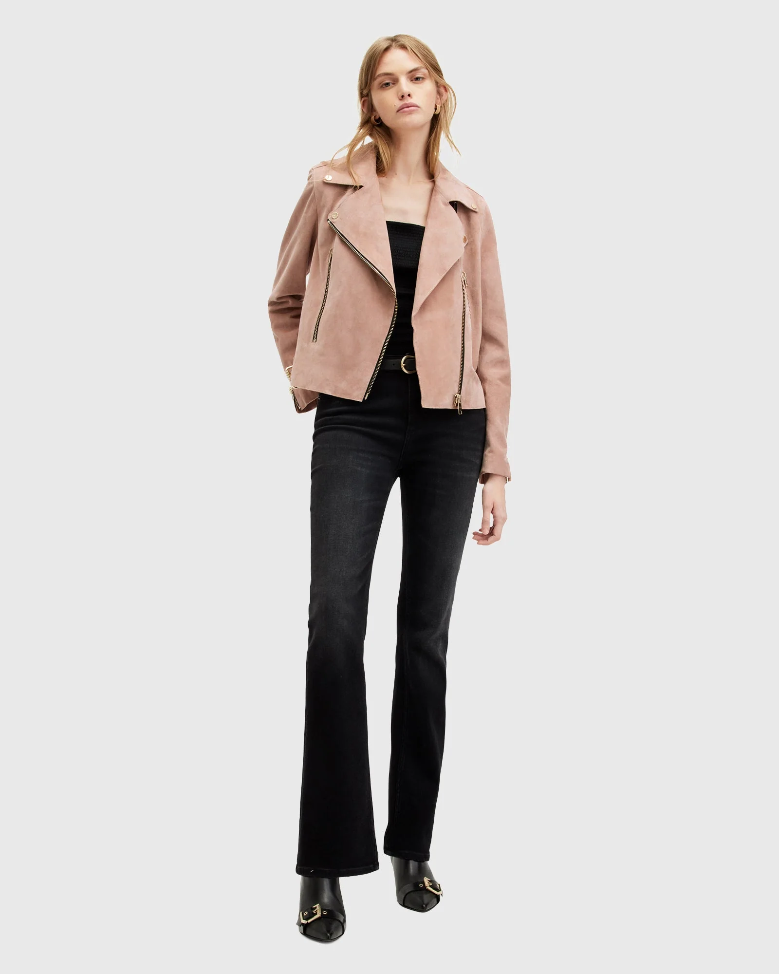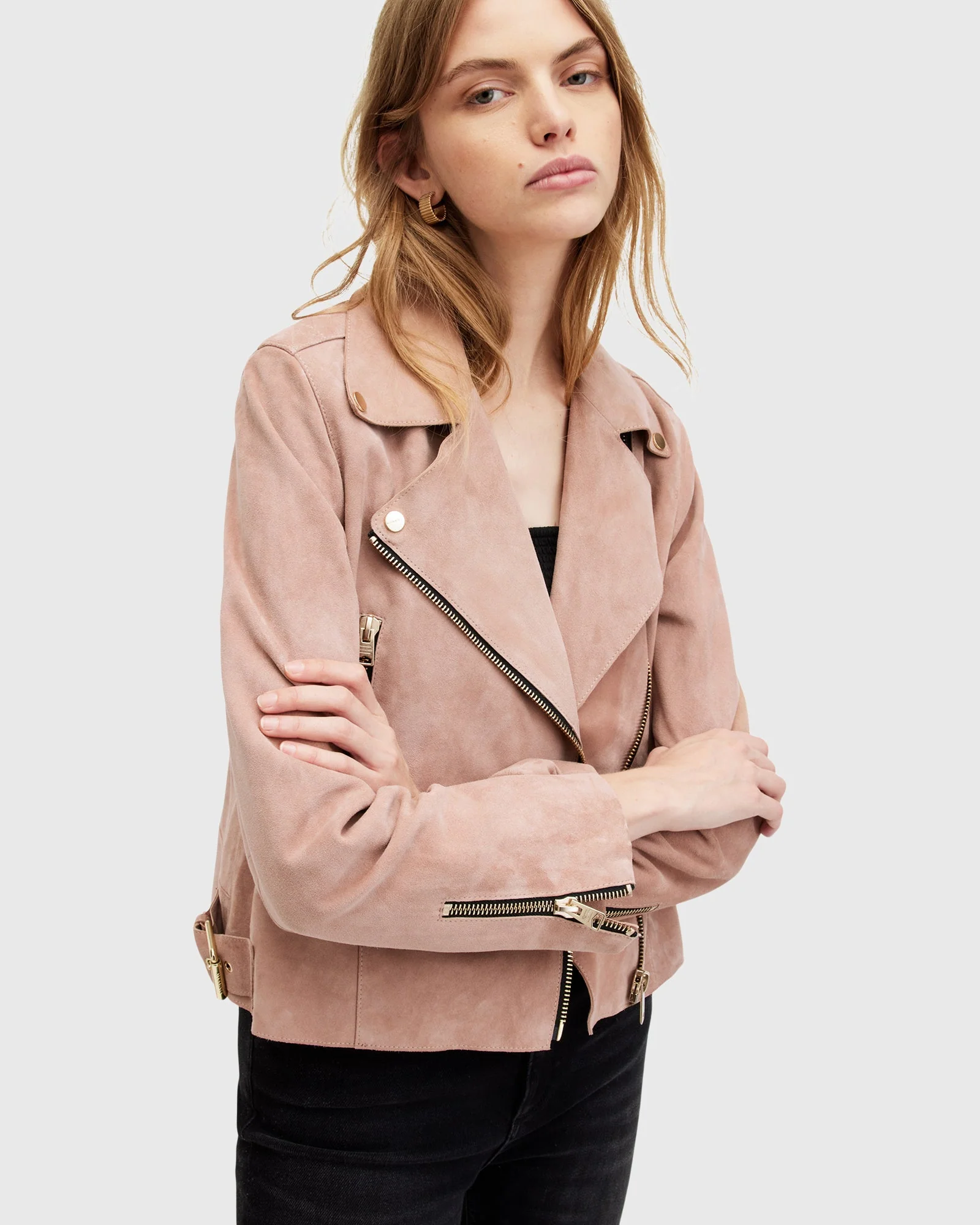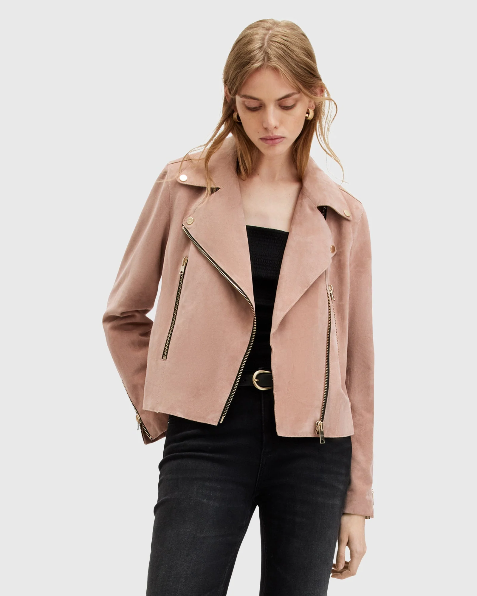 Chamarra de piel Beale color Rosa Brisa estilo Biker para mujer, marca AllSaints.
