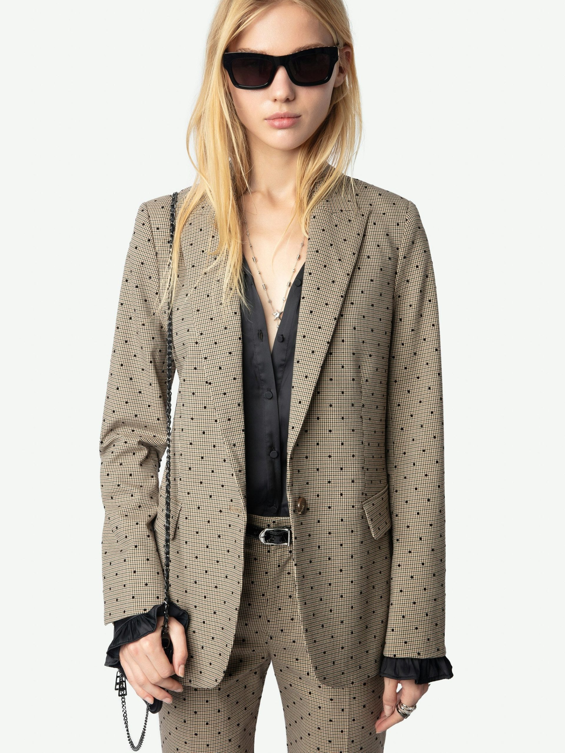 Blazer recto estructurado con cuadros de fantasía y cierre de botones.