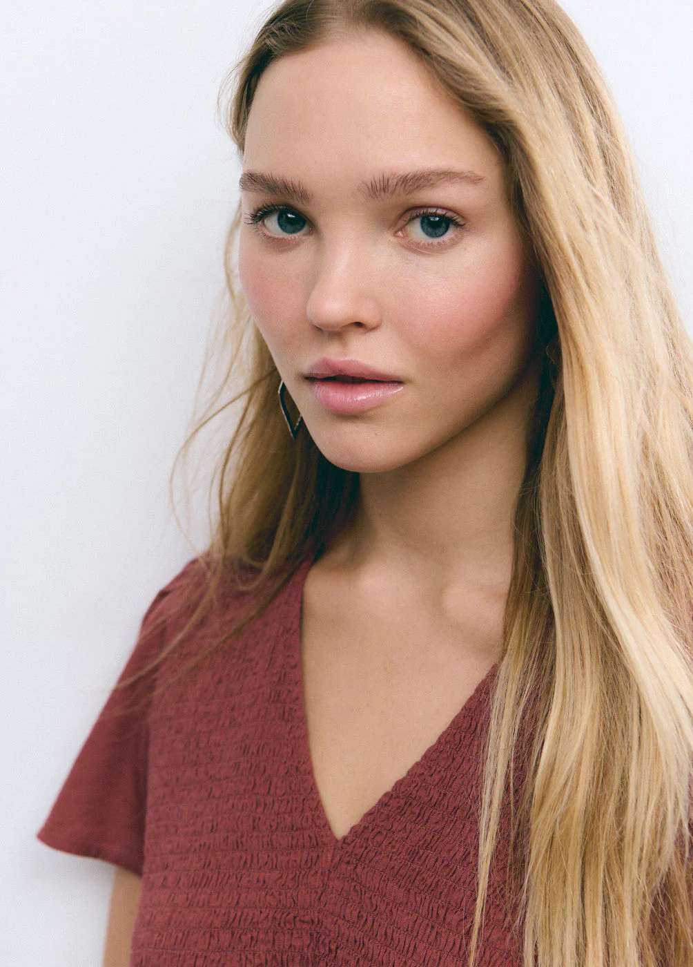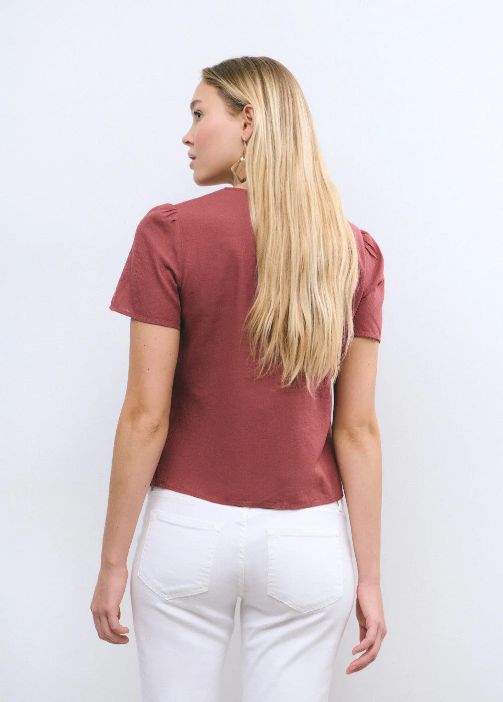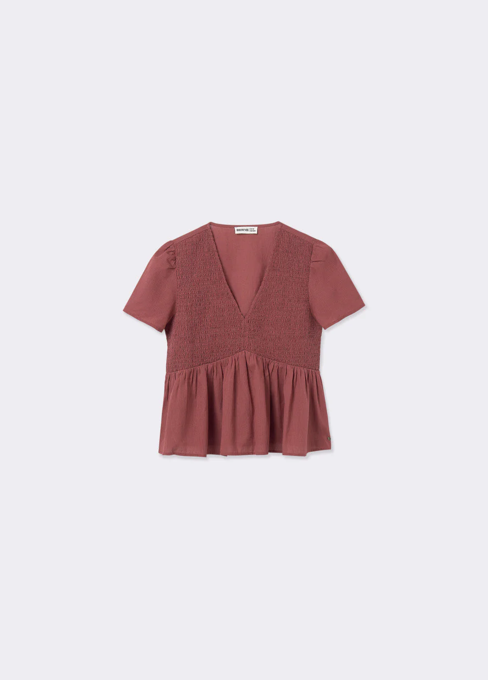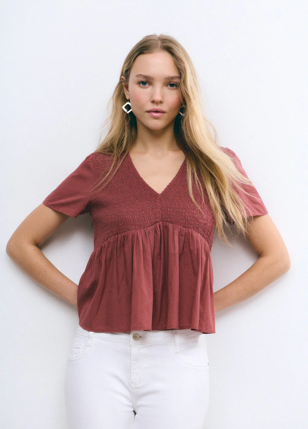 Blusa de algodón de manga corta, cuello de pico y smock en la parte superior.