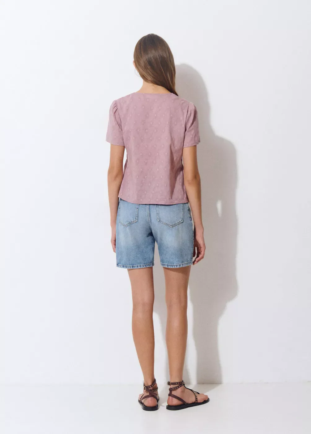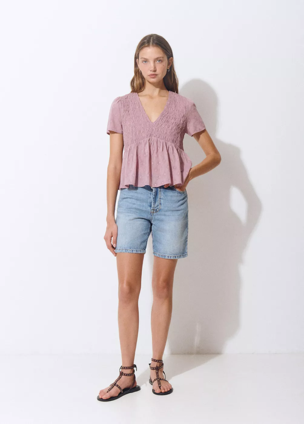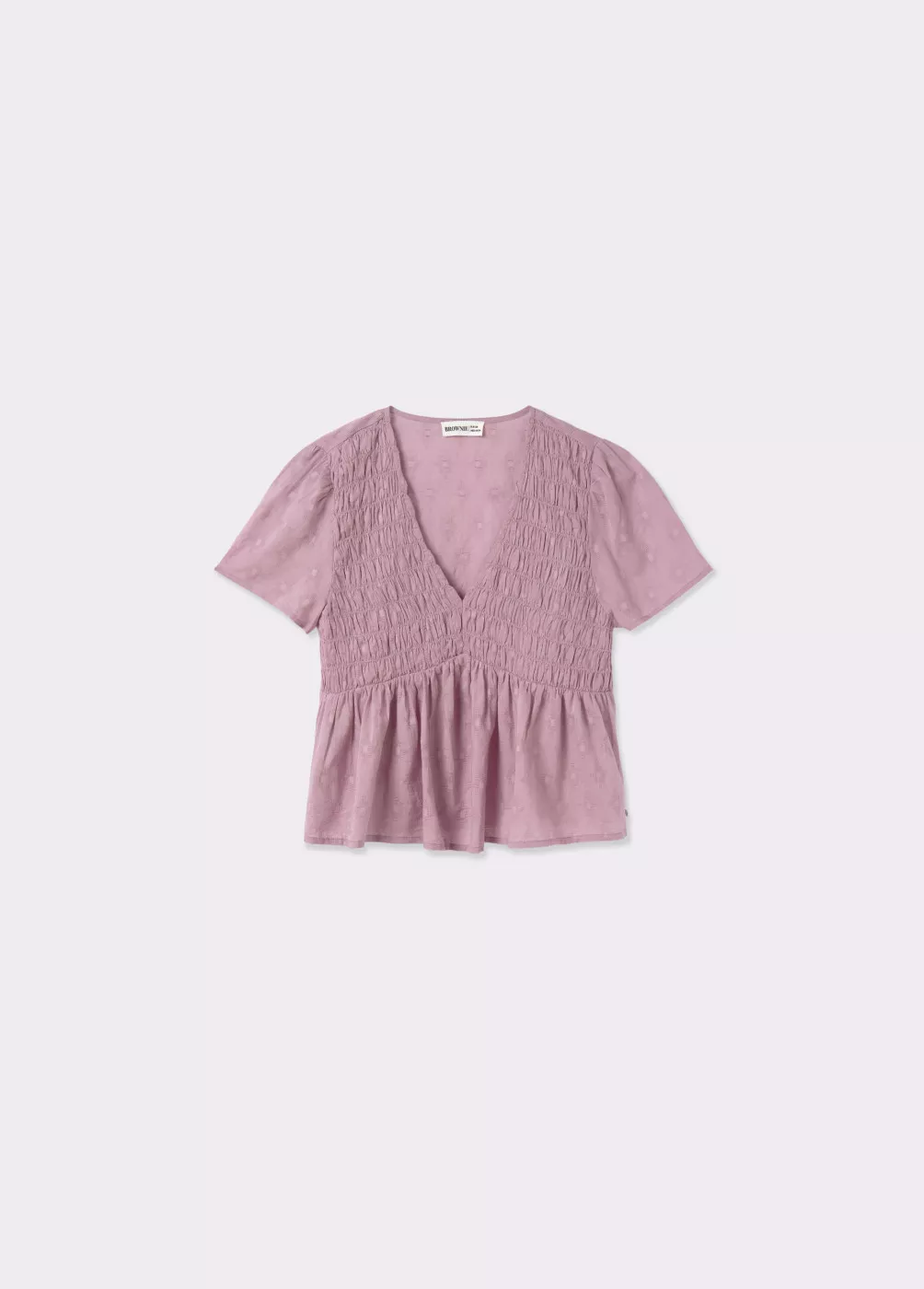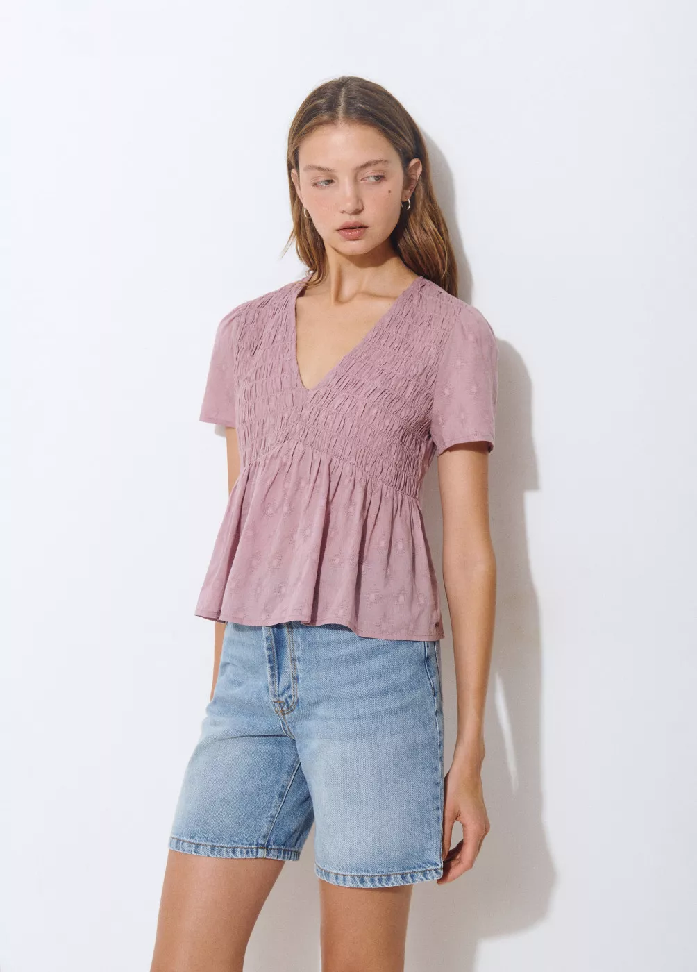 Blusa lisa de algodón de manga corta, cuello de pico y smock en la parte superior.