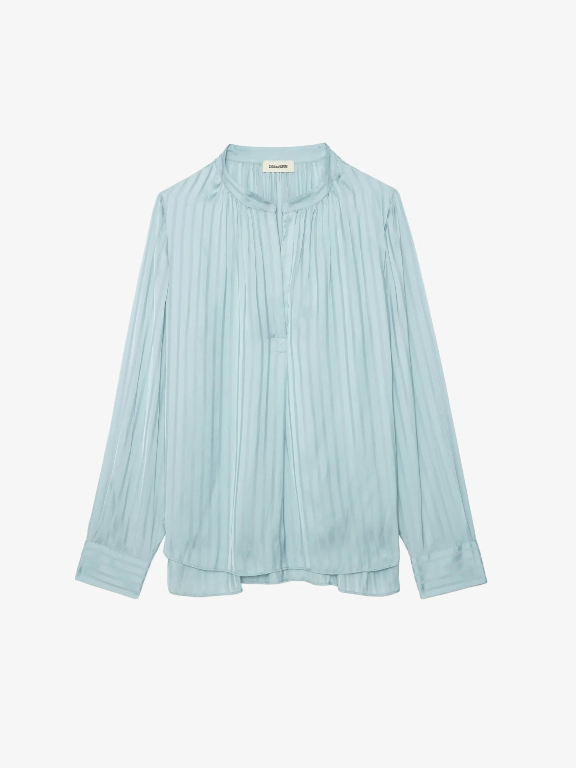 Blusa de satén jacquard a rayas con cuello abierto, mangas largas y detalles fruncidos.