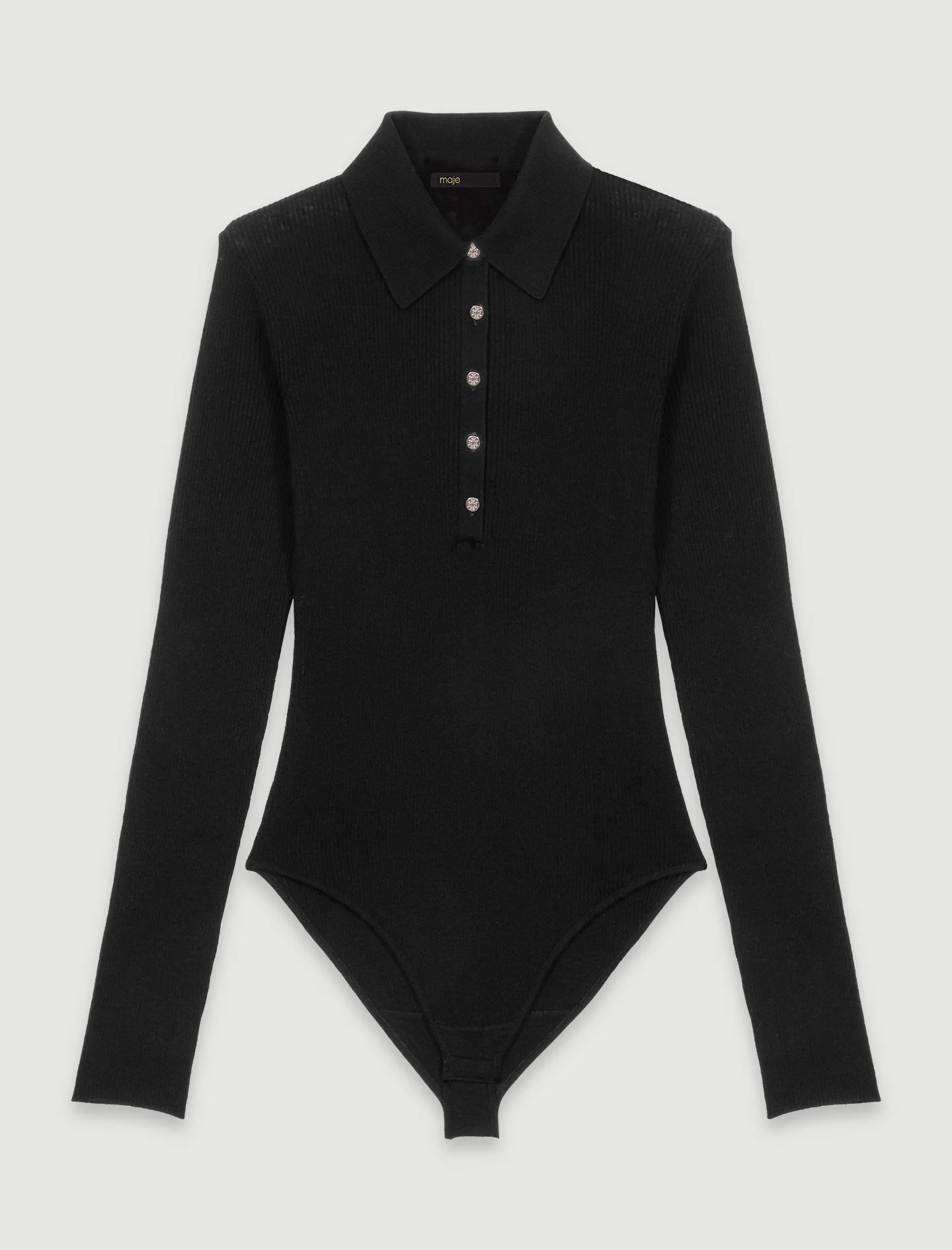 Adornado con un discreto detalle Clover en la espalda, este bodi de suave punto de canalé se ajusta perfectamente a la figura para crear un efecto segunda piel. Con cuello camisero y mangas largas, presenta un cierre de botones y una tira a la altura de la braguita.