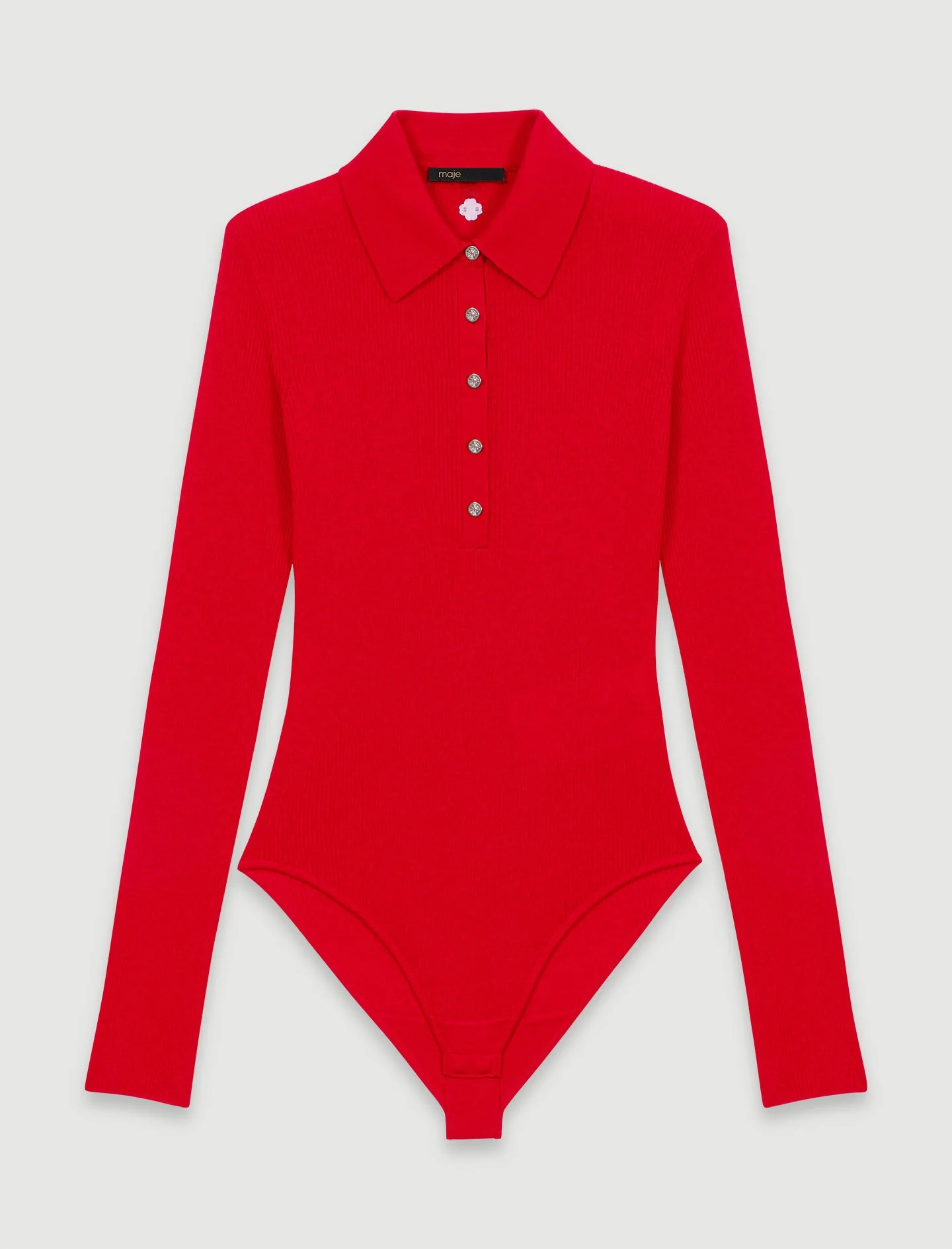 Adornado con un discreto detalle Clover en la espalda, este bodi de suave punto de canalé se ajusta perfectamente a la figura para crear un efecto segunda piel. Con cuello camisero y mangas largas, presenta un cierre de botones y una tira a la altura de la braguita.
