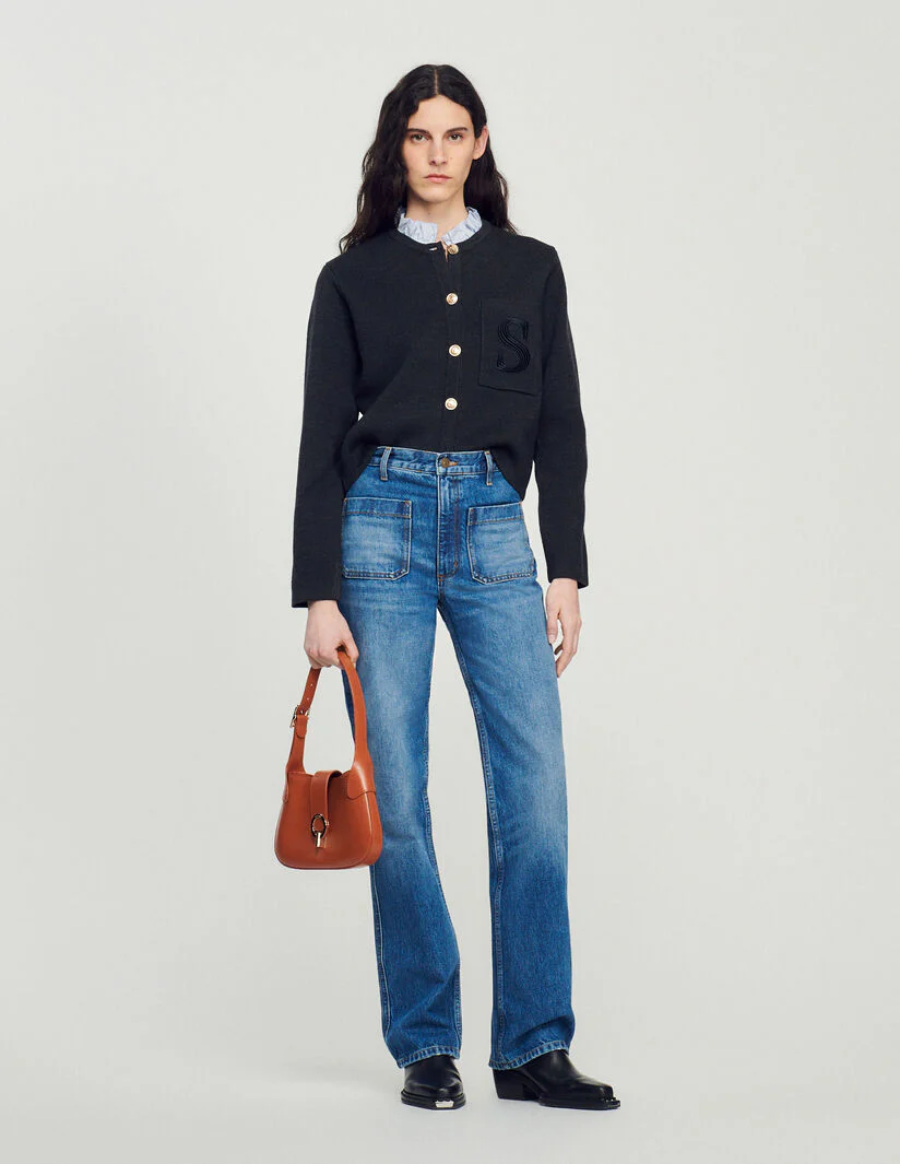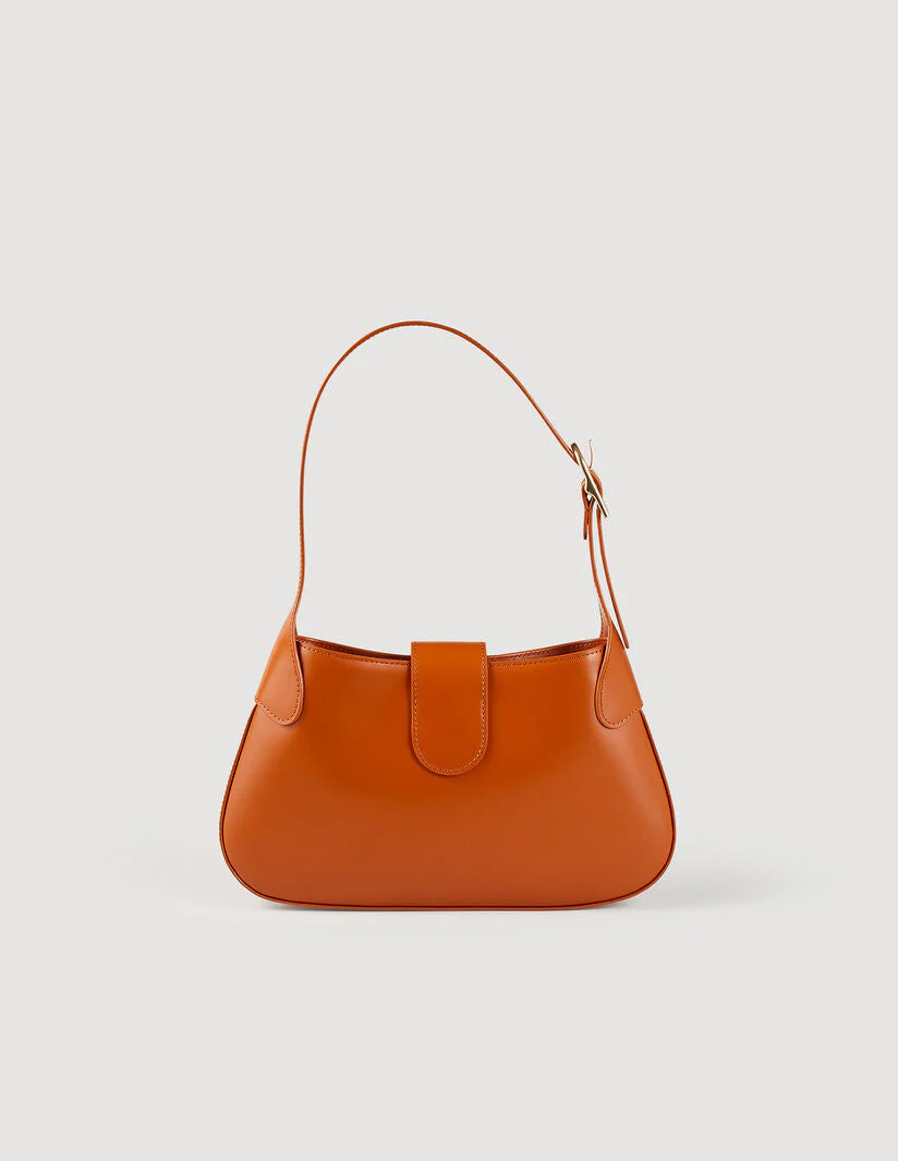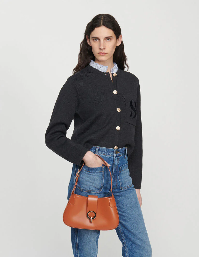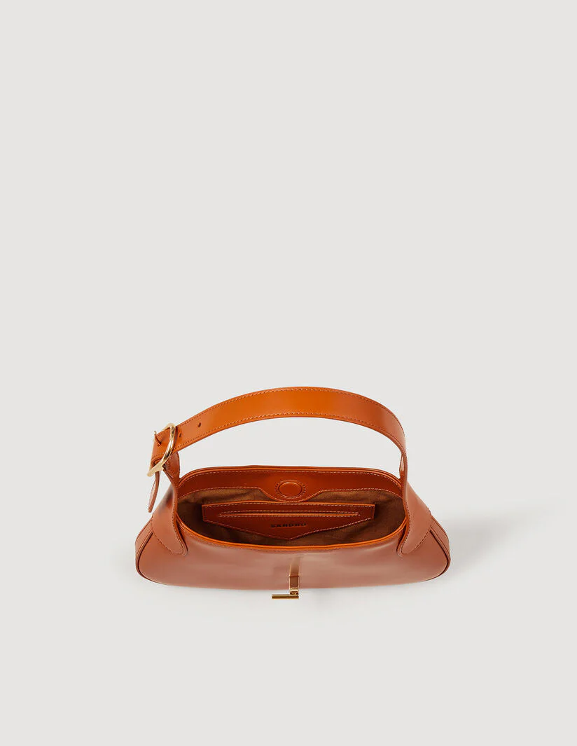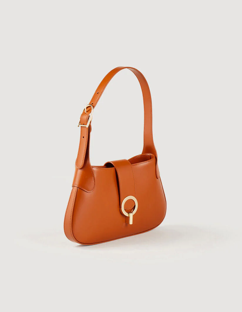 Bolso para llevar al hombro de piel lisa, con un cierre con firma y un asa de aro metálica.