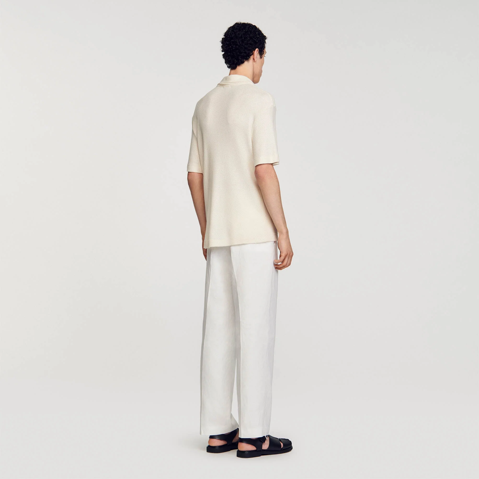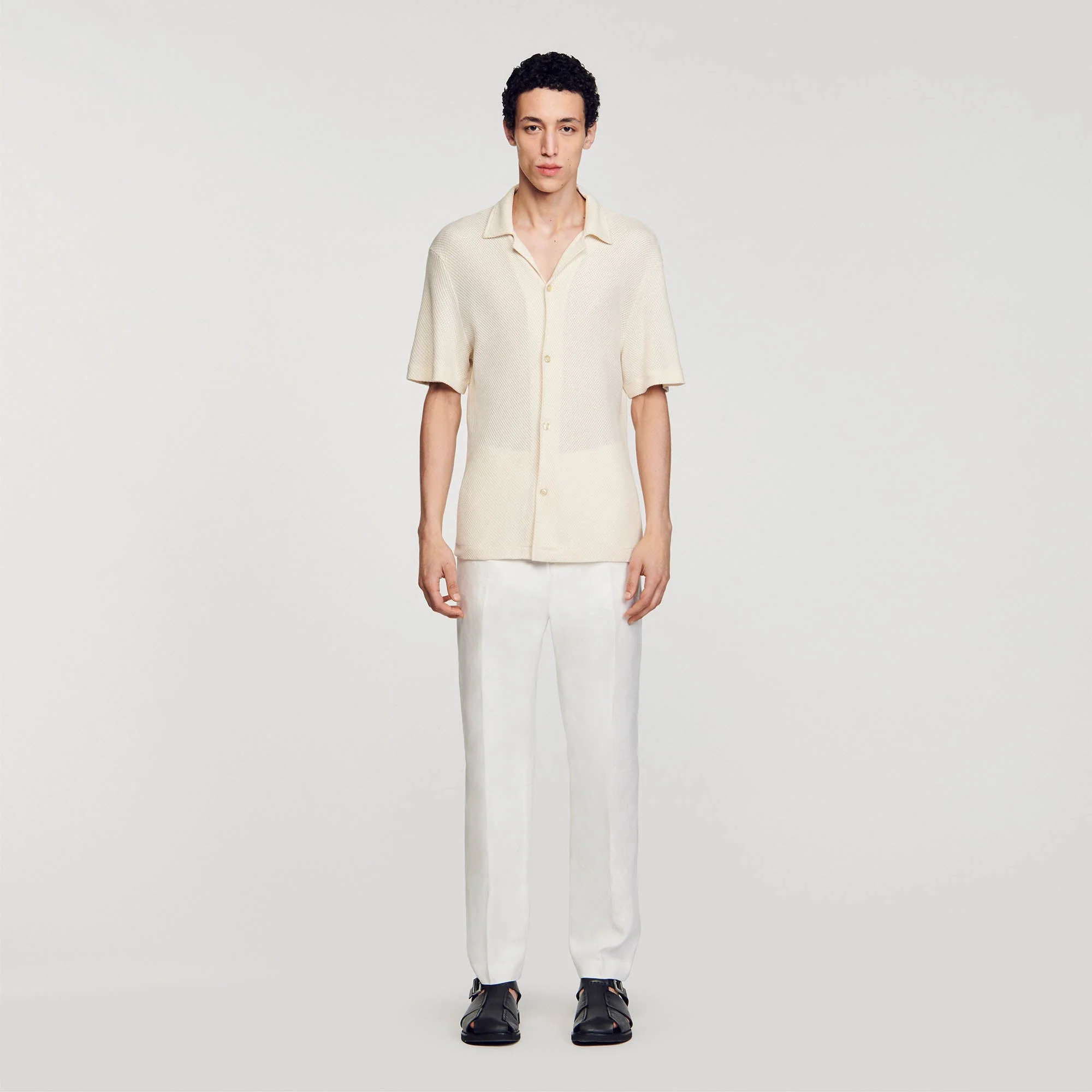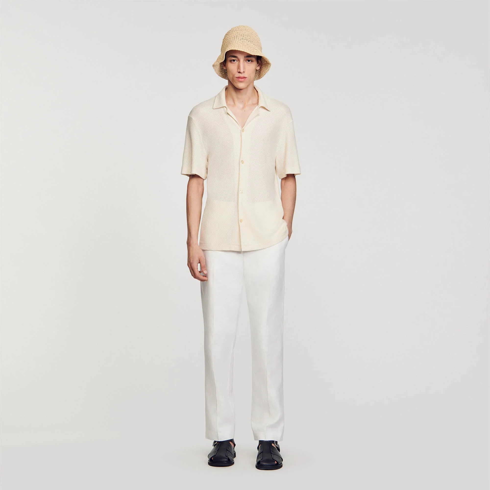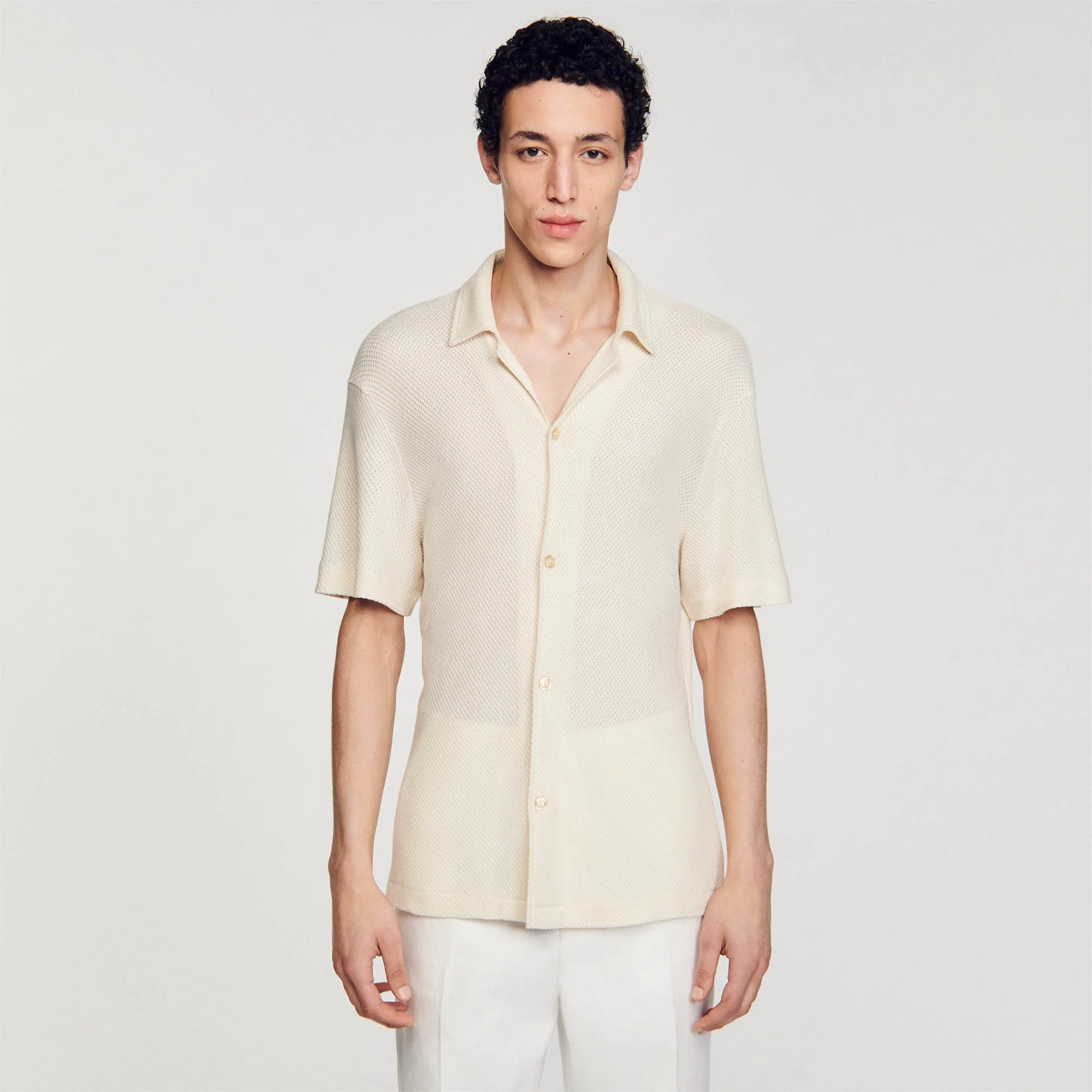 Camisa de punto calado con cuello italiano, manga corta y cierre de botones.
