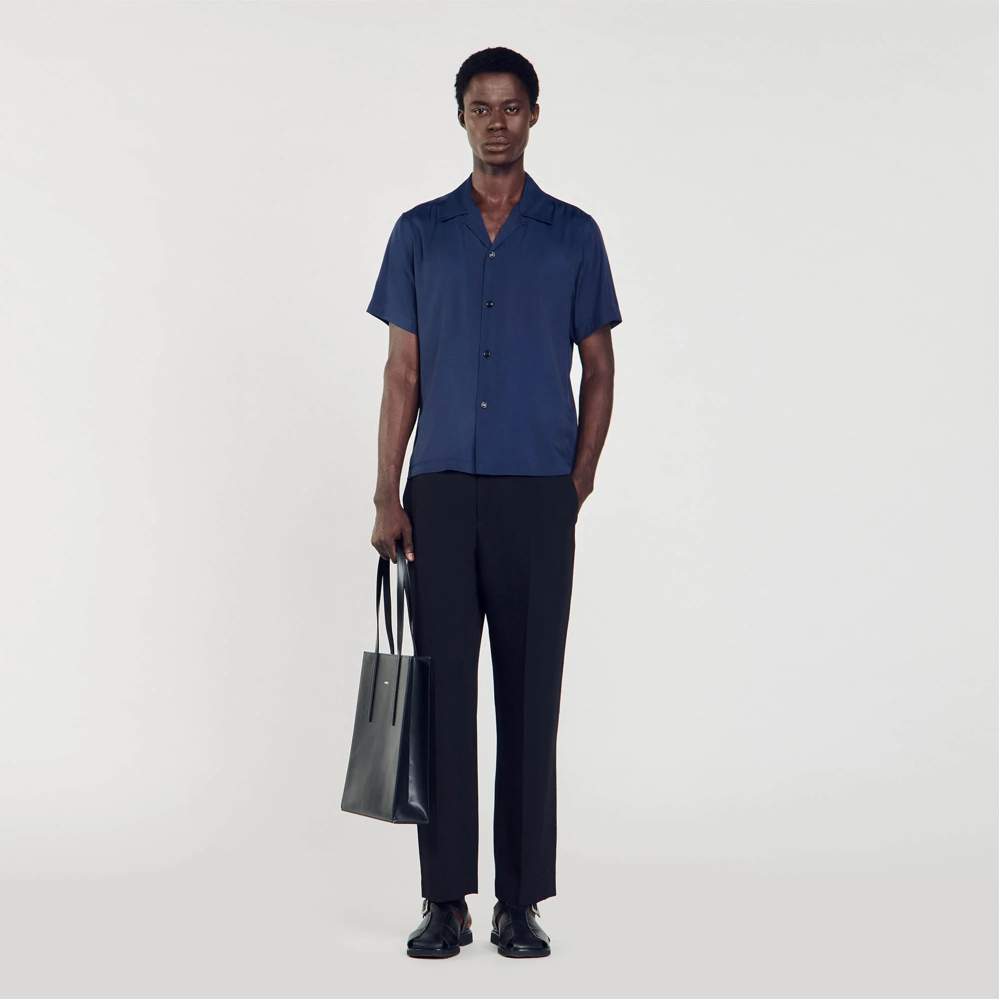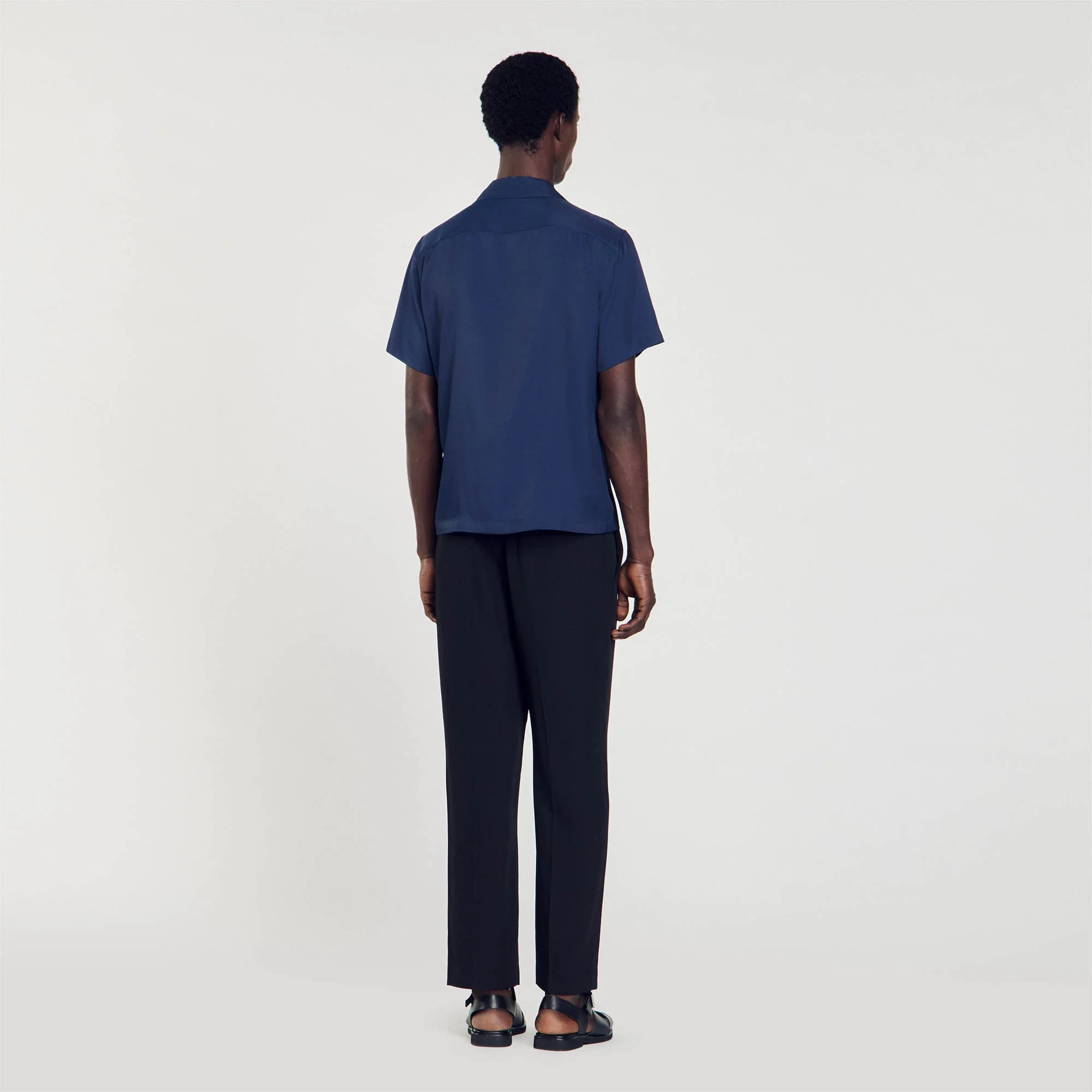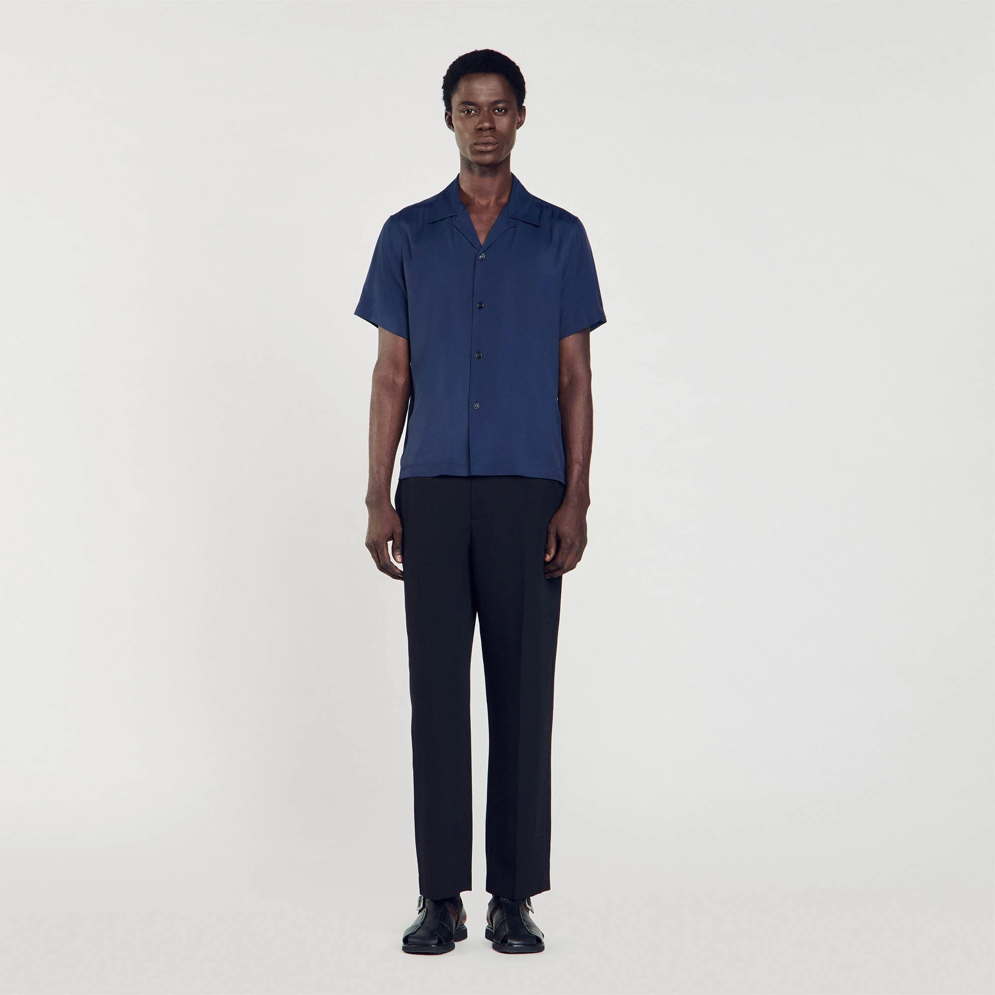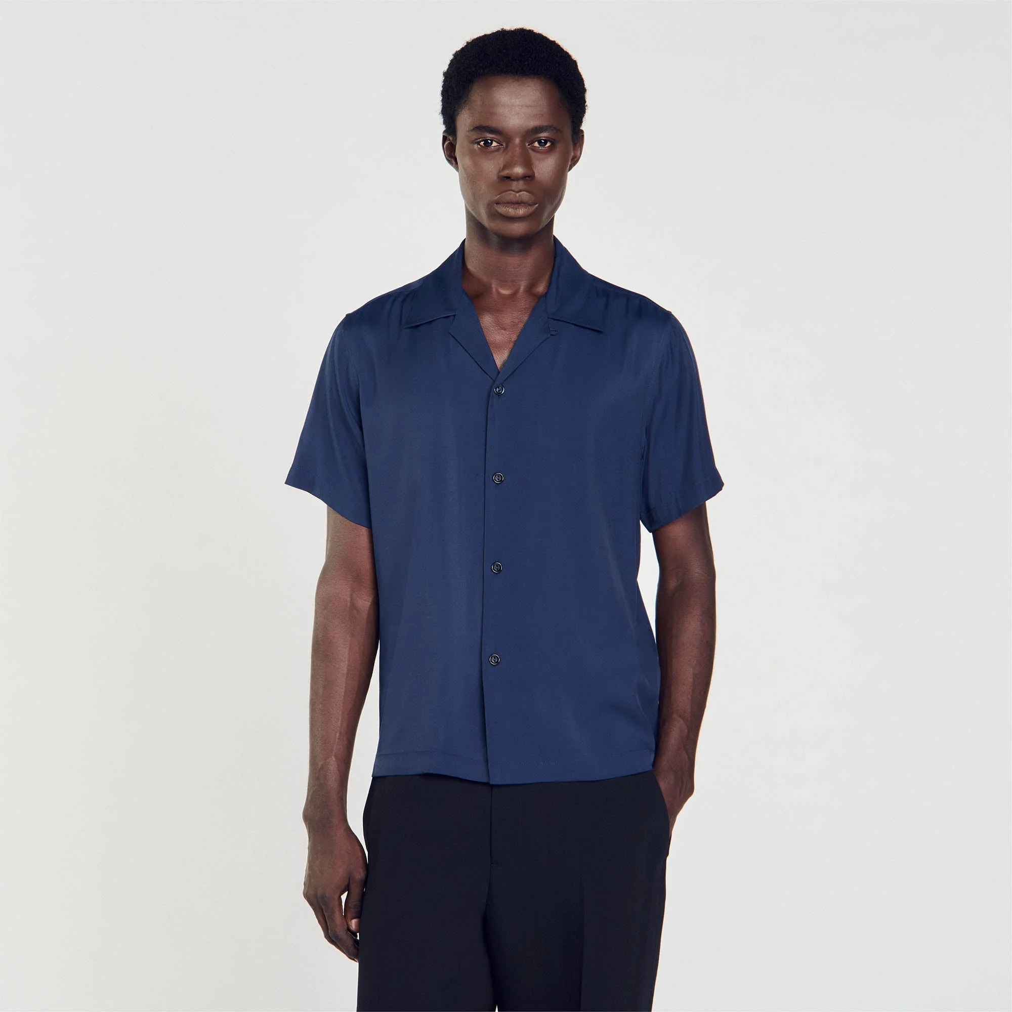 Camisa de manga corta con cuello italiano y cierre de botones.
