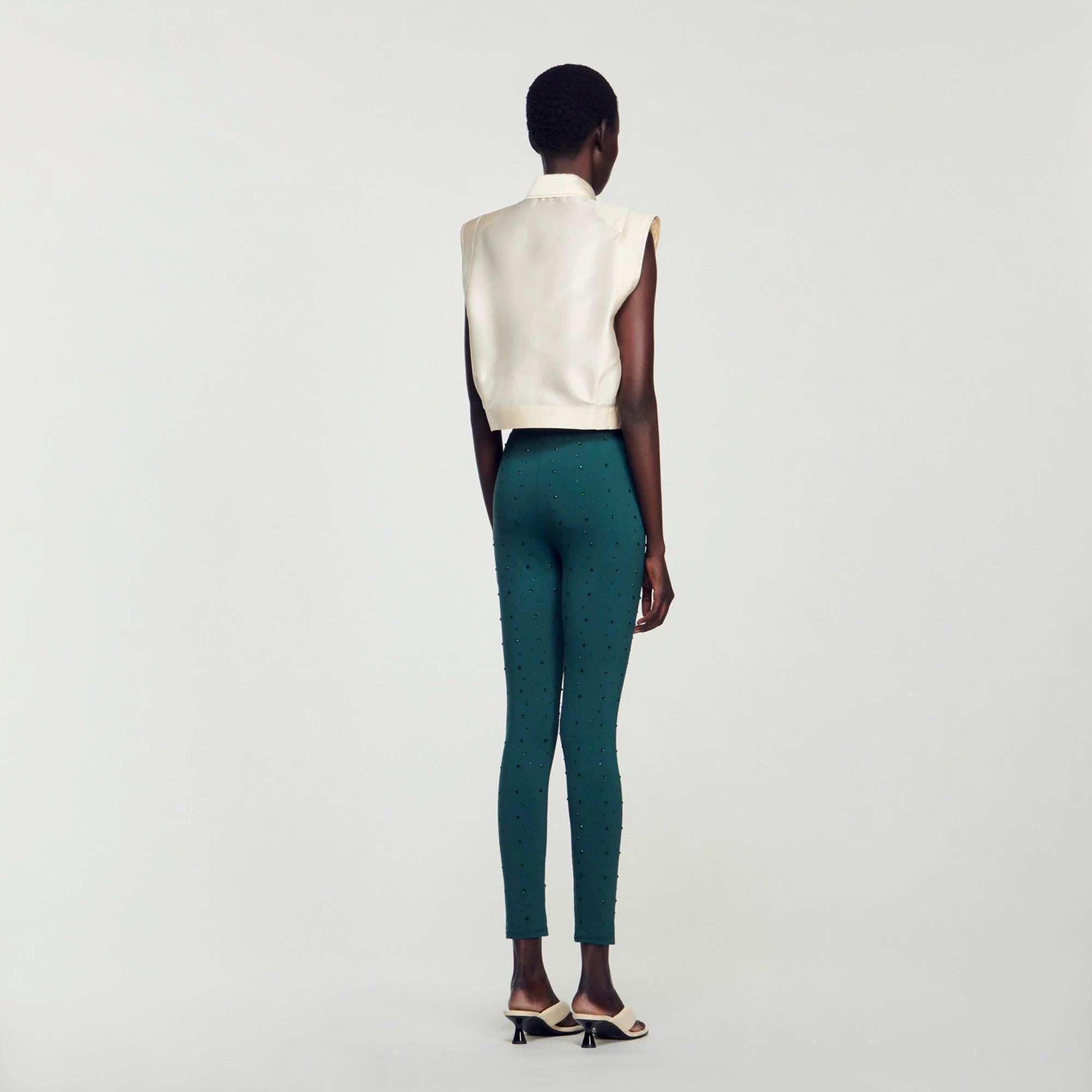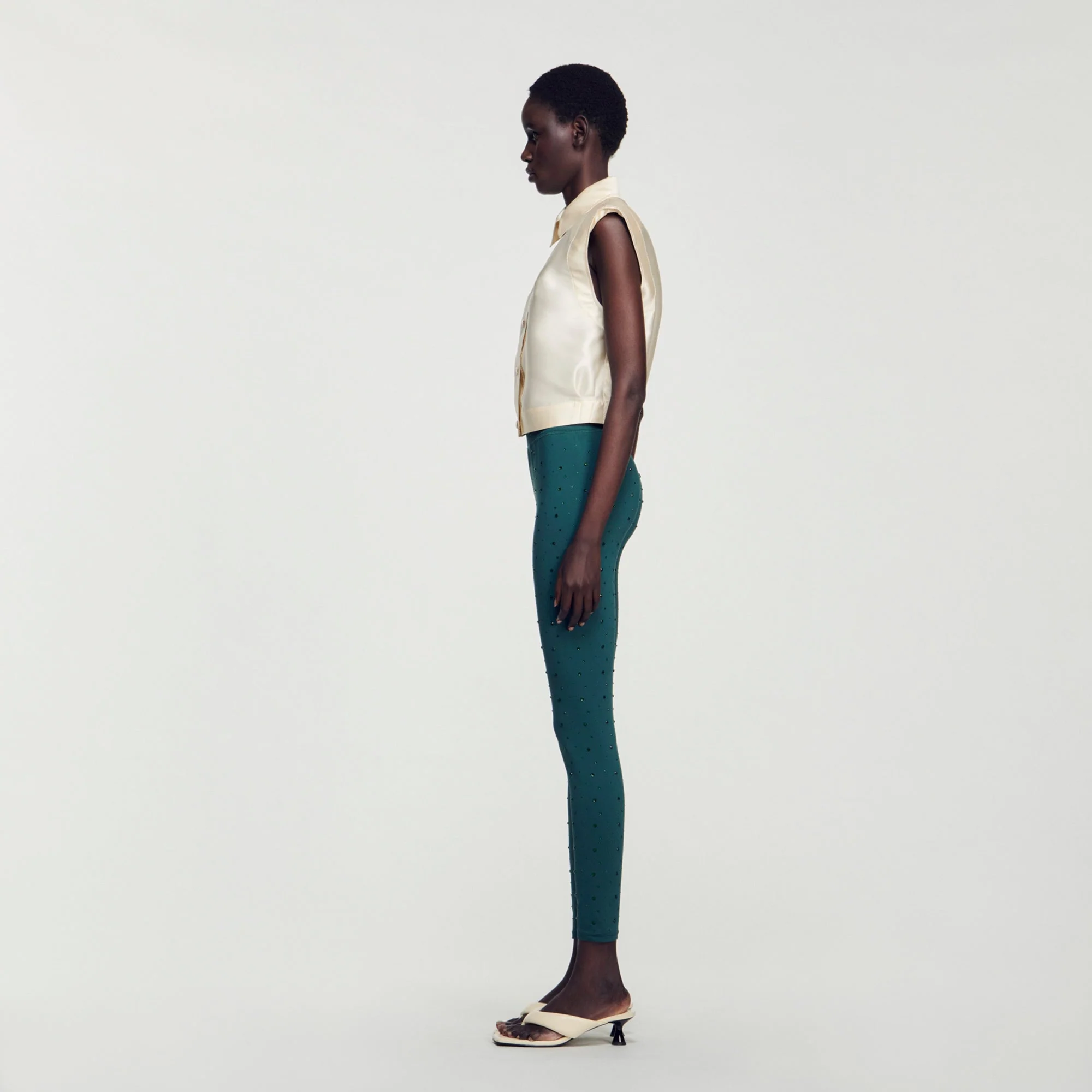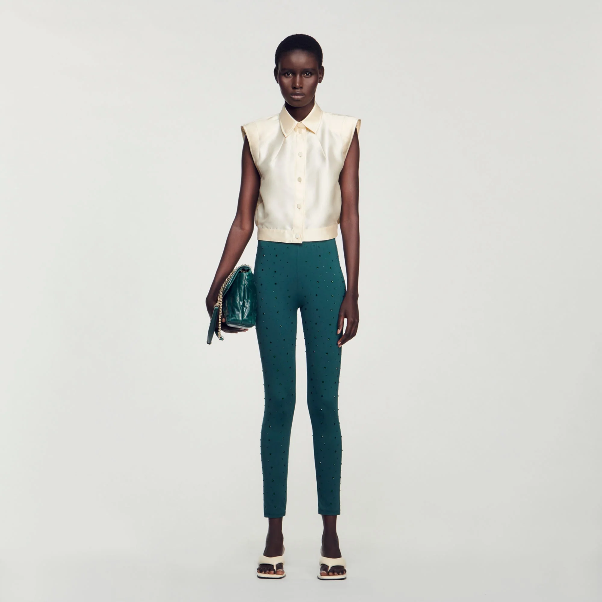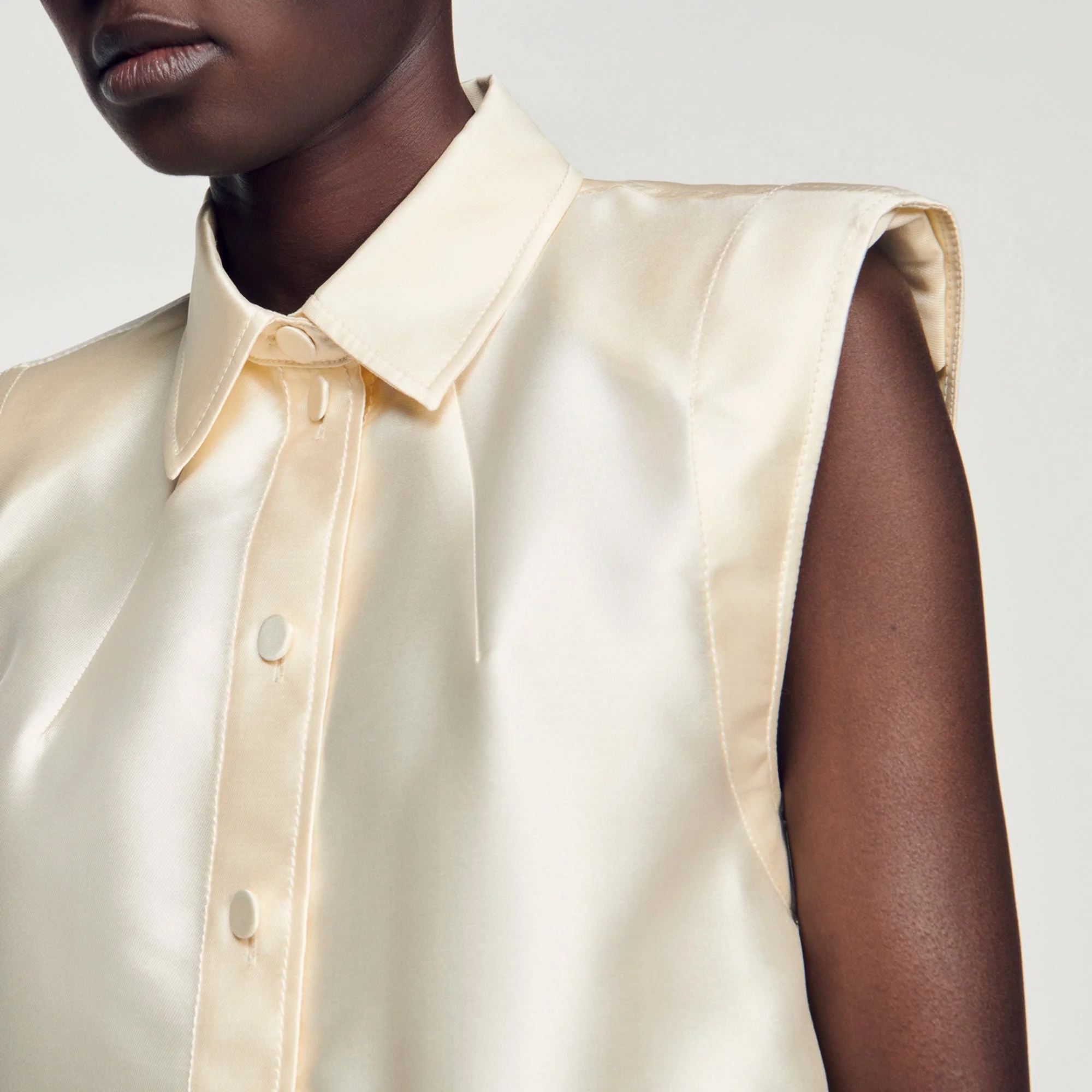 Camisa cropped de raso sin mangas con cuello y cierre de botones.• Sandro Camisa corta mujer