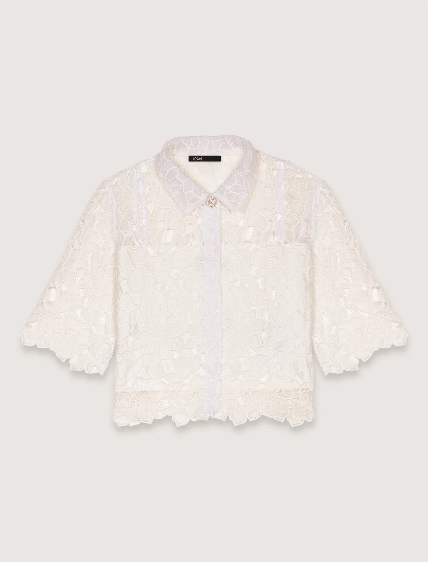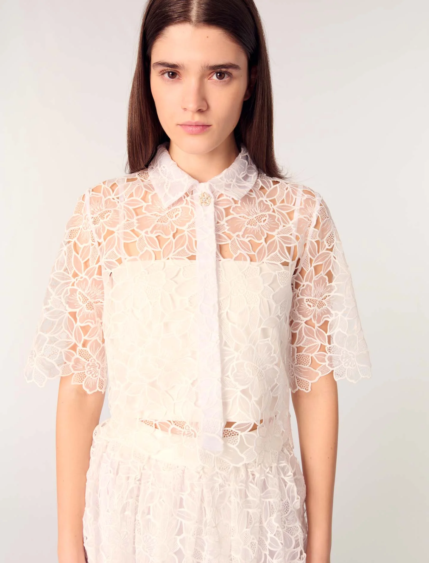 Esta camisa corta de guipur, adornada con motivos florales y de pedrería, deja adivinar sutilmente la piel. Un botón joya con perla y strass en el cuello y los bordes festoneados añaden un toque estructurado, mientras que el top a modo de forro ofrece varias opciones de uso.
