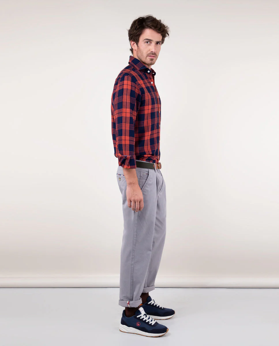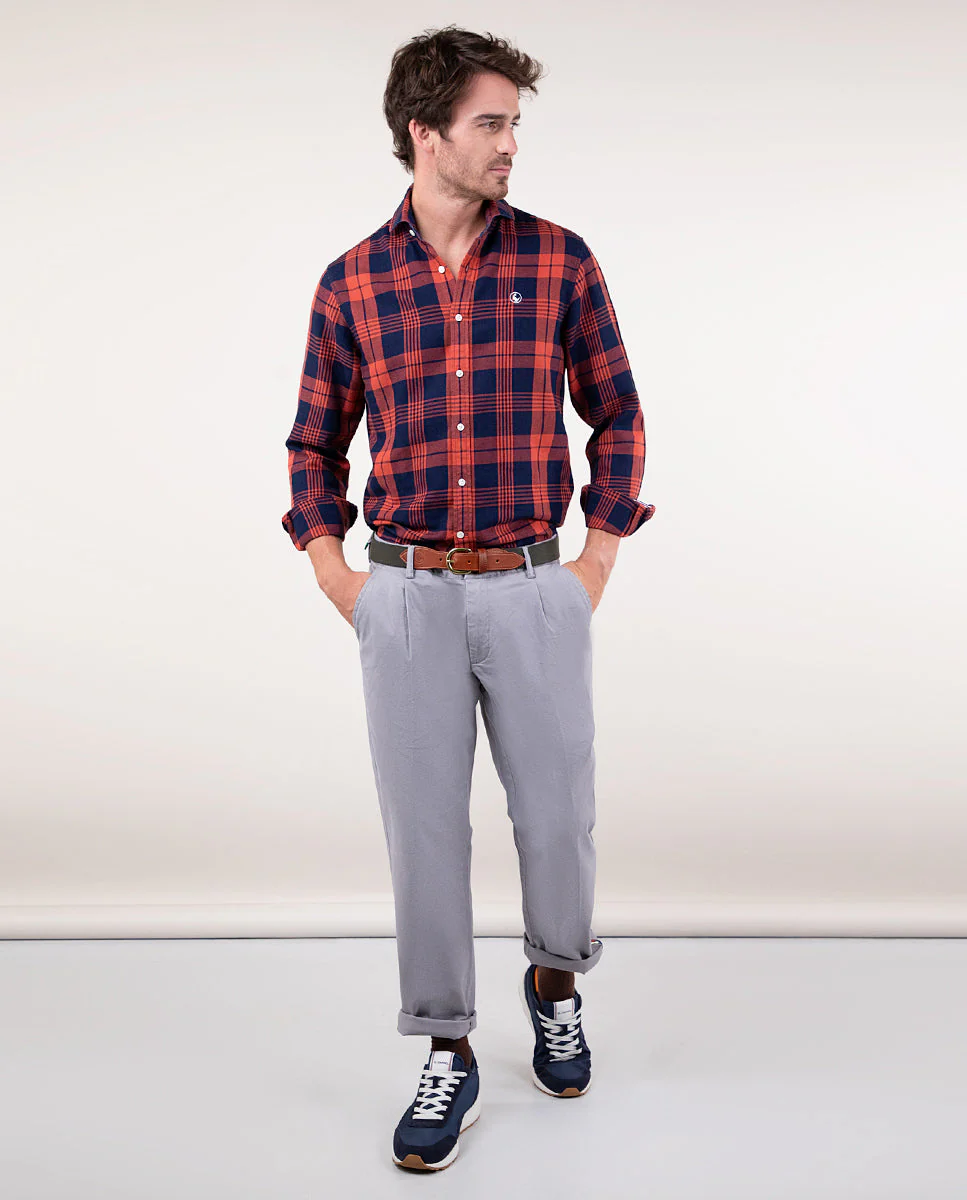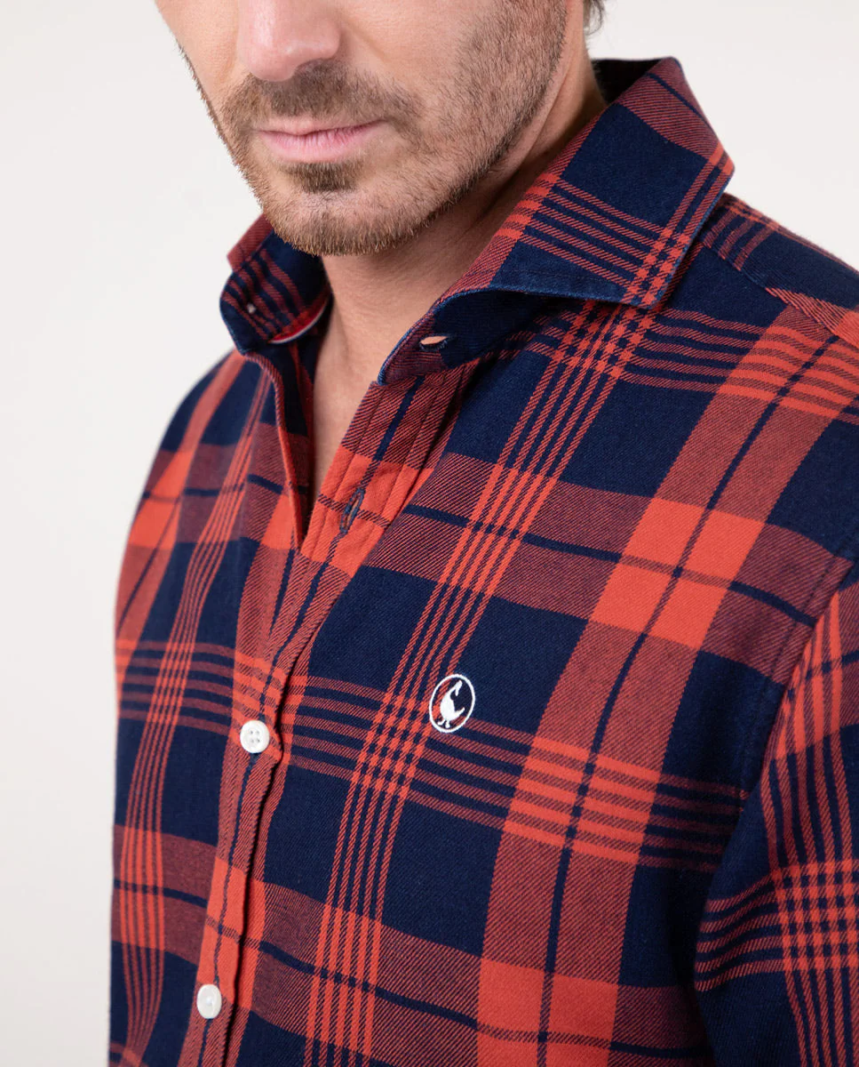 Camisa de hombre de cuadros en tejido Denim confeccionada en tejido 100% algodón. Corte Regular Fit, cuello button down y cierre con botones y tapeta. Manga larga terminada en puño simple y logo bordado en el pecho.
