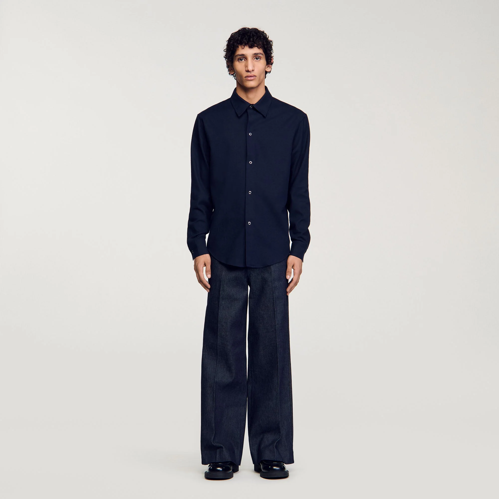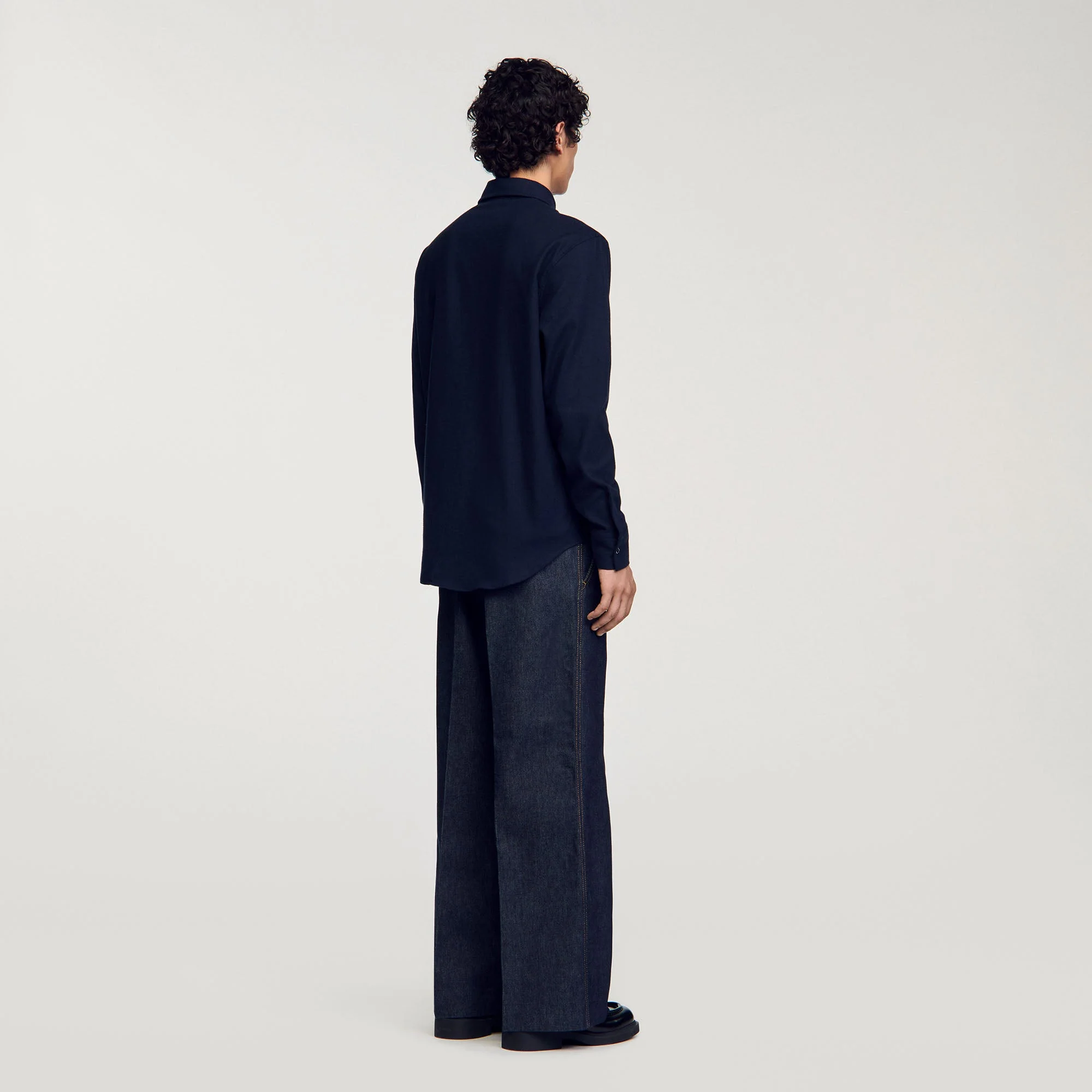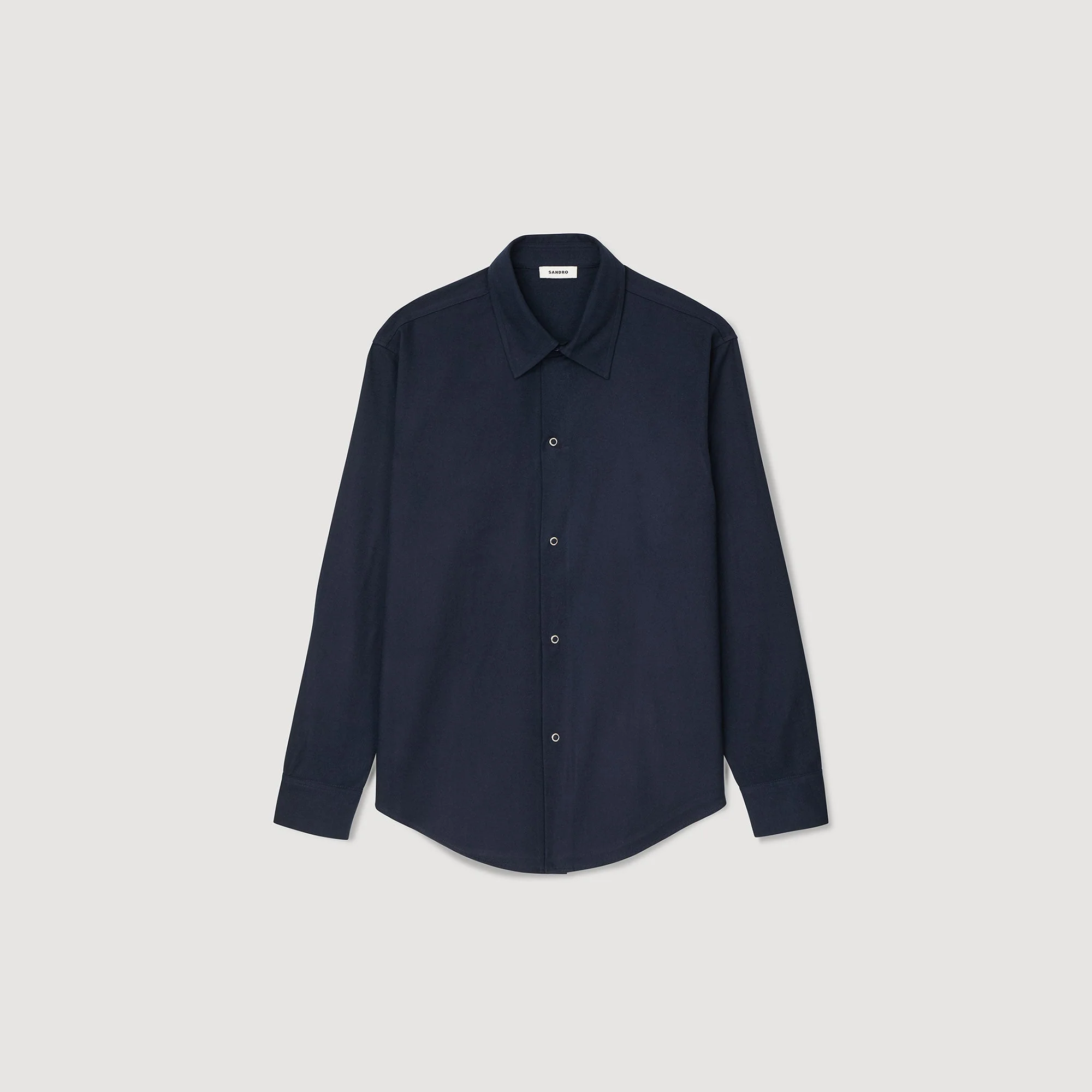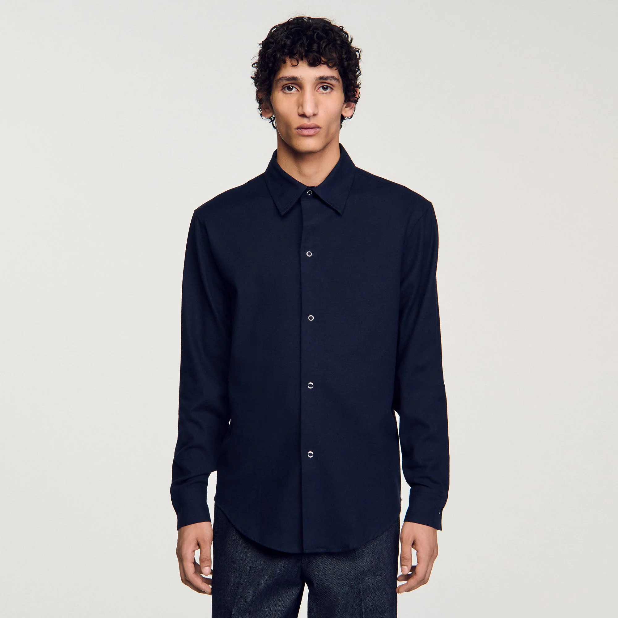 Camisa de franela con cuello clásico, manga larga y cierre de botones.