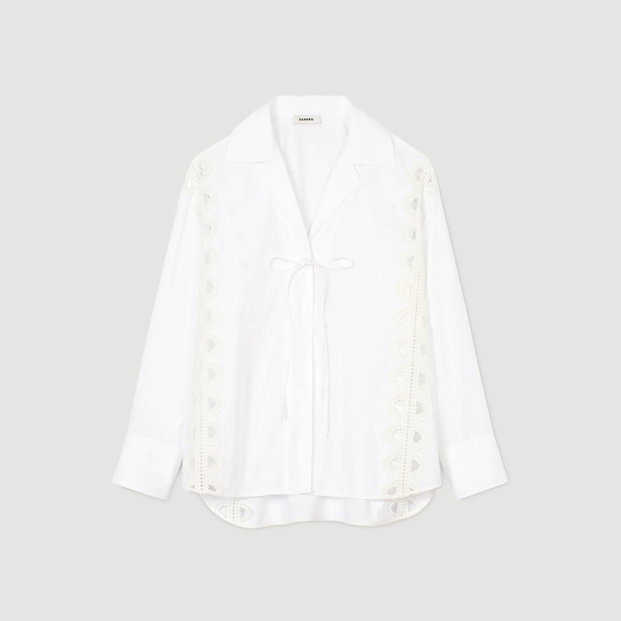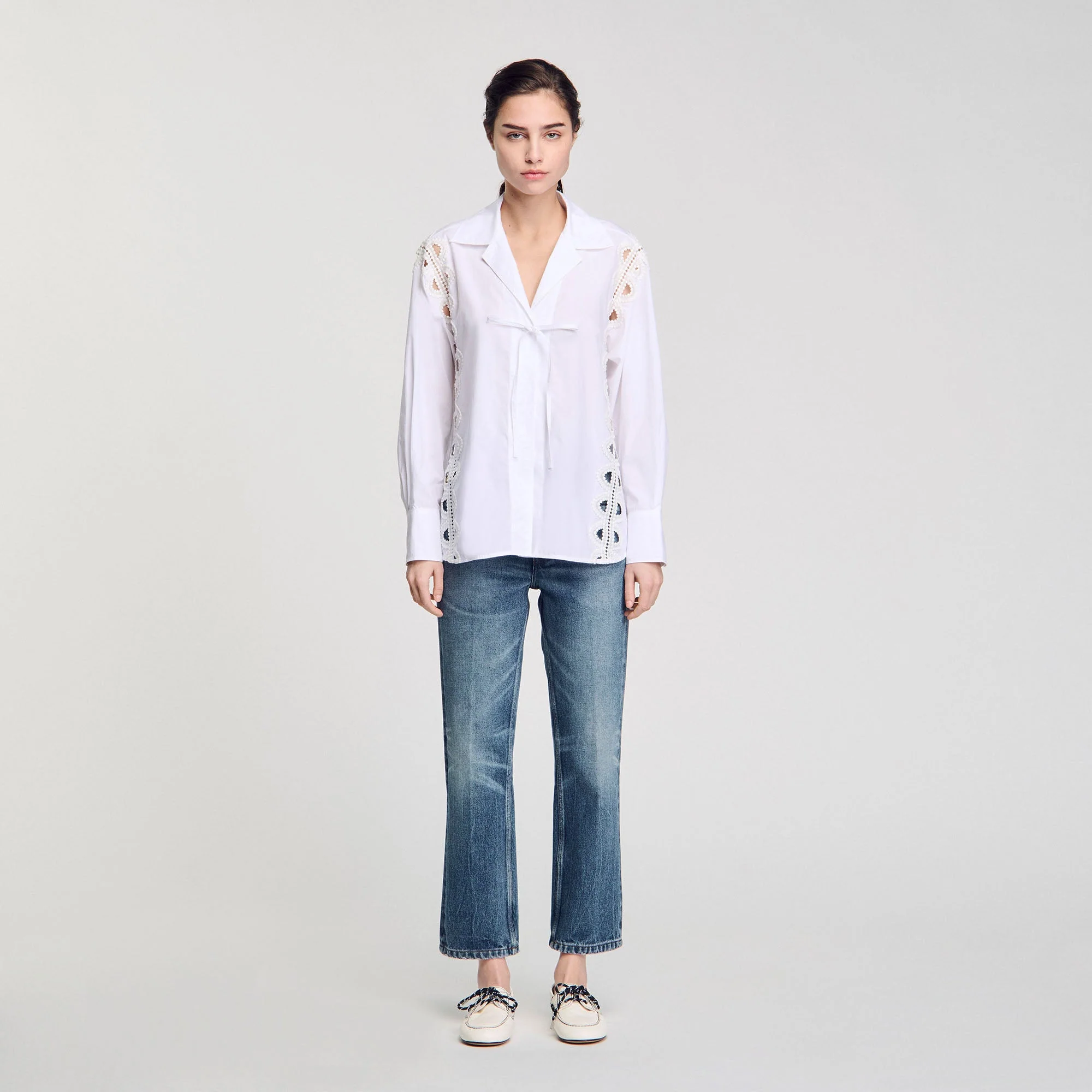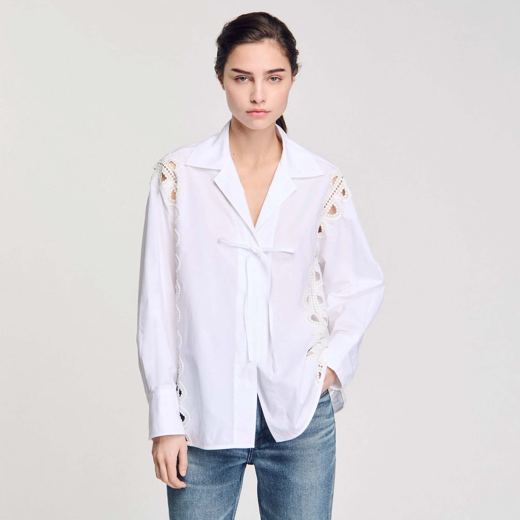 Camisa de popelina con cuello de solapa ancho y tiras para anudar delante y a los lados, adornada de galones de encaje calado.