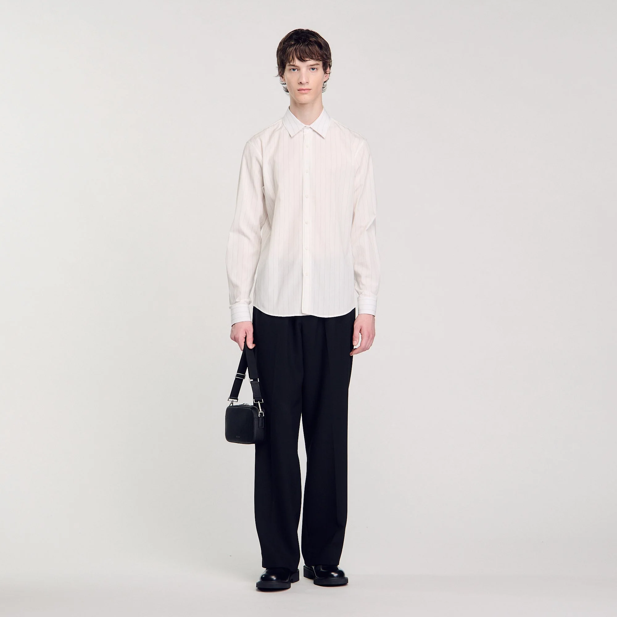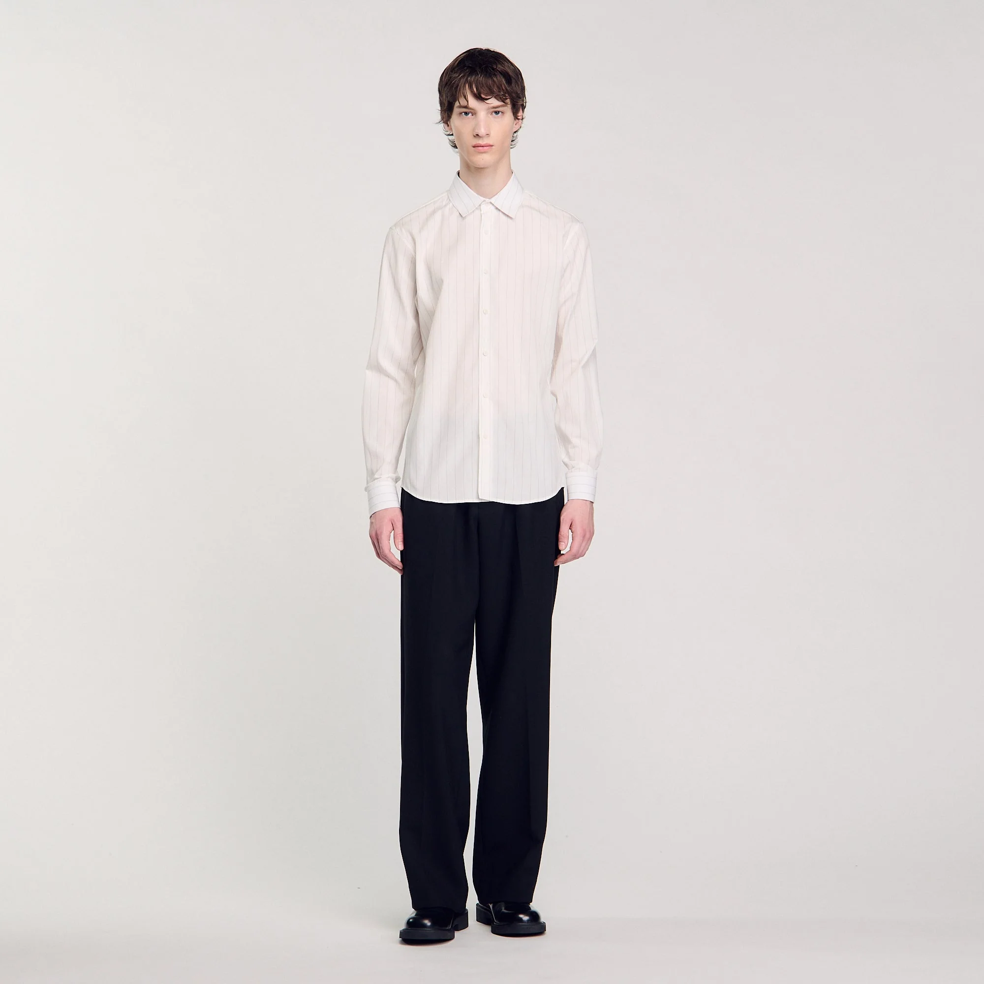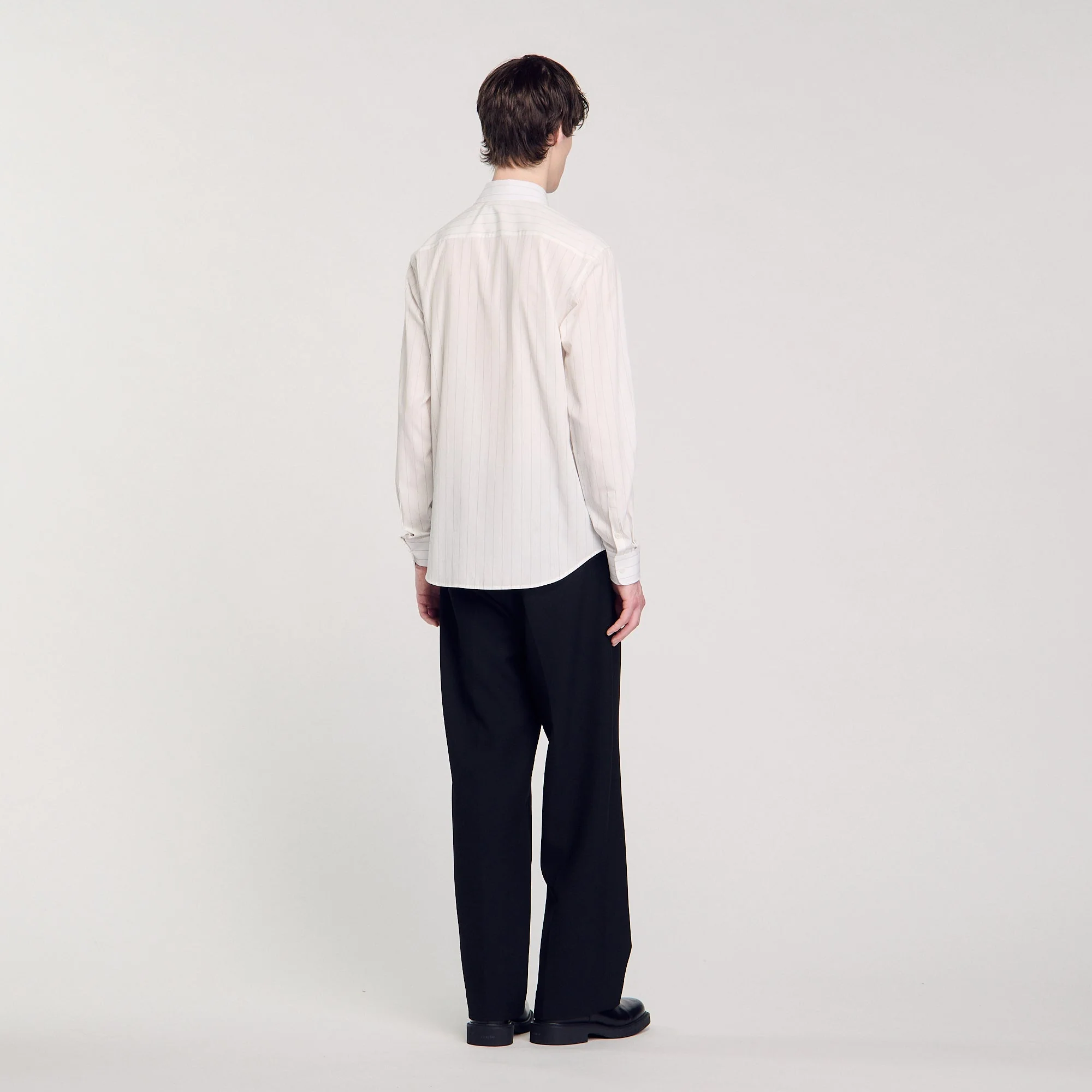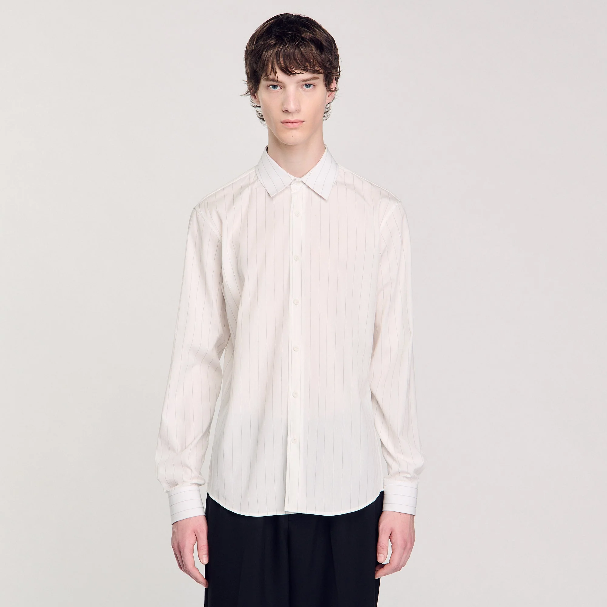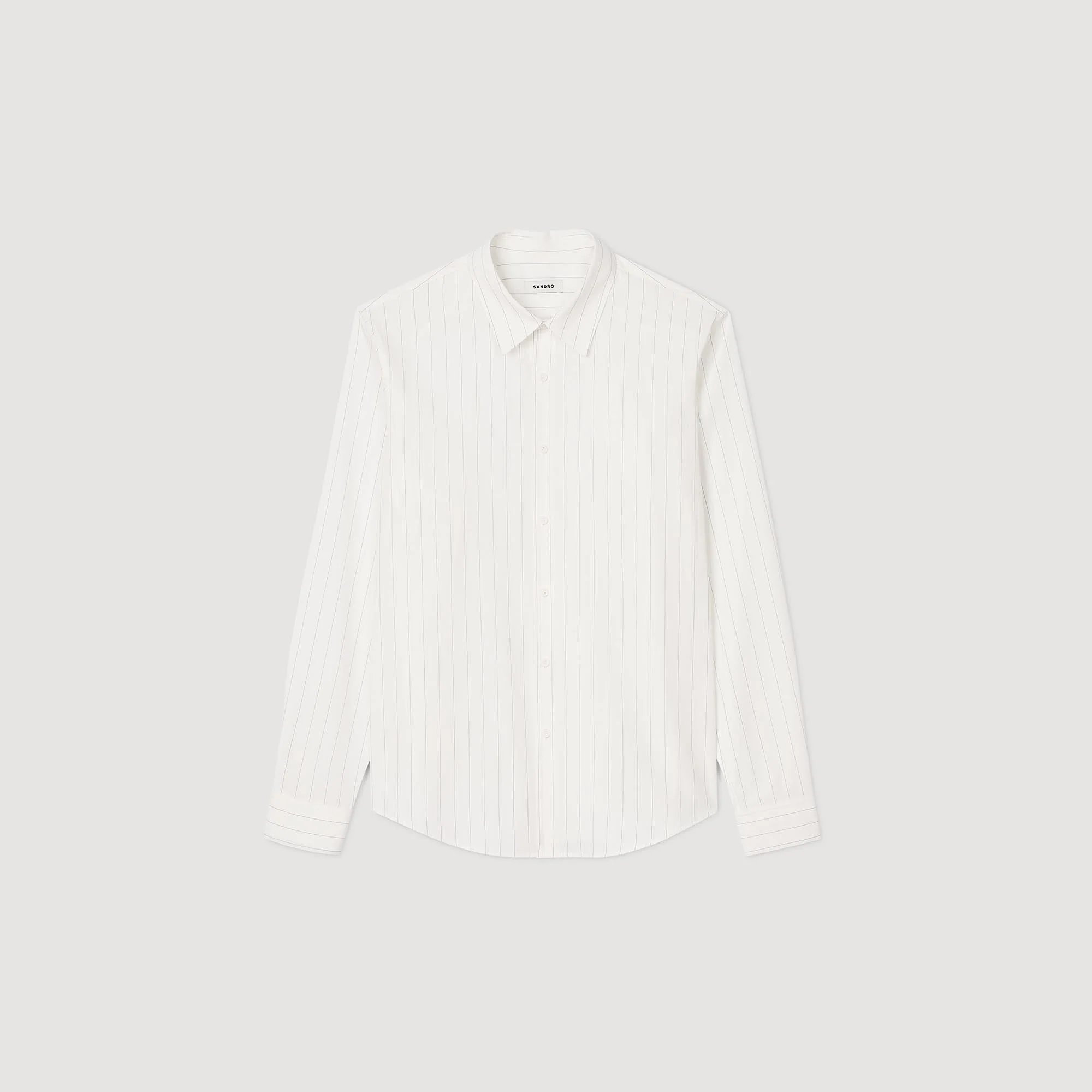Camisa recta de rayas finas en contraste con cuello clásico, manga larga con puño de botones y bajo redondeado.