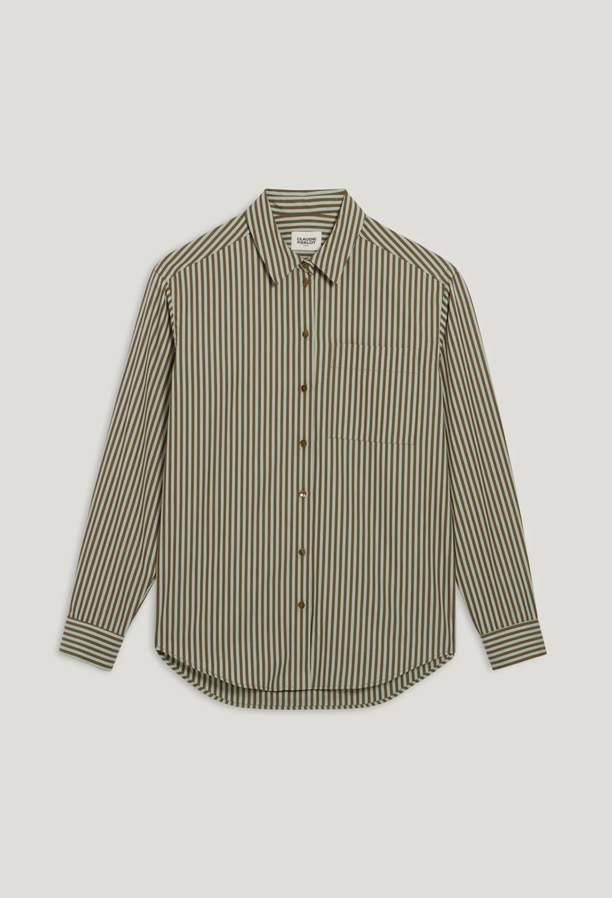 Cuello camisero, manga larga con trabillas en los puños, bajo más largo en la espalda, bolsillo en el pecho