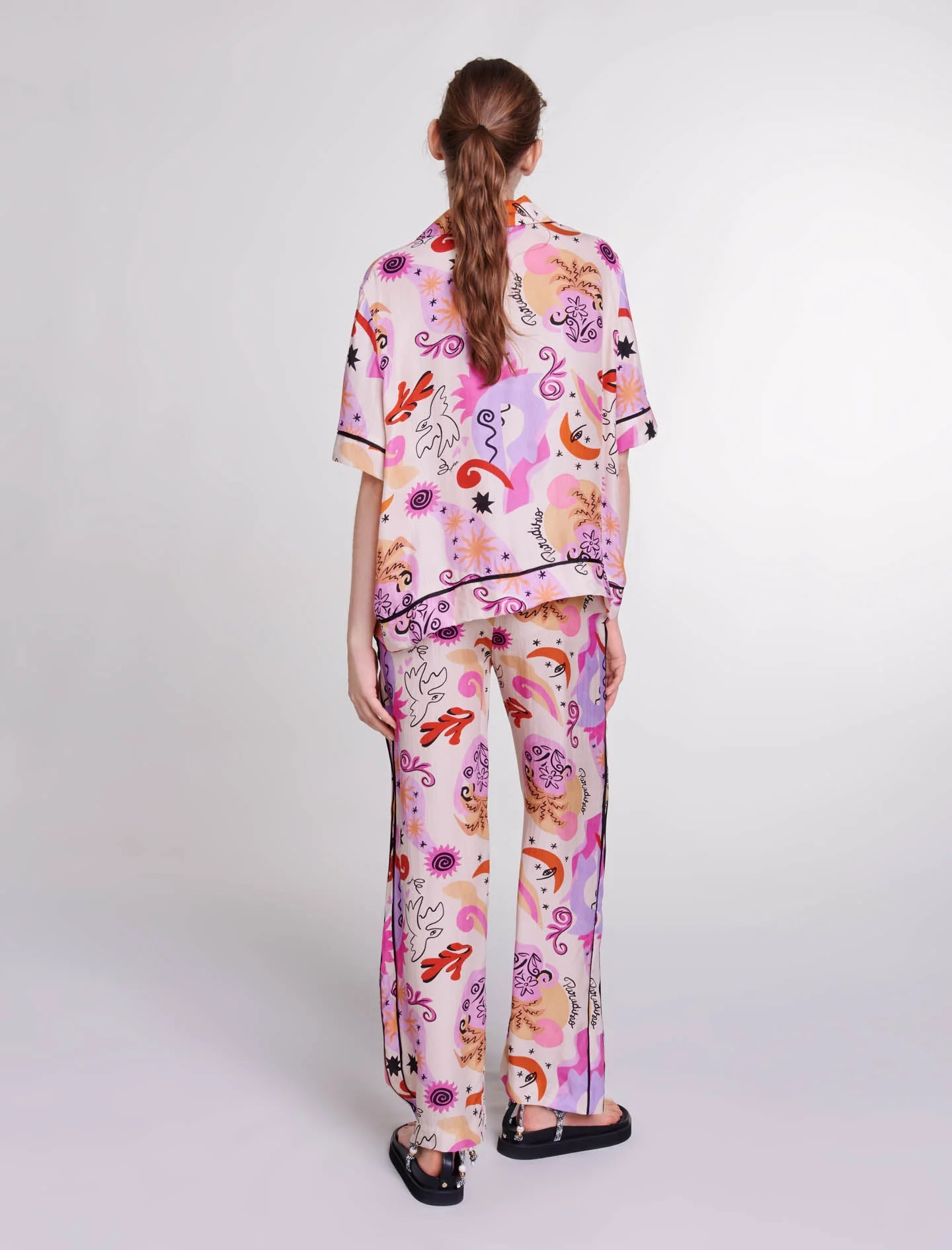 Cortes atrevidos, detalles femeninos y tonos vivos: el estudio de Maje rediseña piezas intemporales del guardarropa para realzar sus siluetas tanto de día como de noche.Esta camisa ligera y fluida tiene un estilo de pijama y viene con el estampado estrella de la colección «Paradisio», realzado con ribetes en contraste. De seda ligera y fluida, tiene un cuello de camisa, un cierre de botones y mangas cortas para un «look» elegante y estructurado.Apueste por un «look» total con el pantalón a juego y sandalias de cuerda.La modelo mide 179 cm y lleva una talla 1.Referencia: MFPCM00562_F045