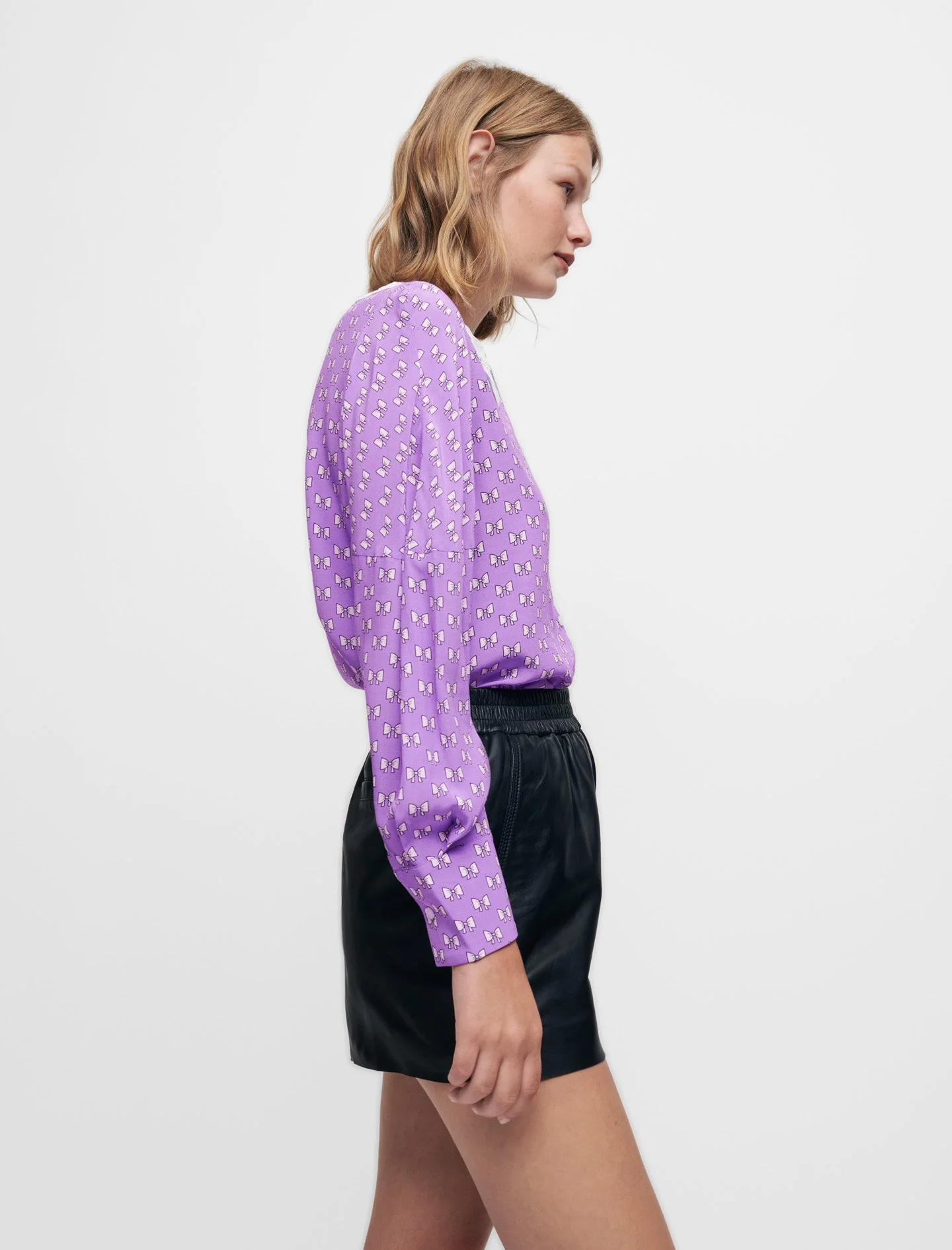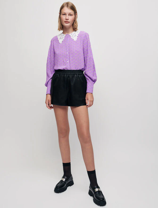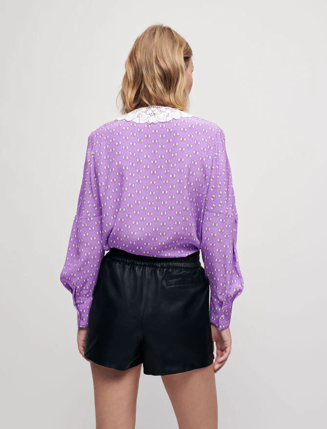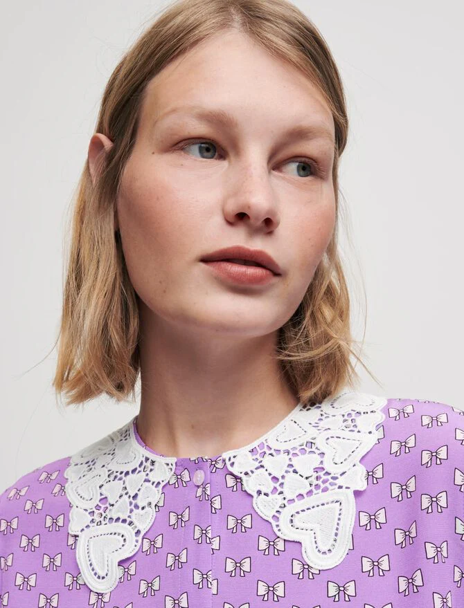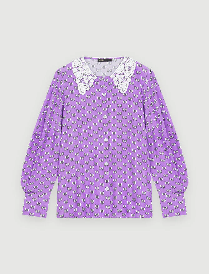 Camisa recta de viscosa fluida con estampado de lazos. Mangas largas y rectas ajustadas en el puño. Cuello de guipur en contraste. Costura en las mangas. Botones pequeños en la parte delantera y en el puño de las mangas.