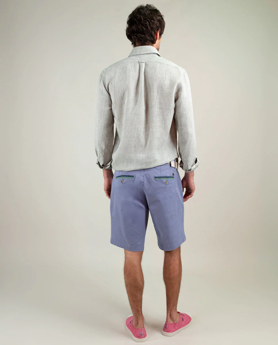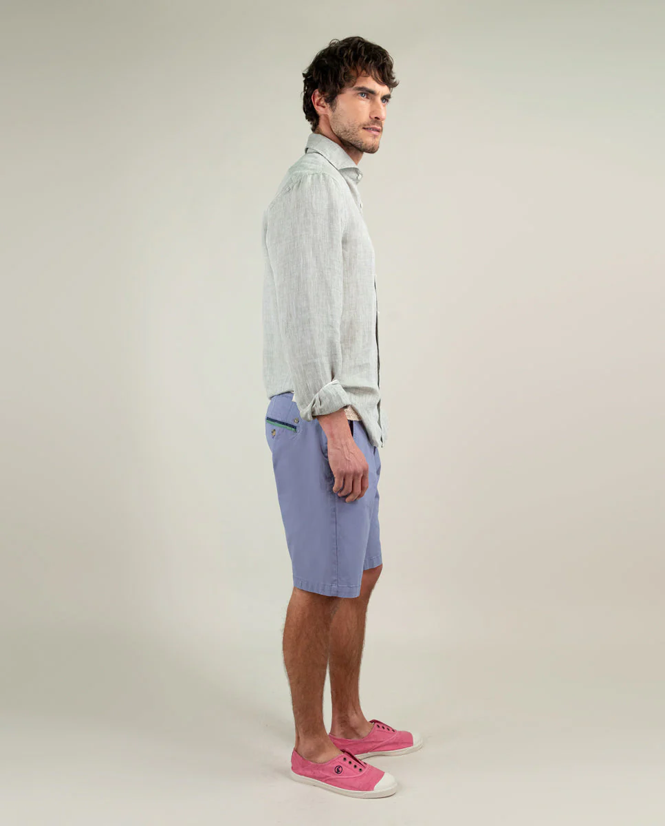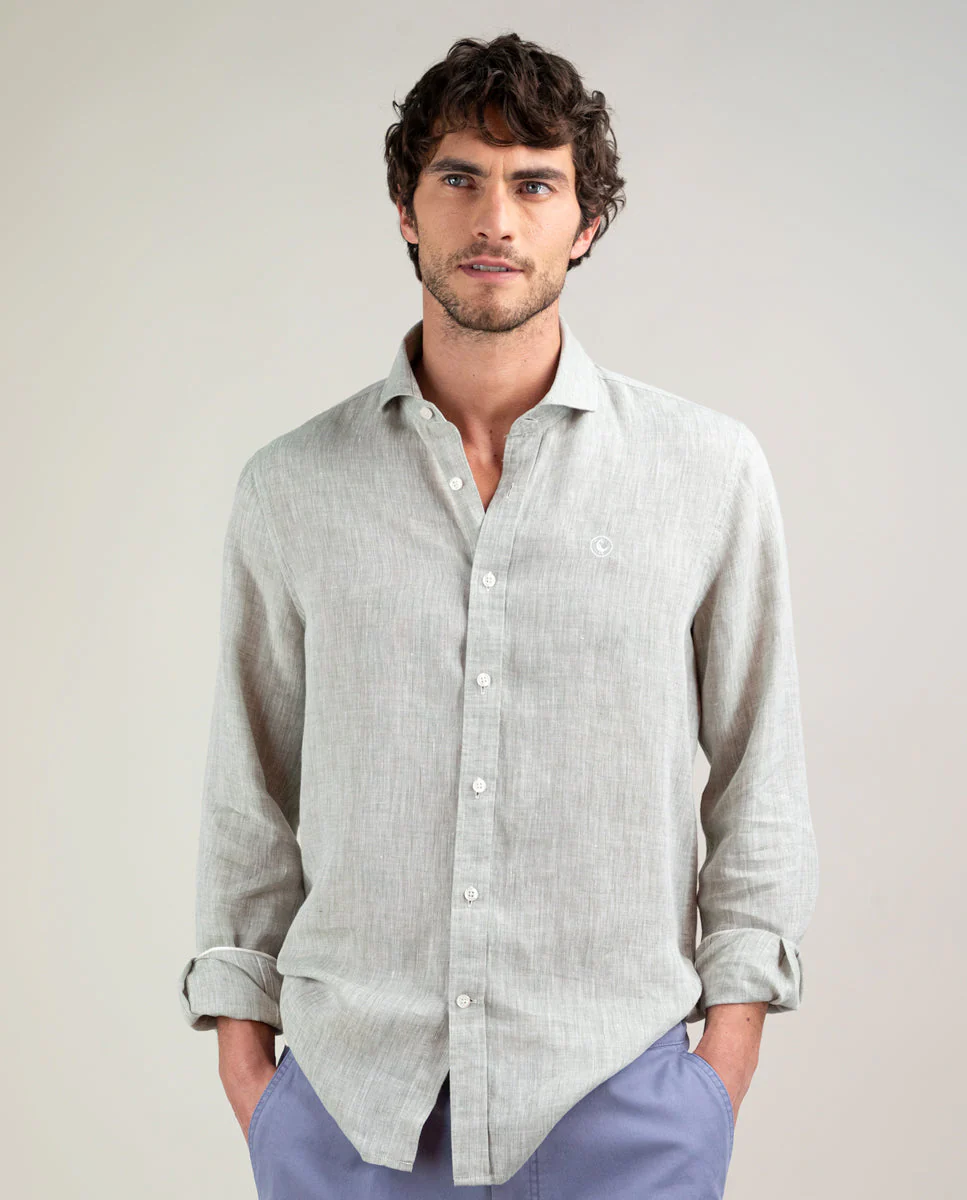 Camisa lisa de hombre confeccionada en 100% lino, material ligero y transpirable. Corte Regular Fit, cuello italiano y cierre con botones. Manga larga terminada en puño simple y logo en el pecho bordado. Como detalle lleva piping a contraste en cuello y puños.