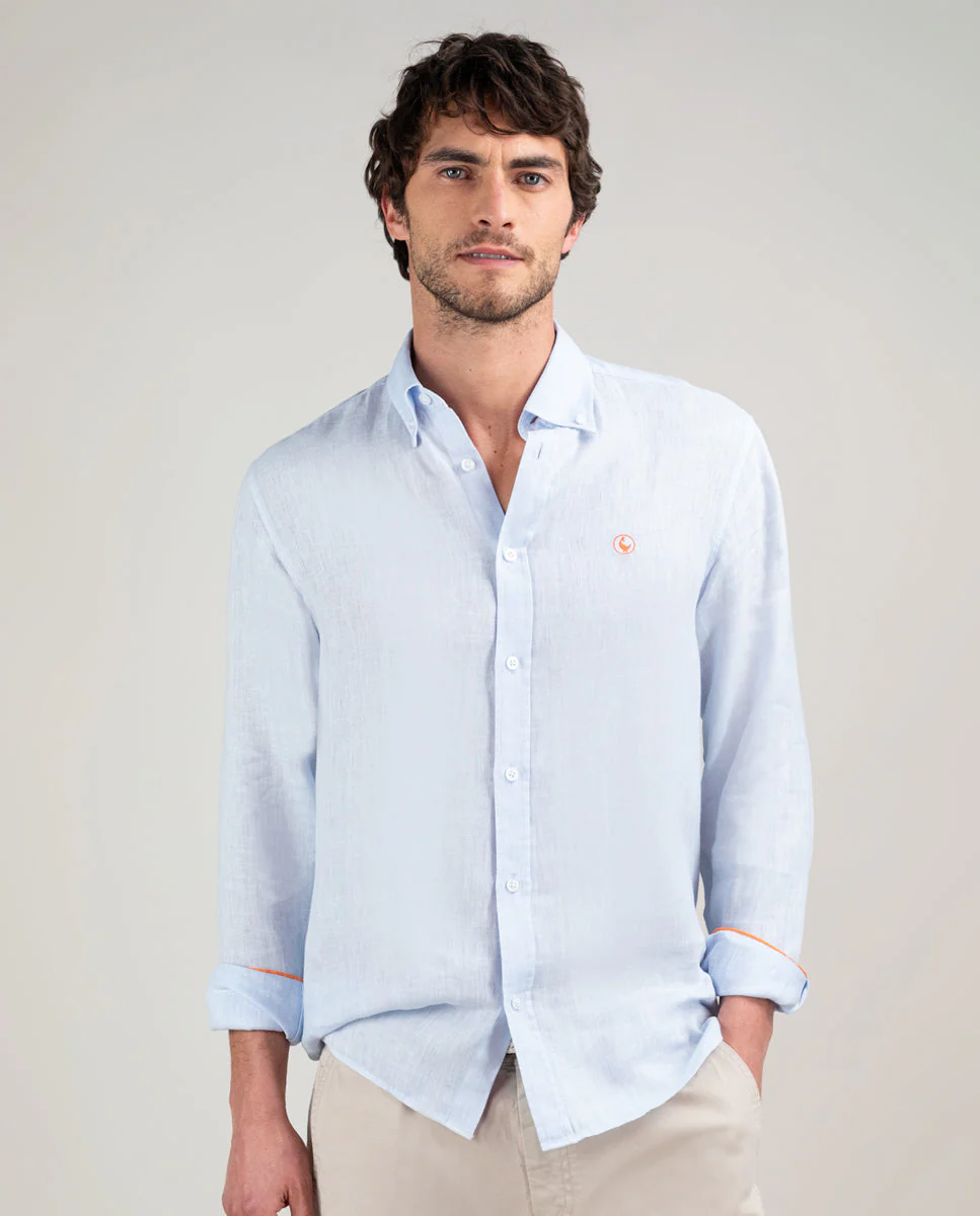Camisa lisa de hombre confeccionada en lino, tintada en prenda envejecida para darle un acabado vintage. Corte Regular Fit, cuello buttondown y cierre con botones. Manga larga terminada en puño simple y logo en el pecho bordado.