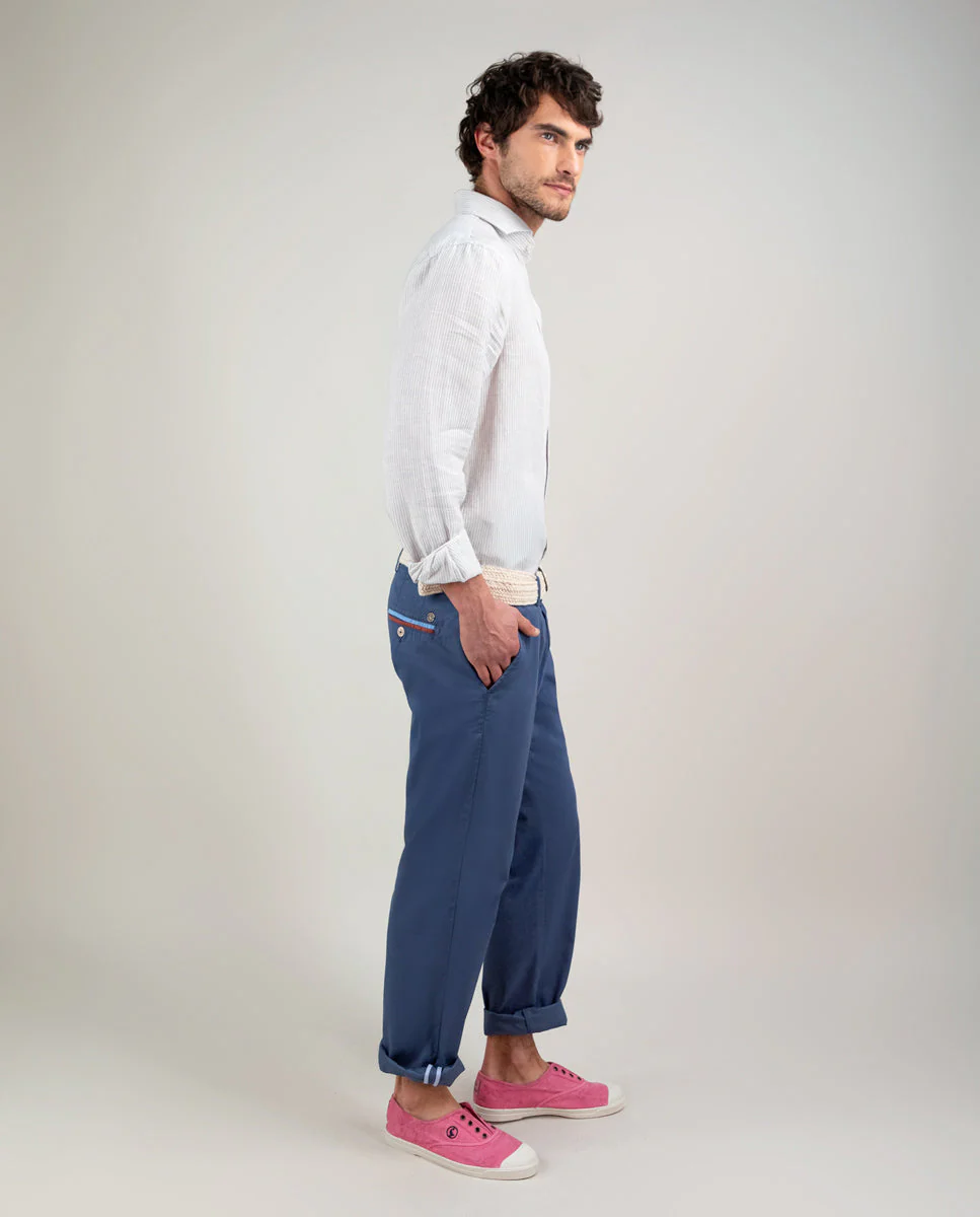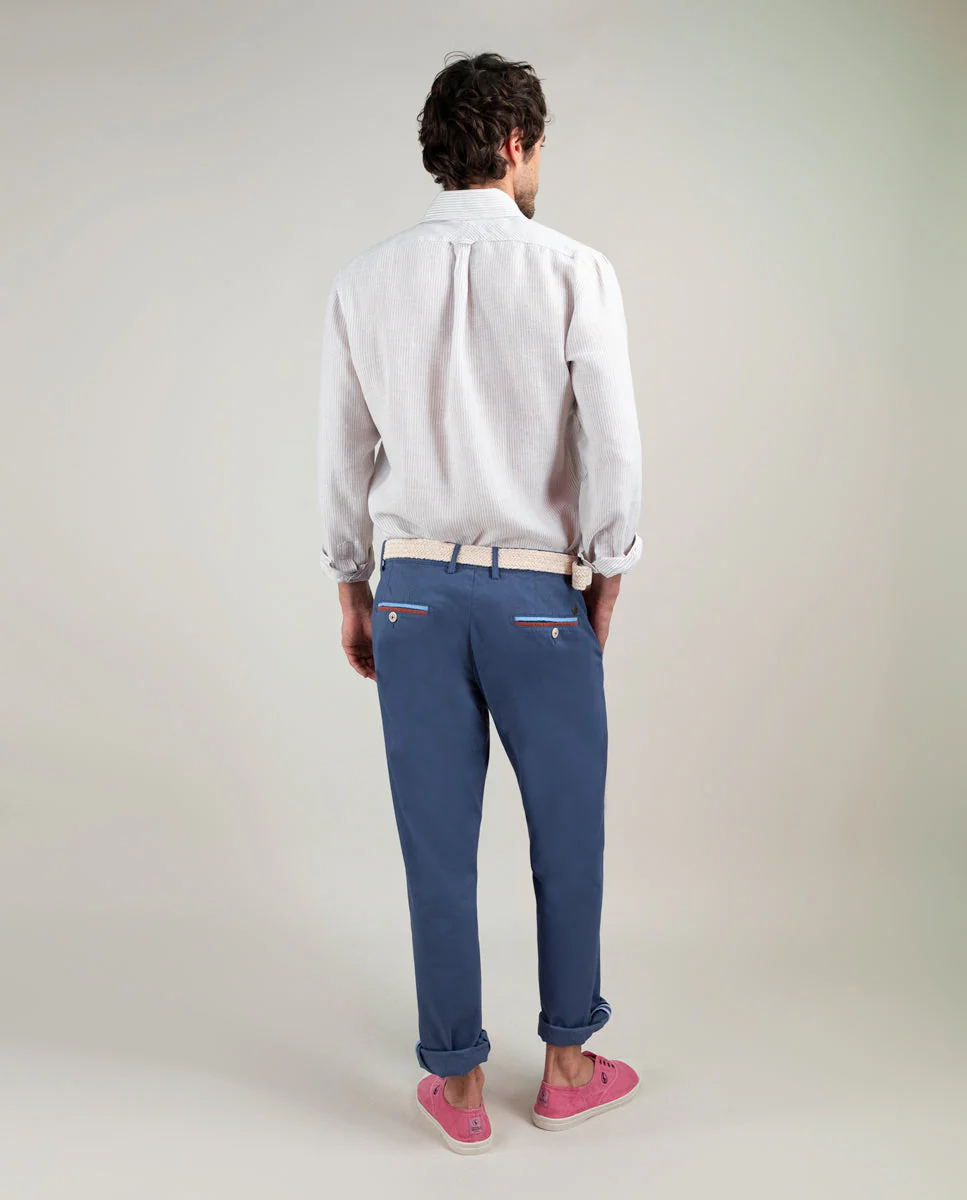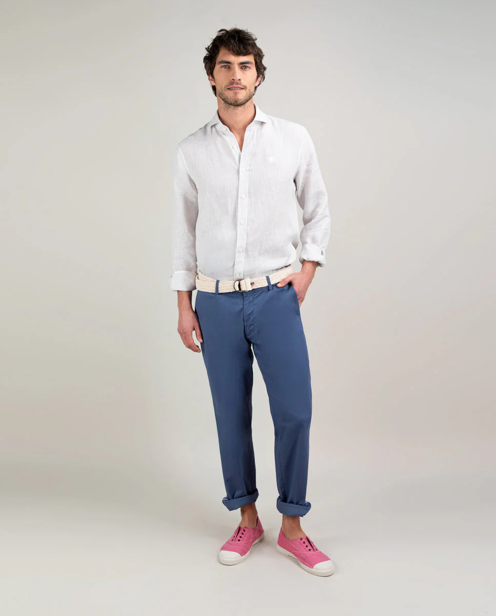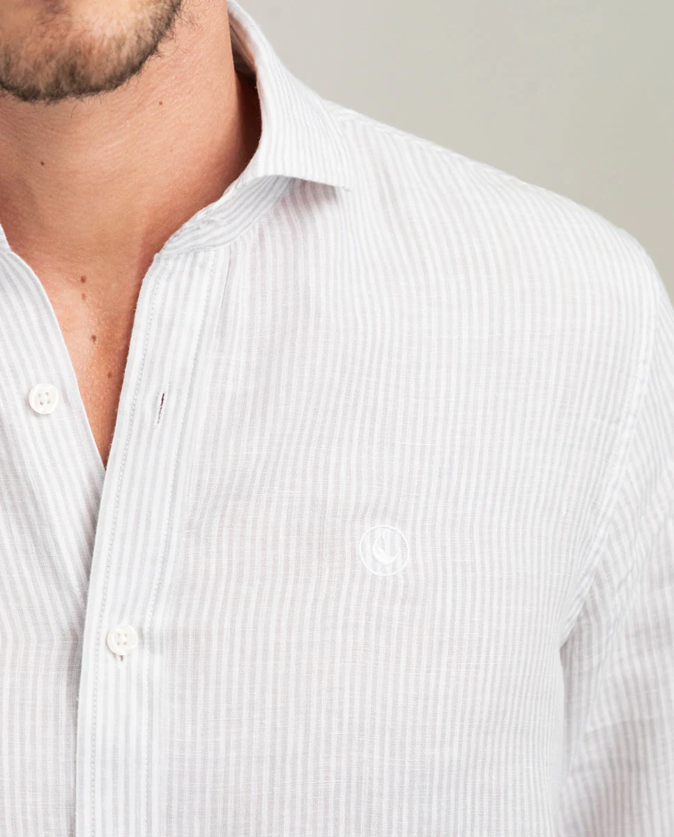 Camisa de rayas de hombre confeccionada en 100% lino, material ligero y transpirable. Corte Regular Fit, cuello italiano y cierre con botones. Manga larga terminada en puño simple y logo en el pecho bordado. Como detalle lleva piping a contraste en cuello y puños.