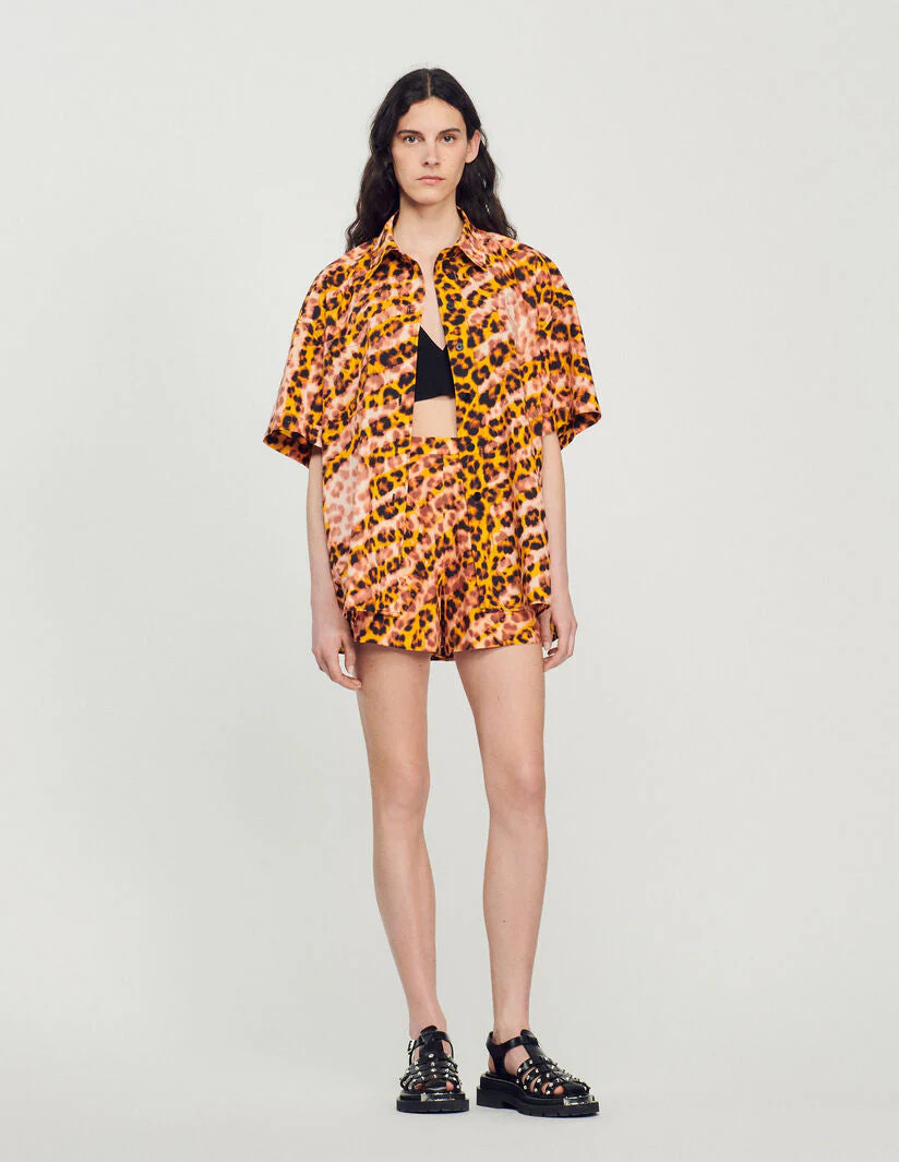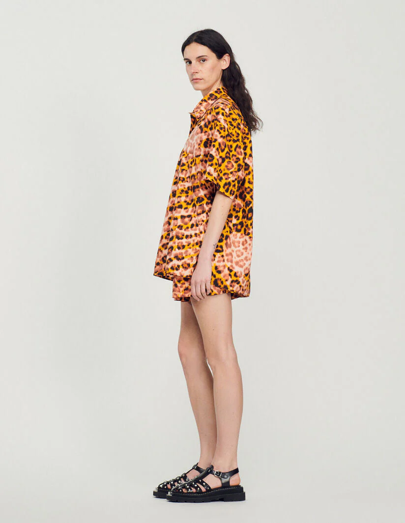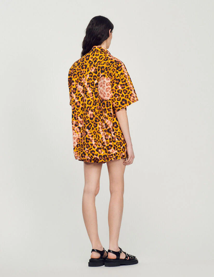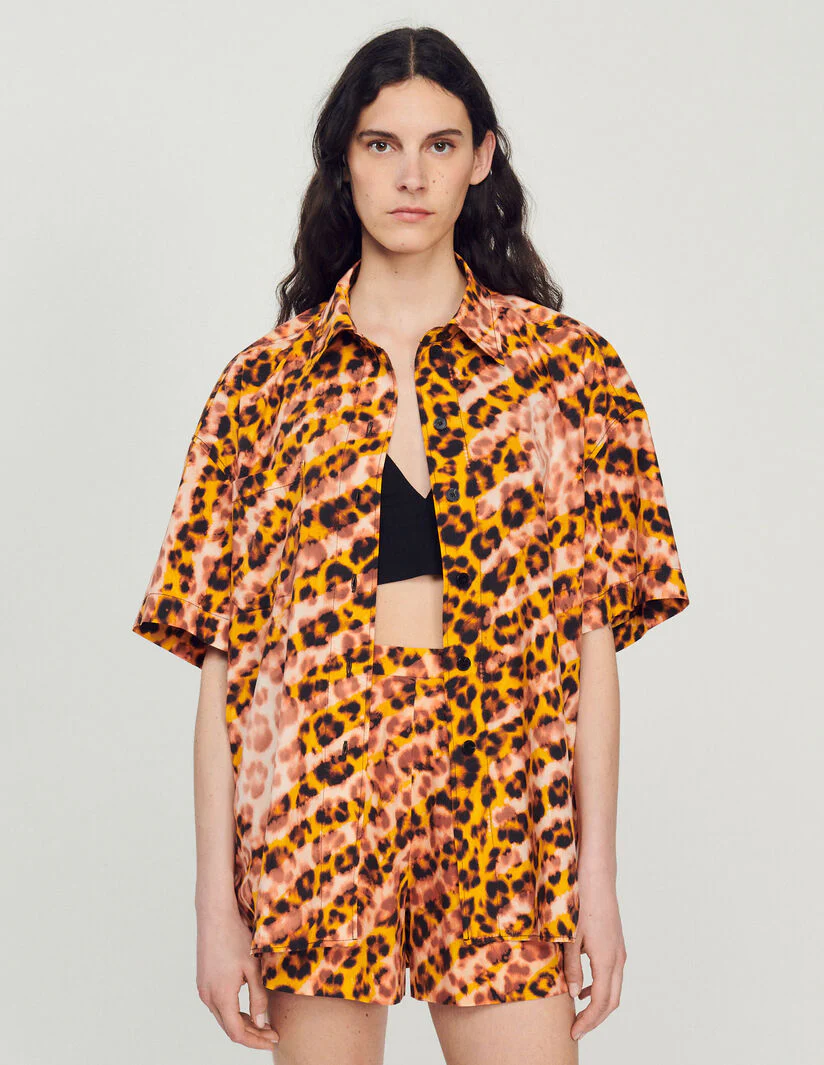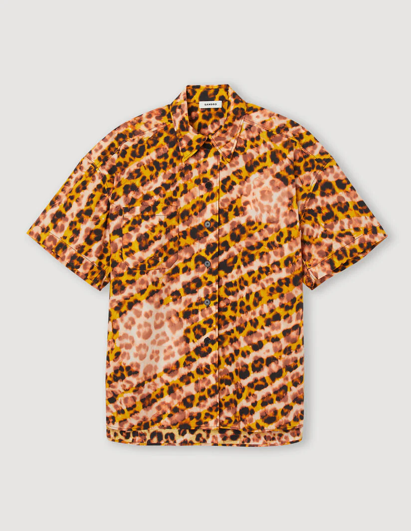 Camisa oversize abotonada de manga corta con un bolsillos de parche en el pecho, sublimada con un estampado de leopardo ligeramente desteñido.