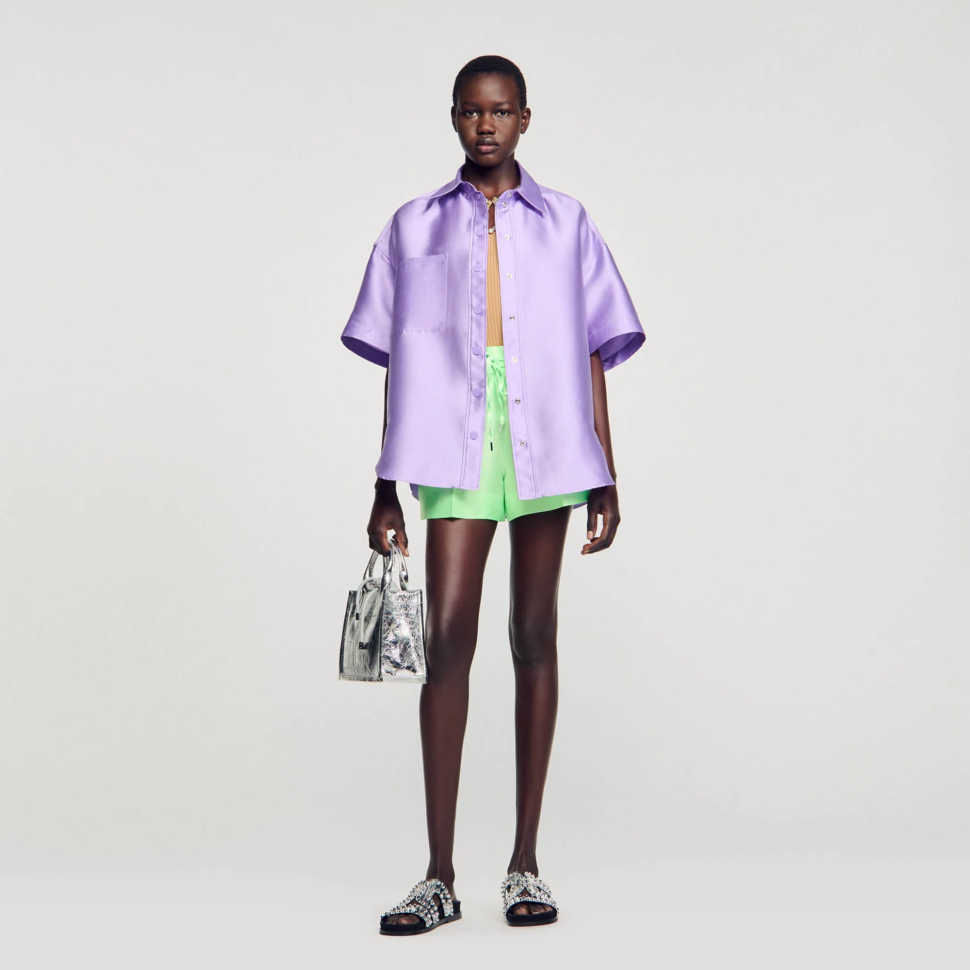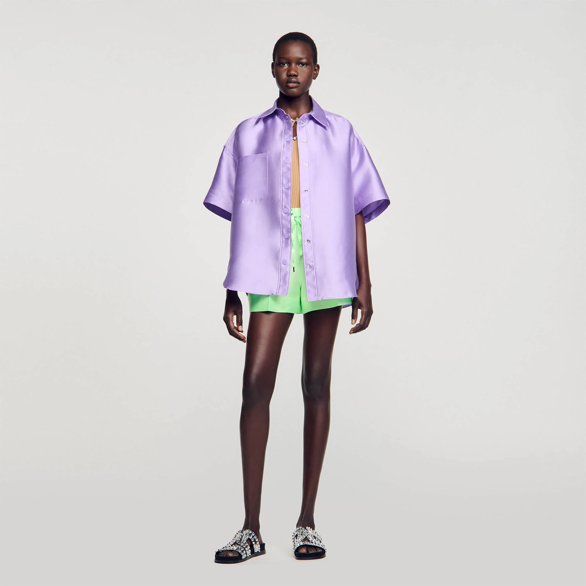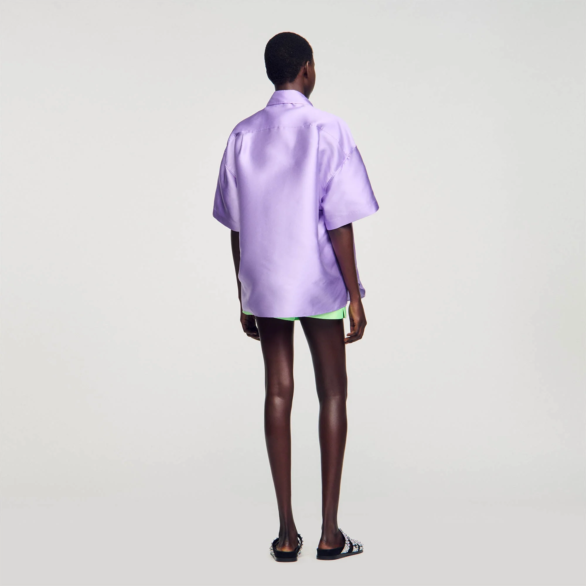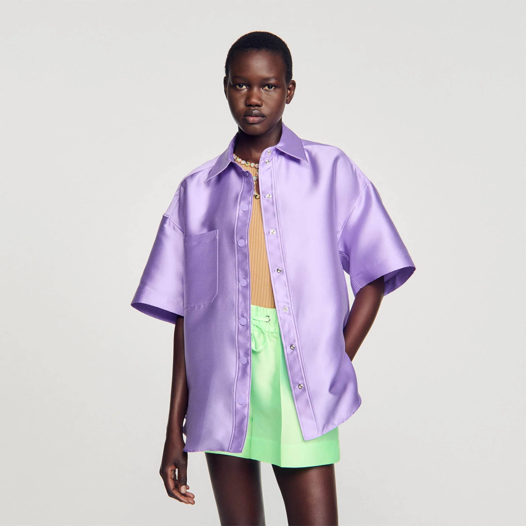 Camisa oversize de manga corta y ancha de satén, con un bolsillo de parche en el pecho y tapeta de botones automáticos.
