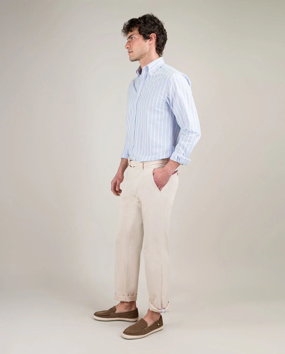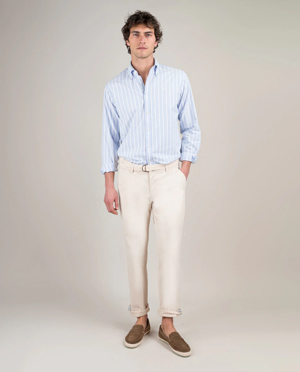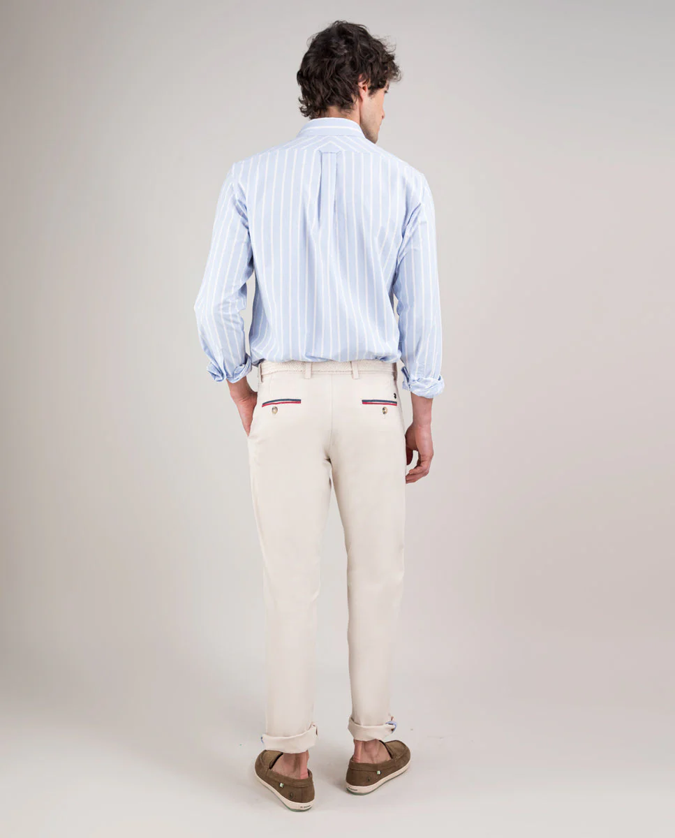 Camisa de hombre raya butcher con tecnología Sepiia confeccionada en 100% poliéster técnico antibacteriano reciclable. Corte Slim Fit, cuello buttondown y cierre con botones. Manga larga terminada en puño simple y logo bordado en el pecho a contraste. Tiene cortes en la espalda que permite ajustarse ligeramente al cuerpo, manteniendo la comodidad. Costura del hombro reforzada, para prevenir el desgaste por el uso. Bajo redondeado. Estos tejidos han sido producidos en España y las prendas han sido confeccionadas en Portugal de una forma sostenible.