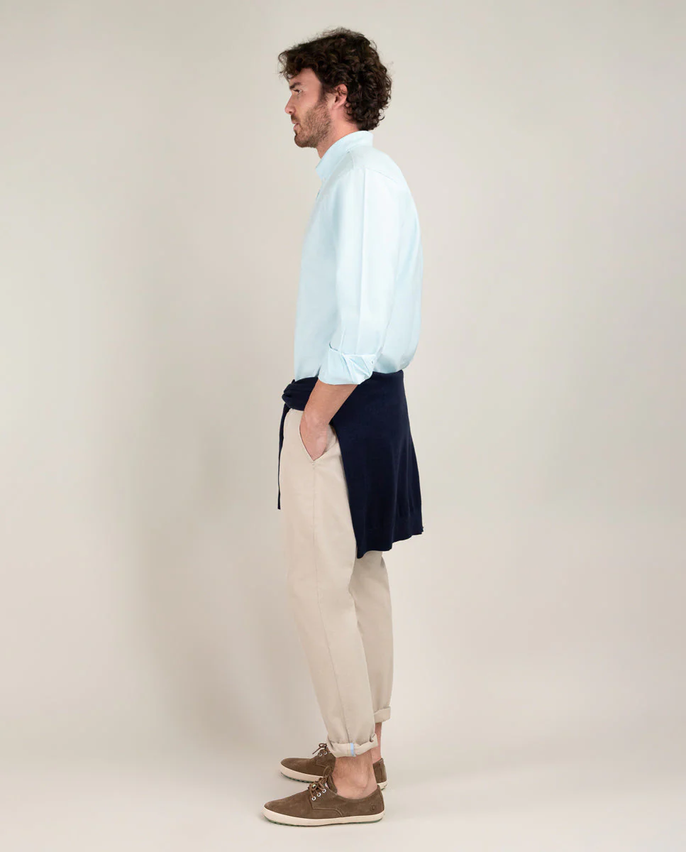 Camisa de hombre oxford lisa con tejido compuesto de 93% algodón y 7% algodón reciclado. Corte Regular Fit, cuello buttondown y cierre con botones. Manga larga terminada en puño simple y logo en el pecho bordado. Detalles interiores a contraste de cinta corbatera.