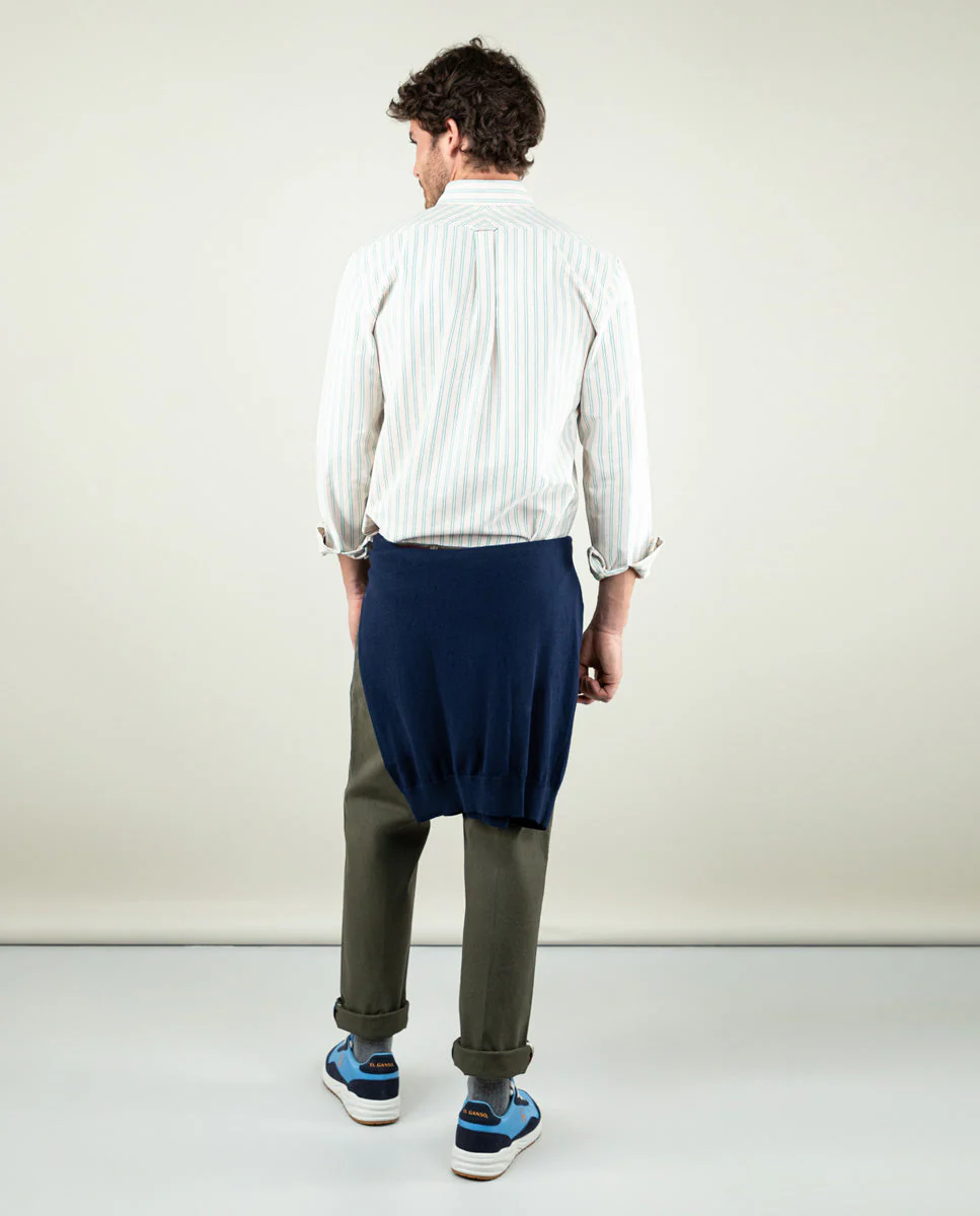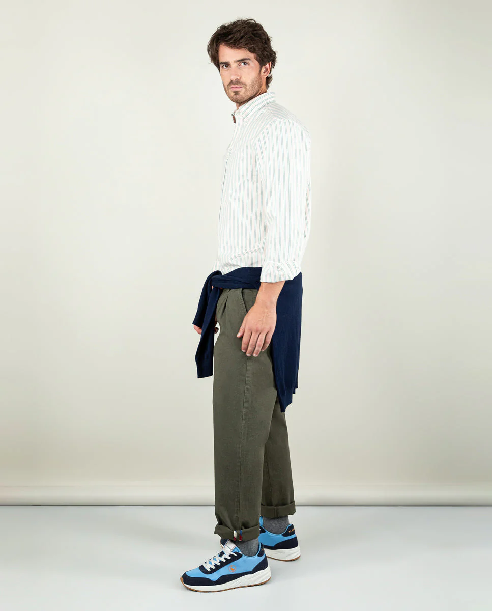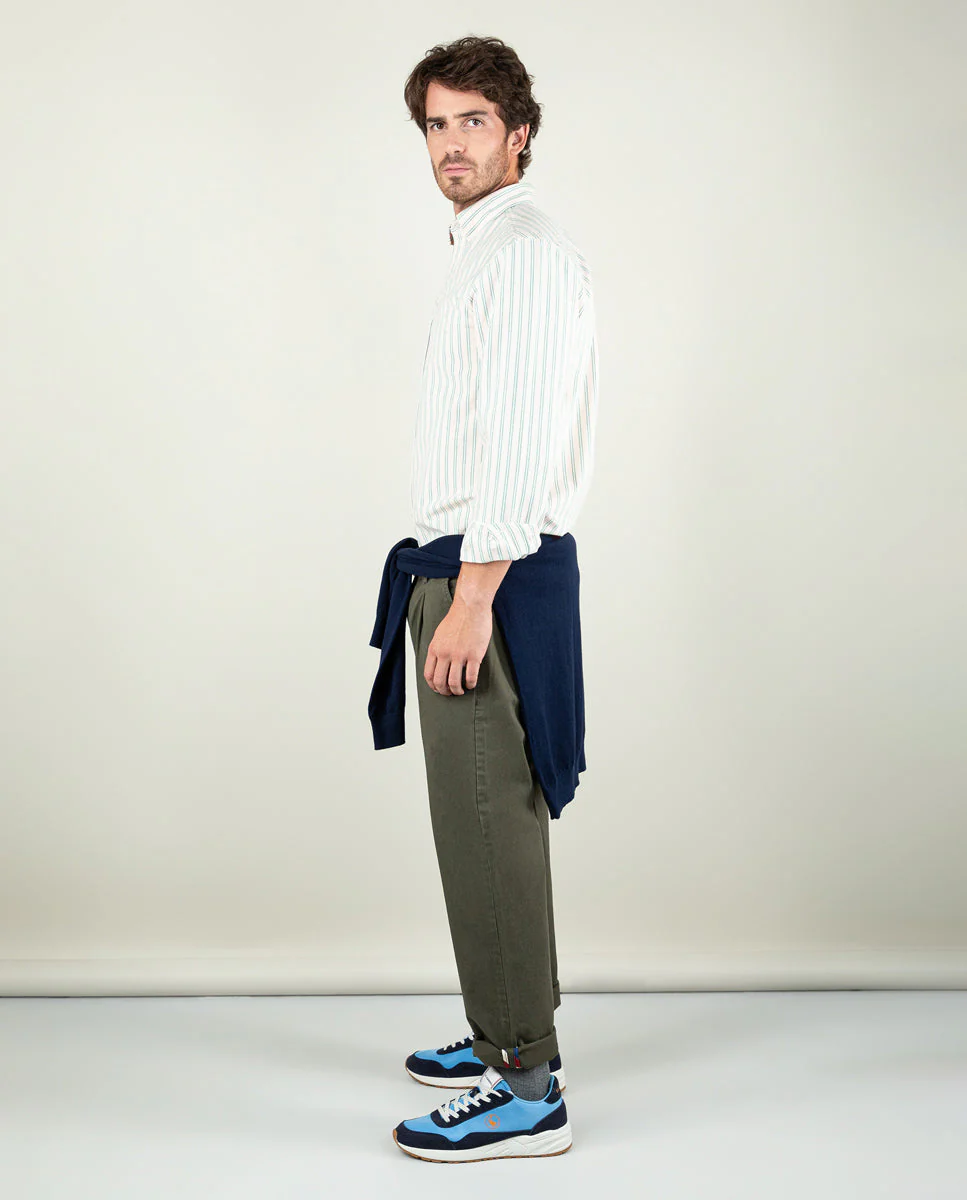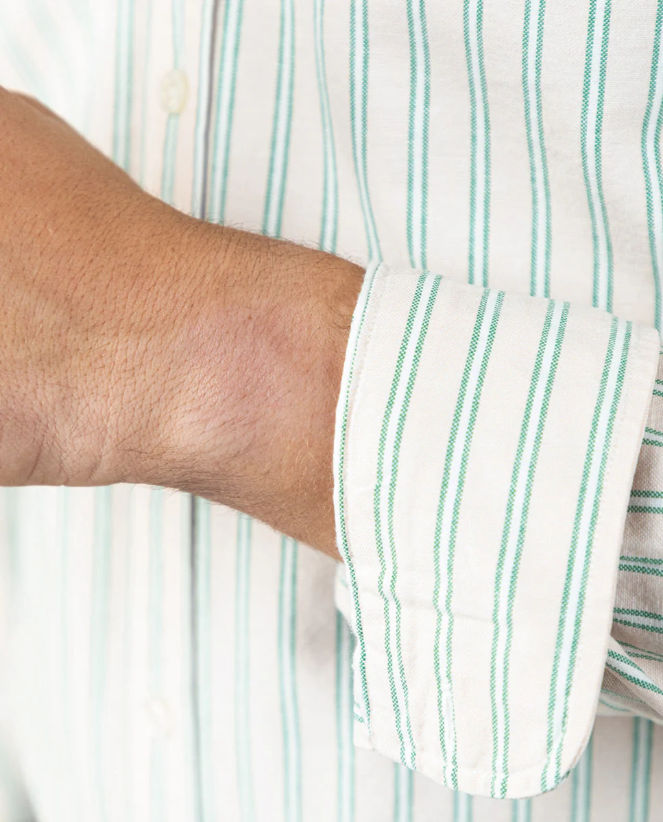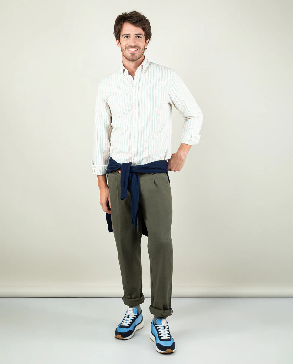 Camisa de hombre rayas oxford con tejido compuesto de 100% algodón. Corte Regular Fit, cuello buttondown y cierre con botones. Manga larga terminada en puño simple y logo en el pecho bordado. Detalles interiores a contraste de cinta corbatera.
