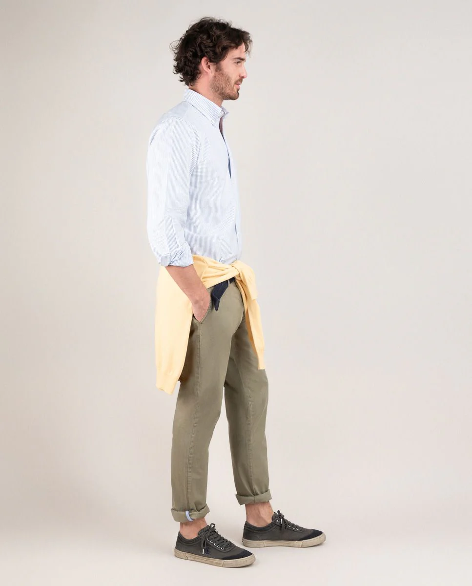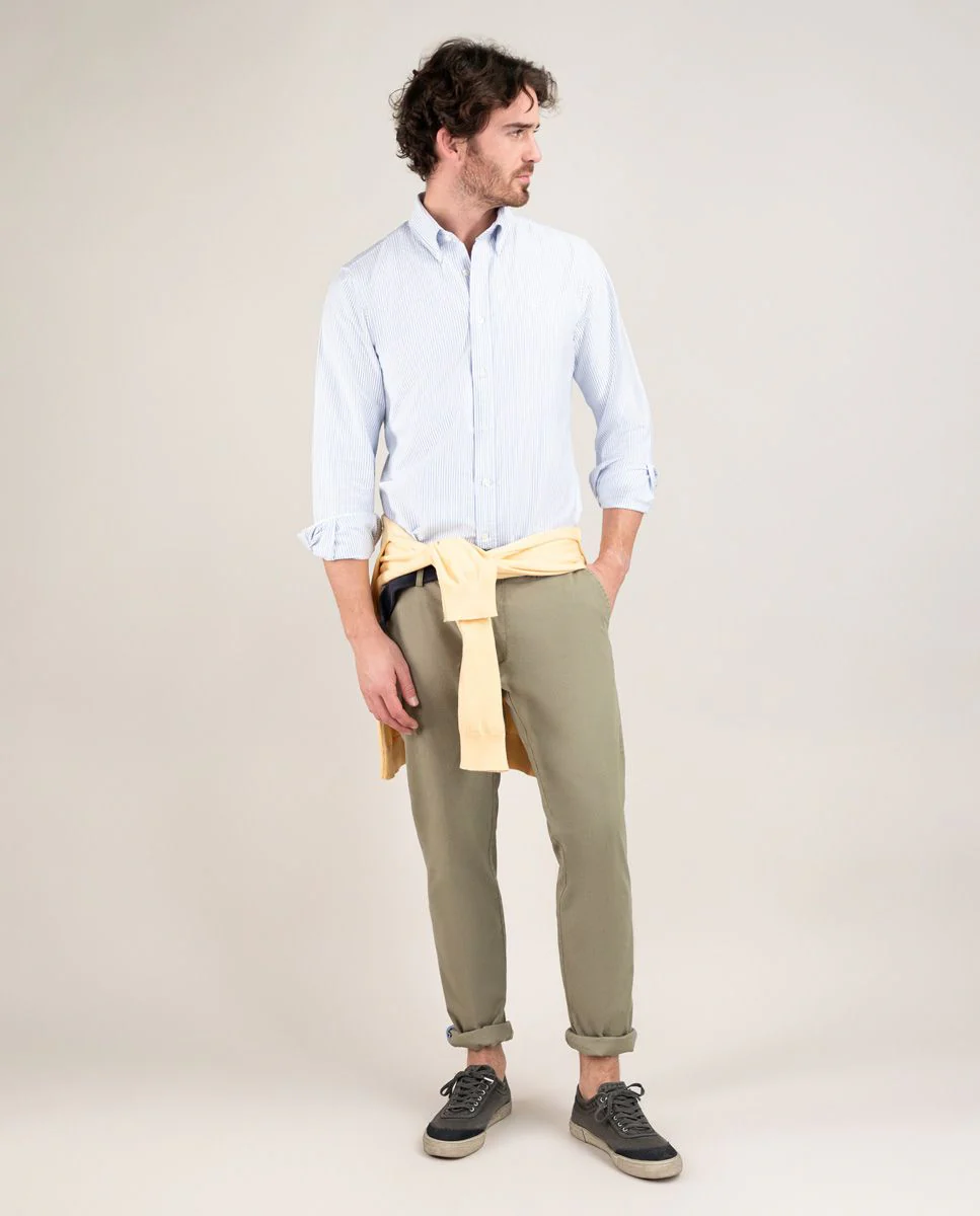 Camisa de hombre rayas oxford con tejido compuesto de 93% algodón y 7% algodón reciclado. Corte Regular Fit, cuello buttondown y cierre con botones. Manga larga terminada en puño simple y logo en el pecho bordado. Detalles interiores a contraste de cinta corbatera.