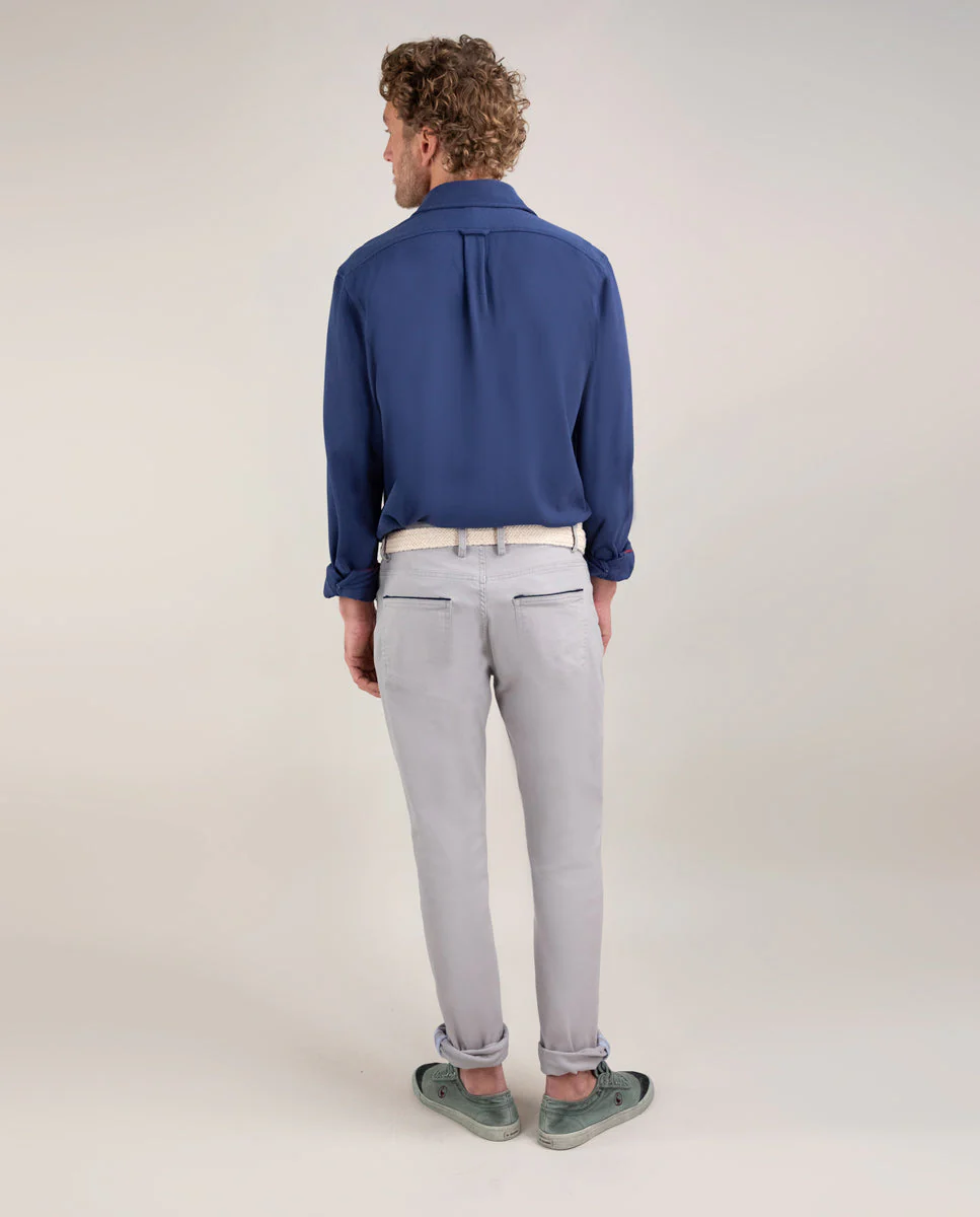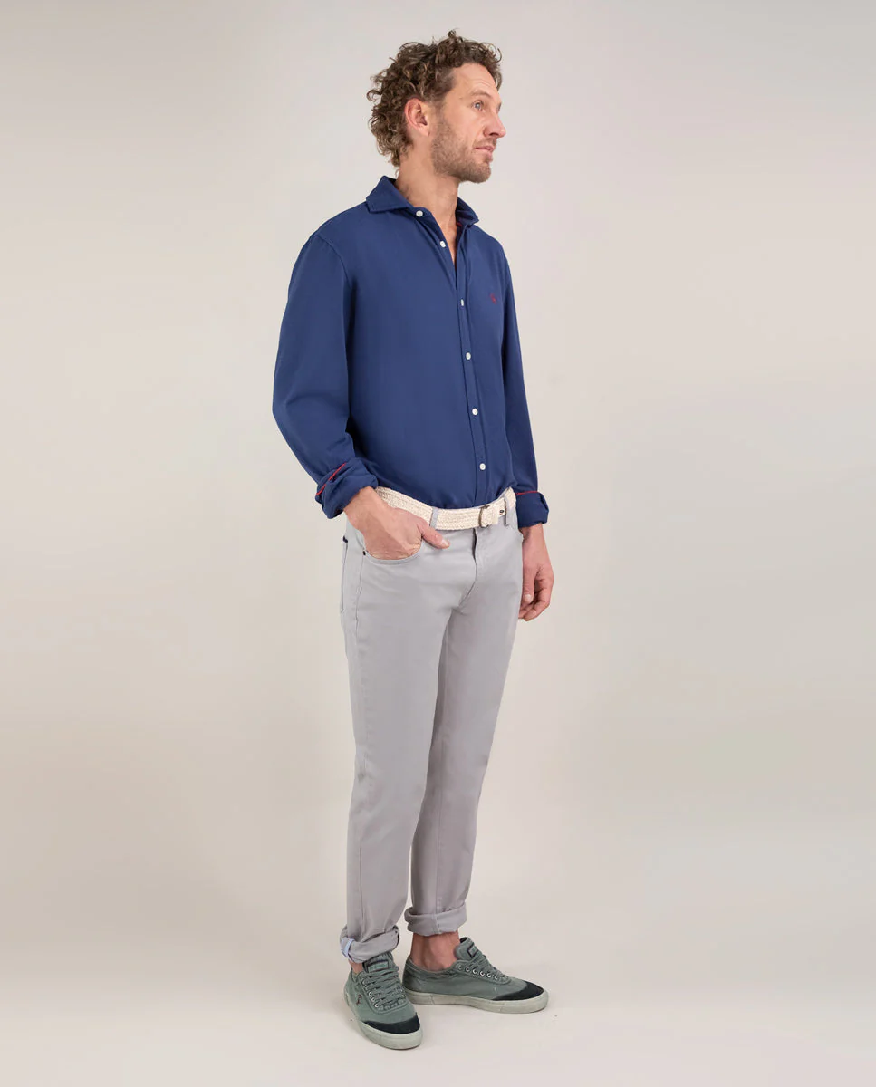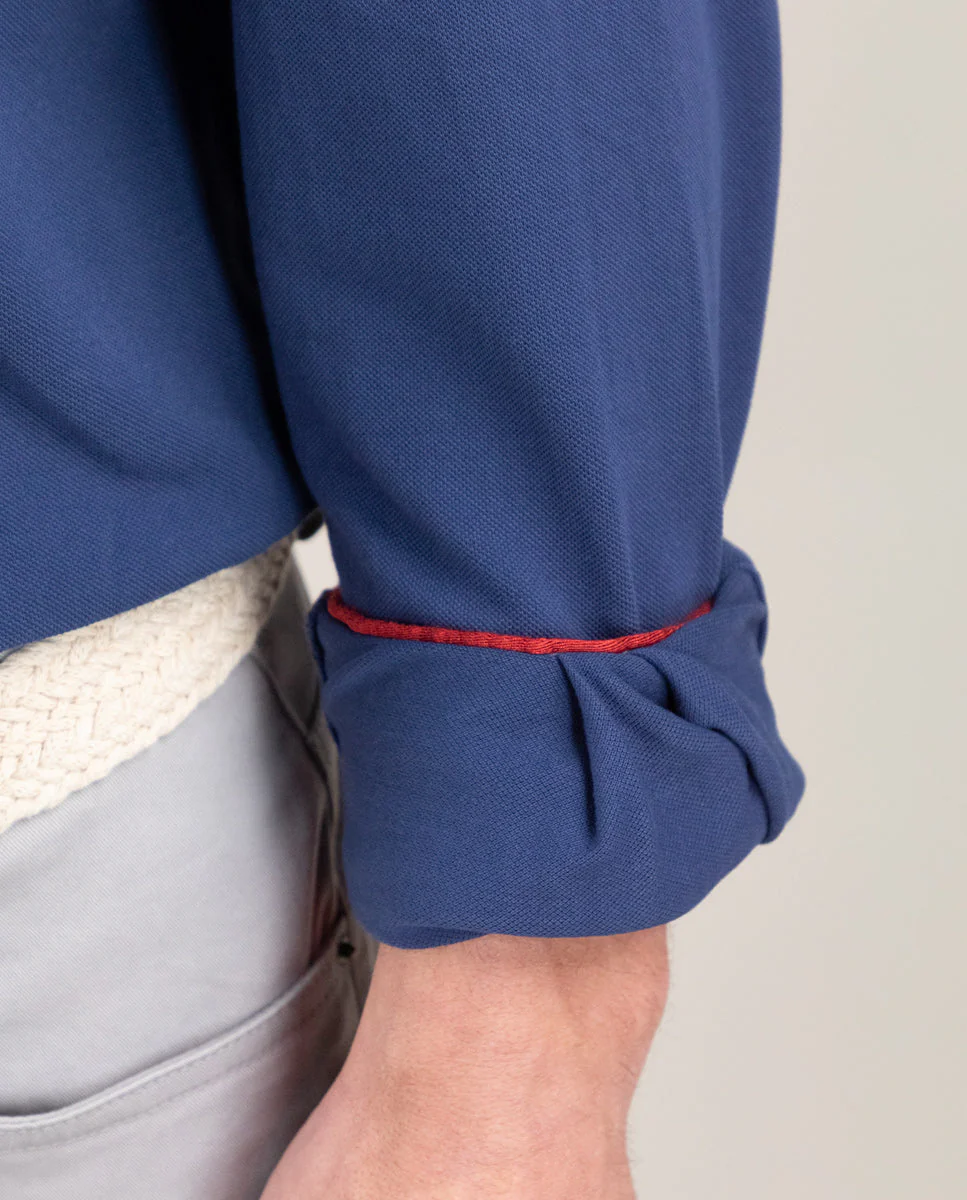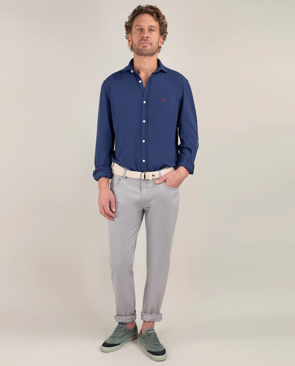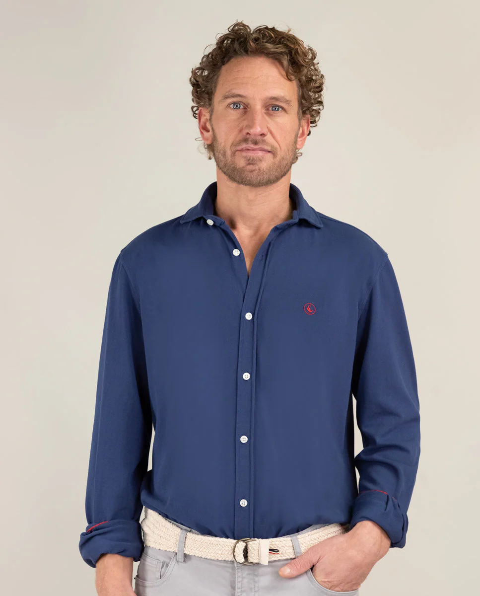 Camisa punto lisa de hombre confeccionada en punto 100% algodón, tintada en prenda consiguiendo un color empolvado. Corte Regular Fit, cuello italiano con ballenas y cierre con botones y tapeta. Manga larga terminada en puño simple y logo bordado en el pecho.