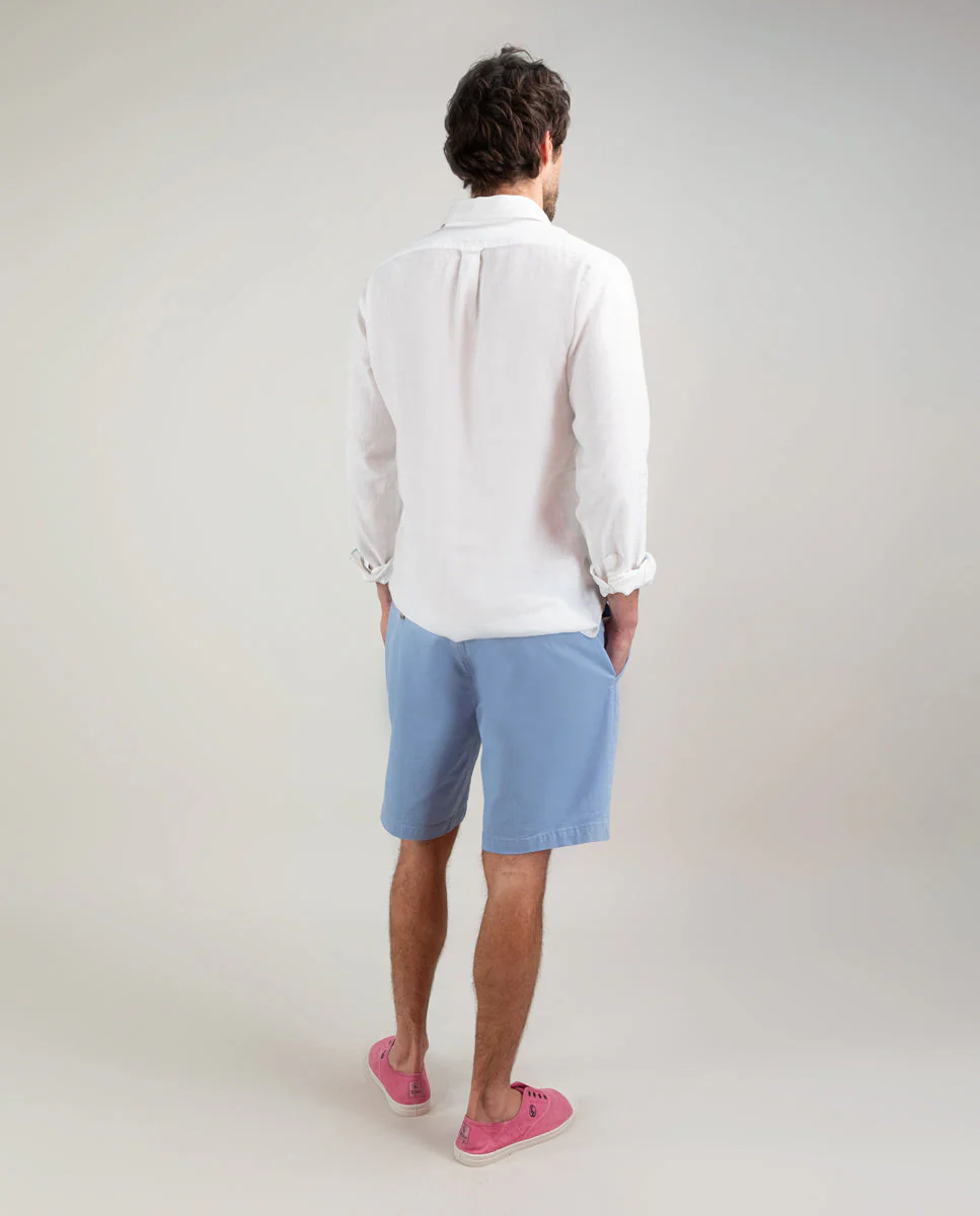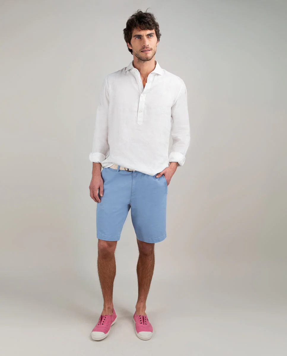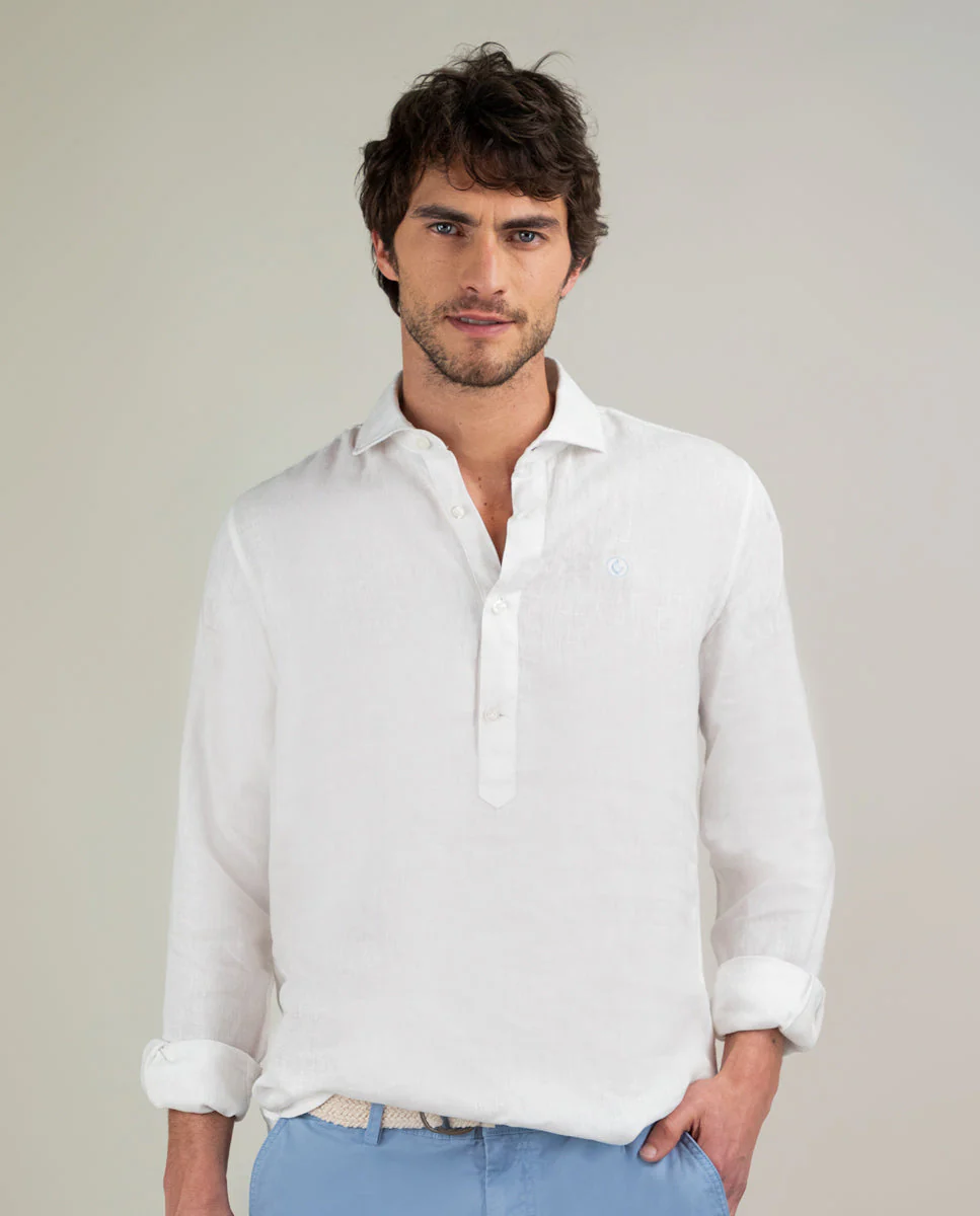 Camisa de hombre lisa confeccionada en tejido 100% lino. Estilo polera, corte Regular Fit, cuello italiano y cierre con botones y tapeta. Manga larga terminada en puño simple. Detalle de piping a contraste en cuello y puños. Logo bordado en el pecho.