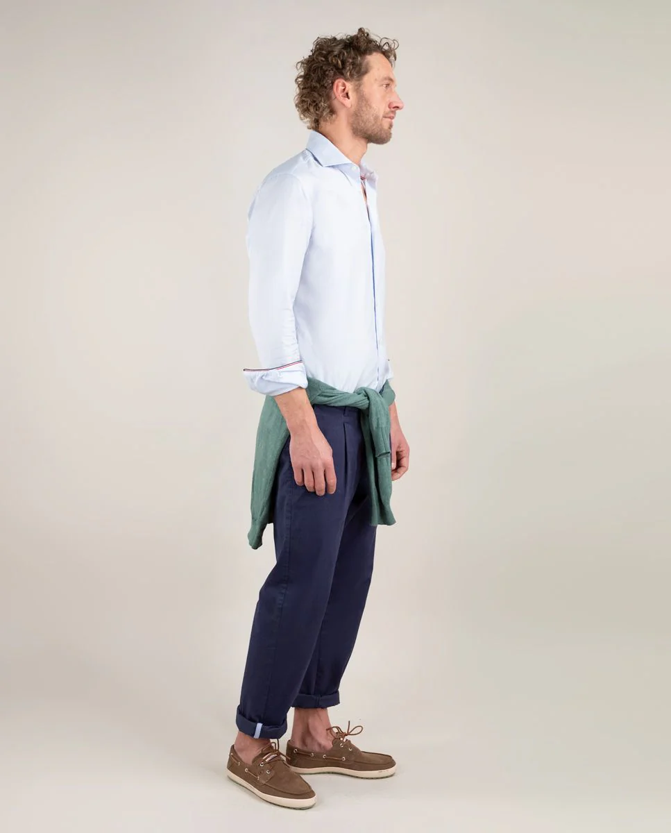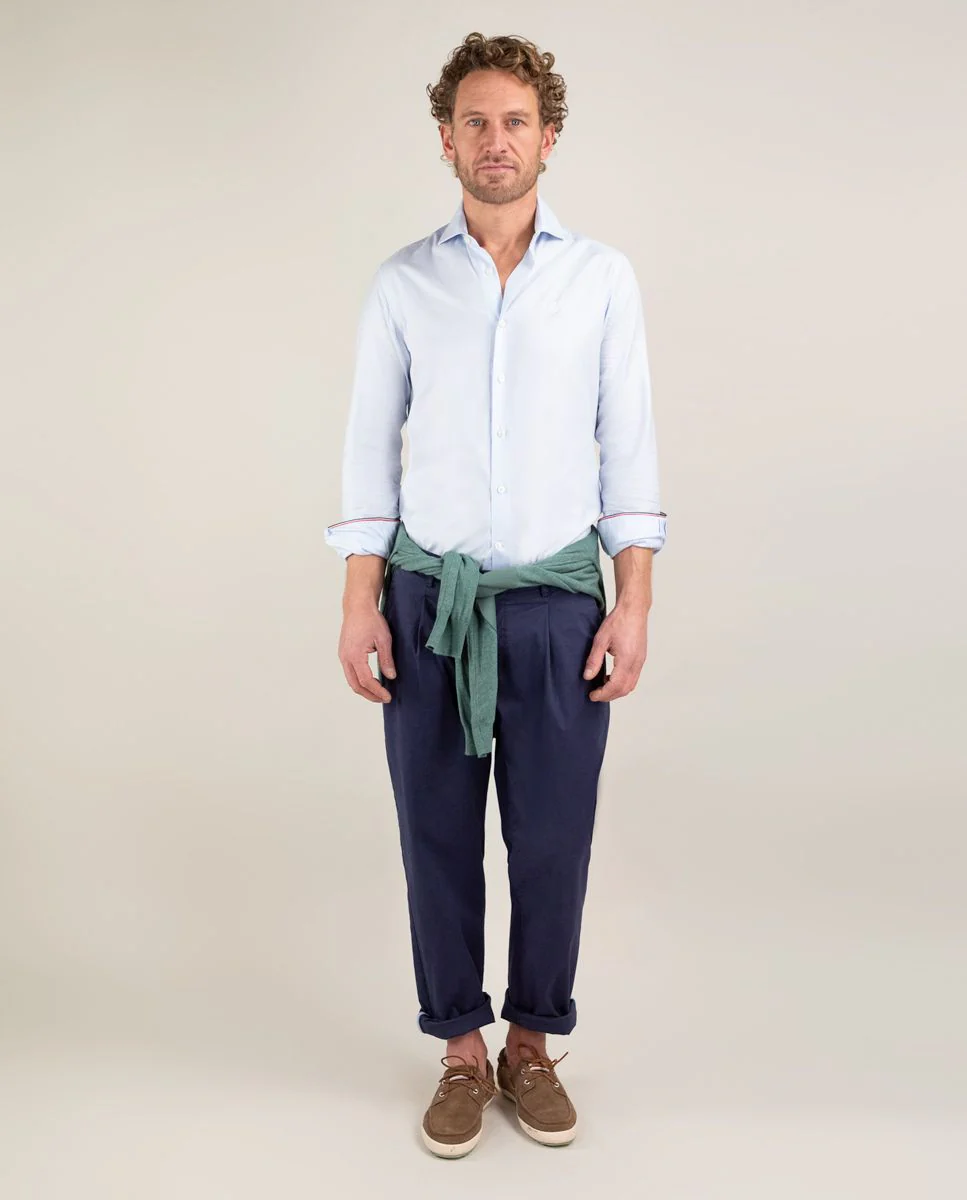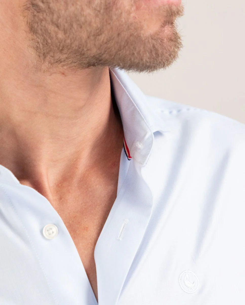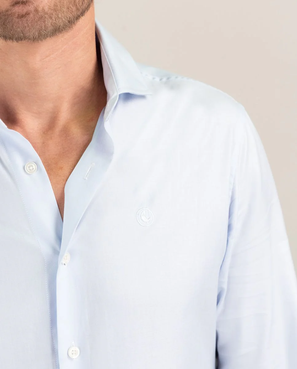 Camisa popelín de hombre. Camisa lisa confeccionada en 100% algodón. Corte Slim Fit, cuello italiano con ballenas. Manga larga terminada en puño simple y logo en el pecho bordado.