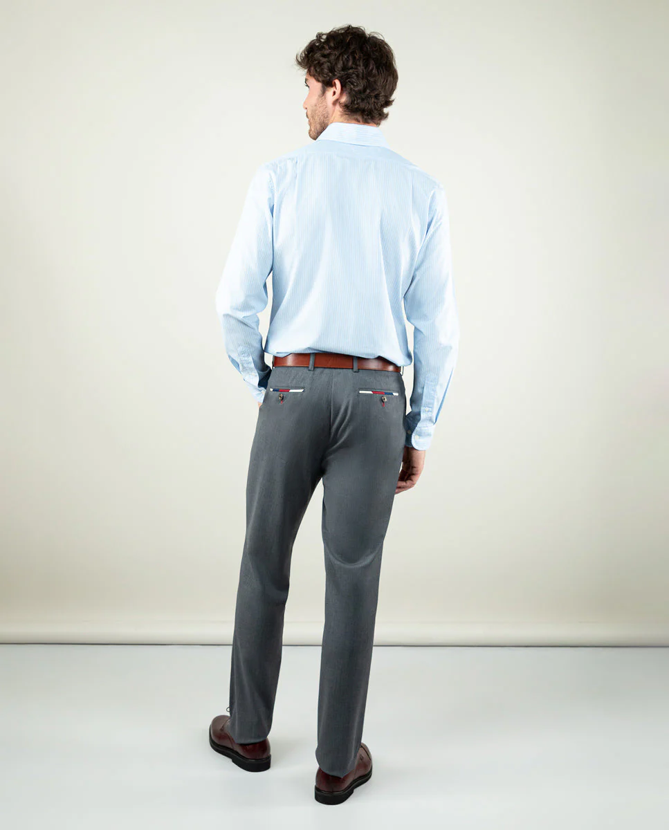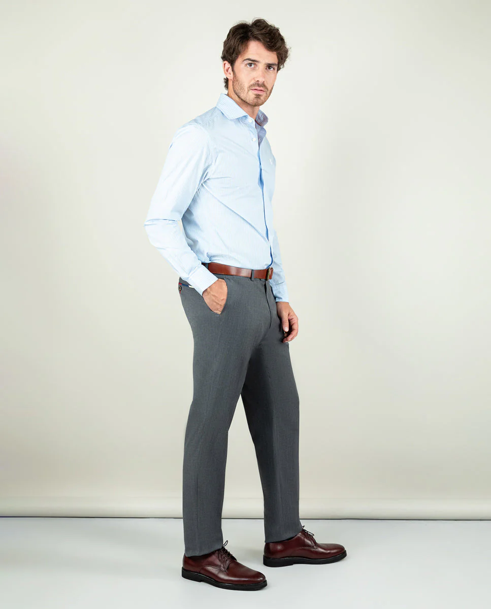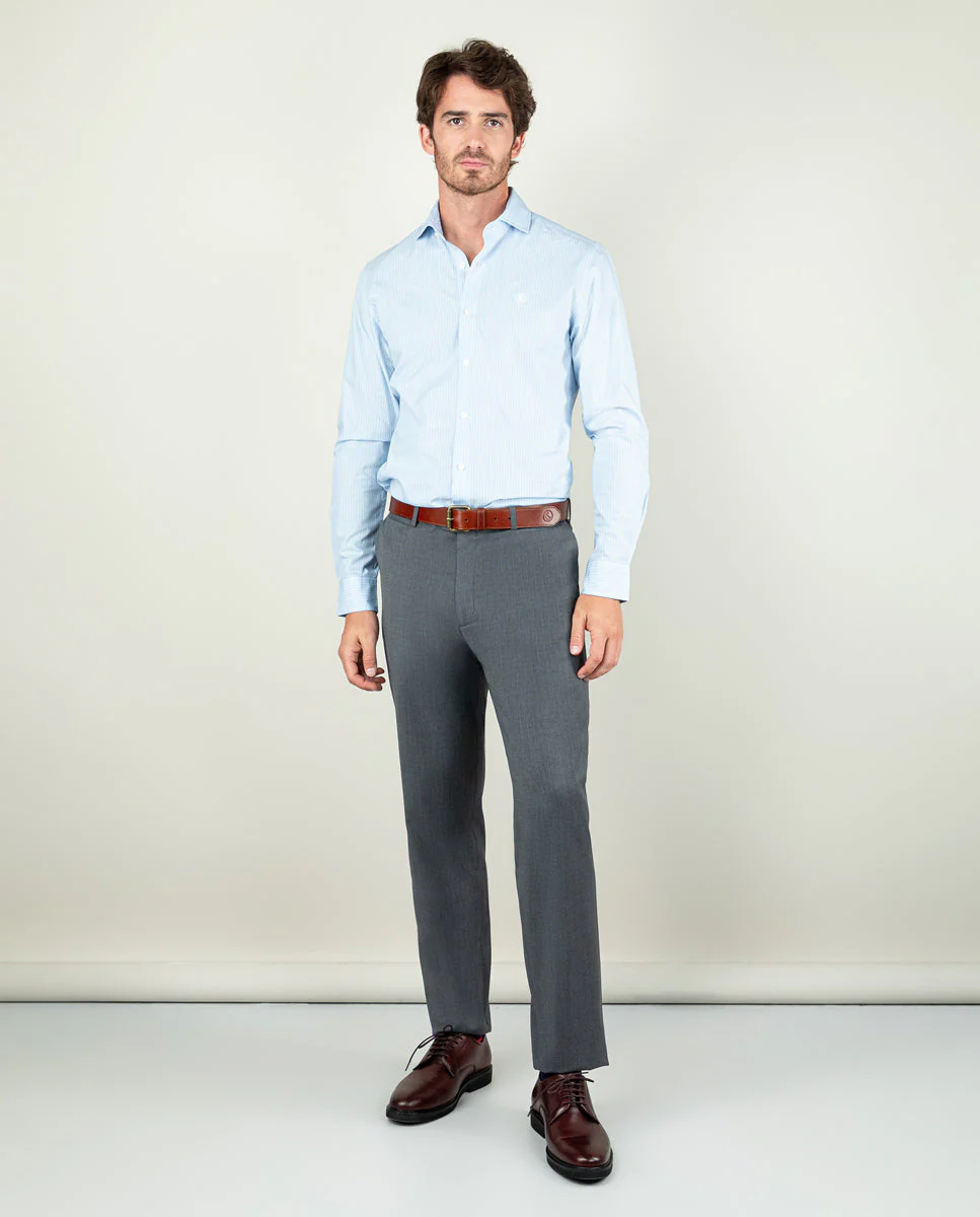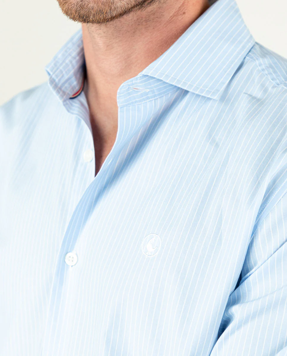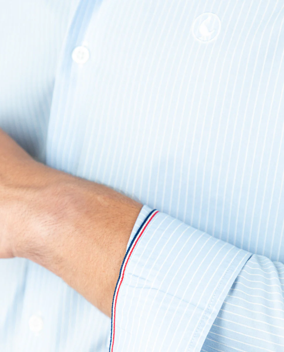 Camisa popelín de hombre. Raya Bengal confeccionada en 100% algodón. Corte Slim Fit, cuello italiano con ballenas. Manga larga terminada en puño simple y logo en el pecho bordado. | Better Cotton Initiative. La misión de Better Cotton es ayudar a las comunidades algodoneras a sobrevivir y prosperar, mientras se protege y restaura el medio ambiente.