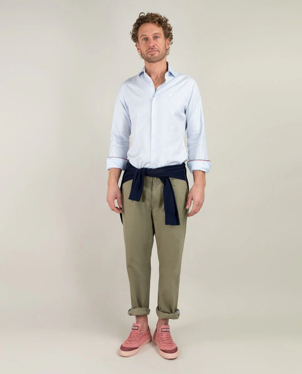 Camisa popelín de hombre. Raya Butcher confeccionada en 100% algodón. Corte Slim Fit, cuello italiano con ballenas. Manga larga terminada en puño simple y logo en el pecho bordado. | Better Cotton Initiative. La misión de Better Cotton es ayudar a las comunidades algodoneras a sobrevivir y prosperar, mientras se protege y restaura el medio ambiente.