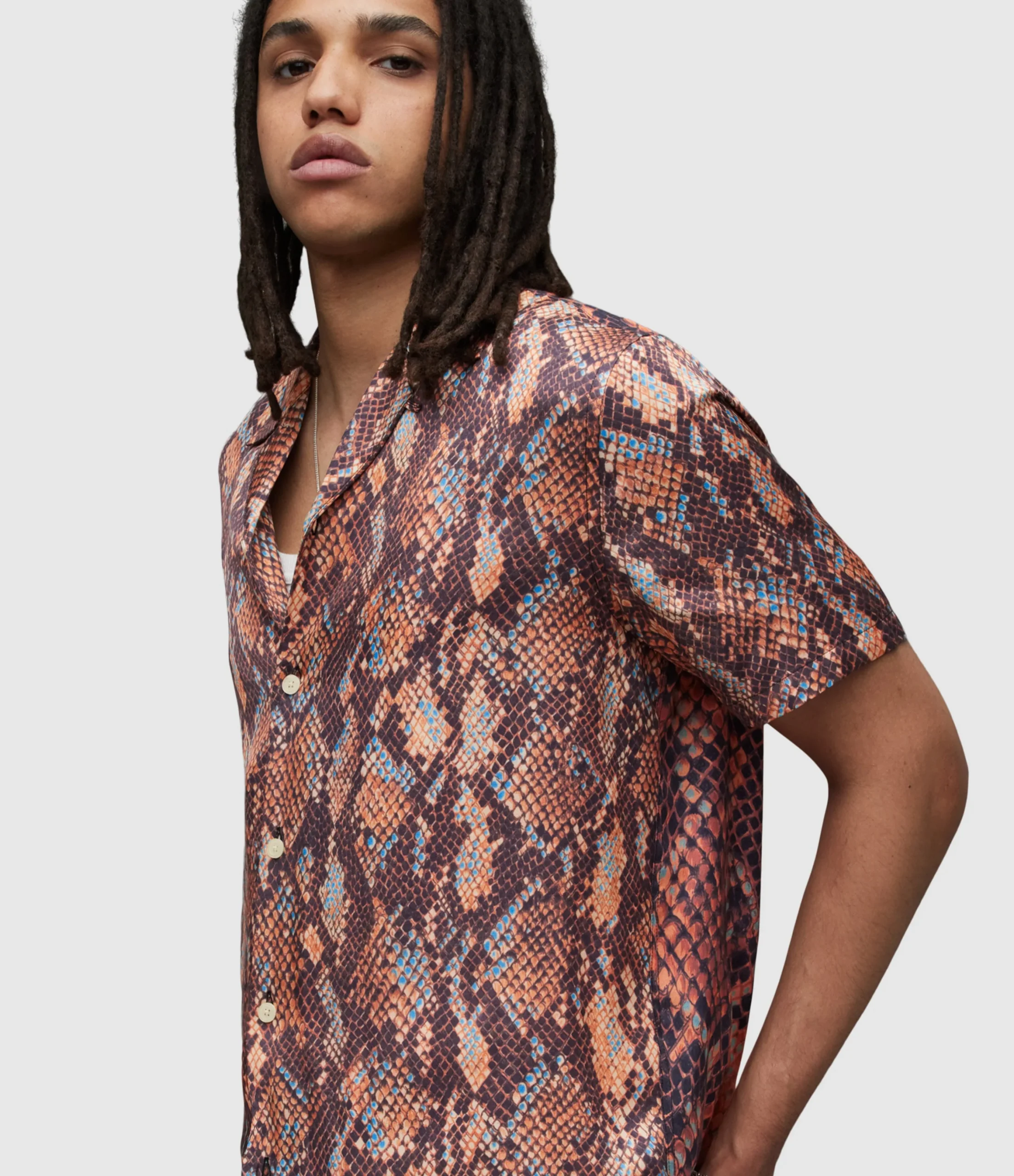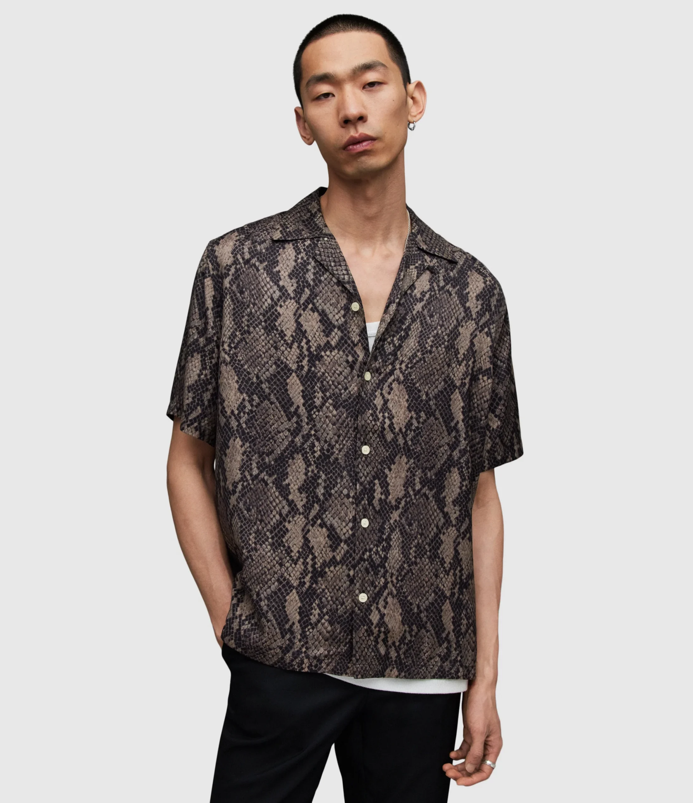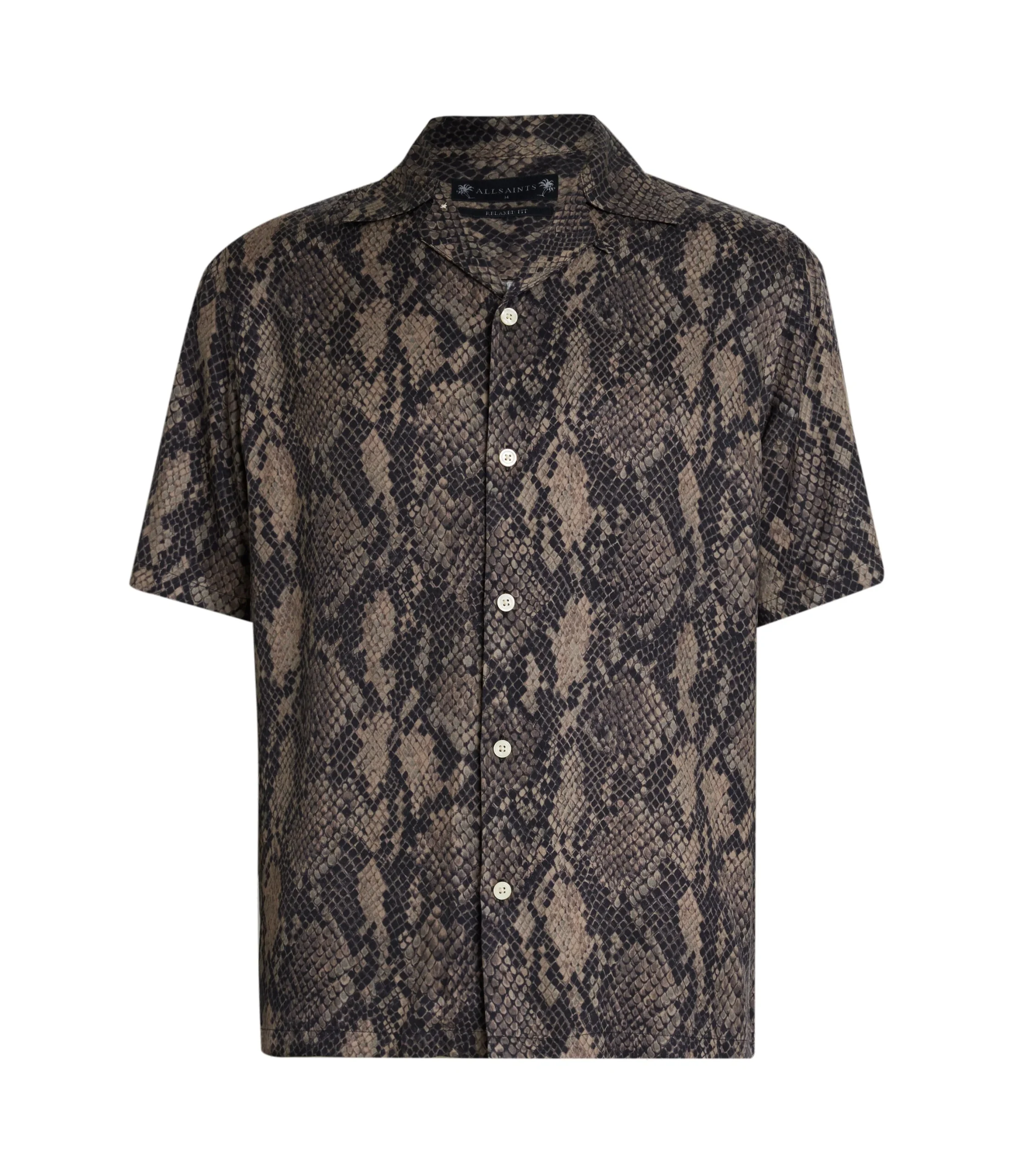 RATTLE SS SHIRT MS059Z BLACK AUG Button closure Relaxed fit Camp collar Short sleeve Mixing 2 different scales Snake skin print motif. Hawaiian shirt details with camp collar & straight hem N/A N Woven Light Digital RInse Wash 1 1
