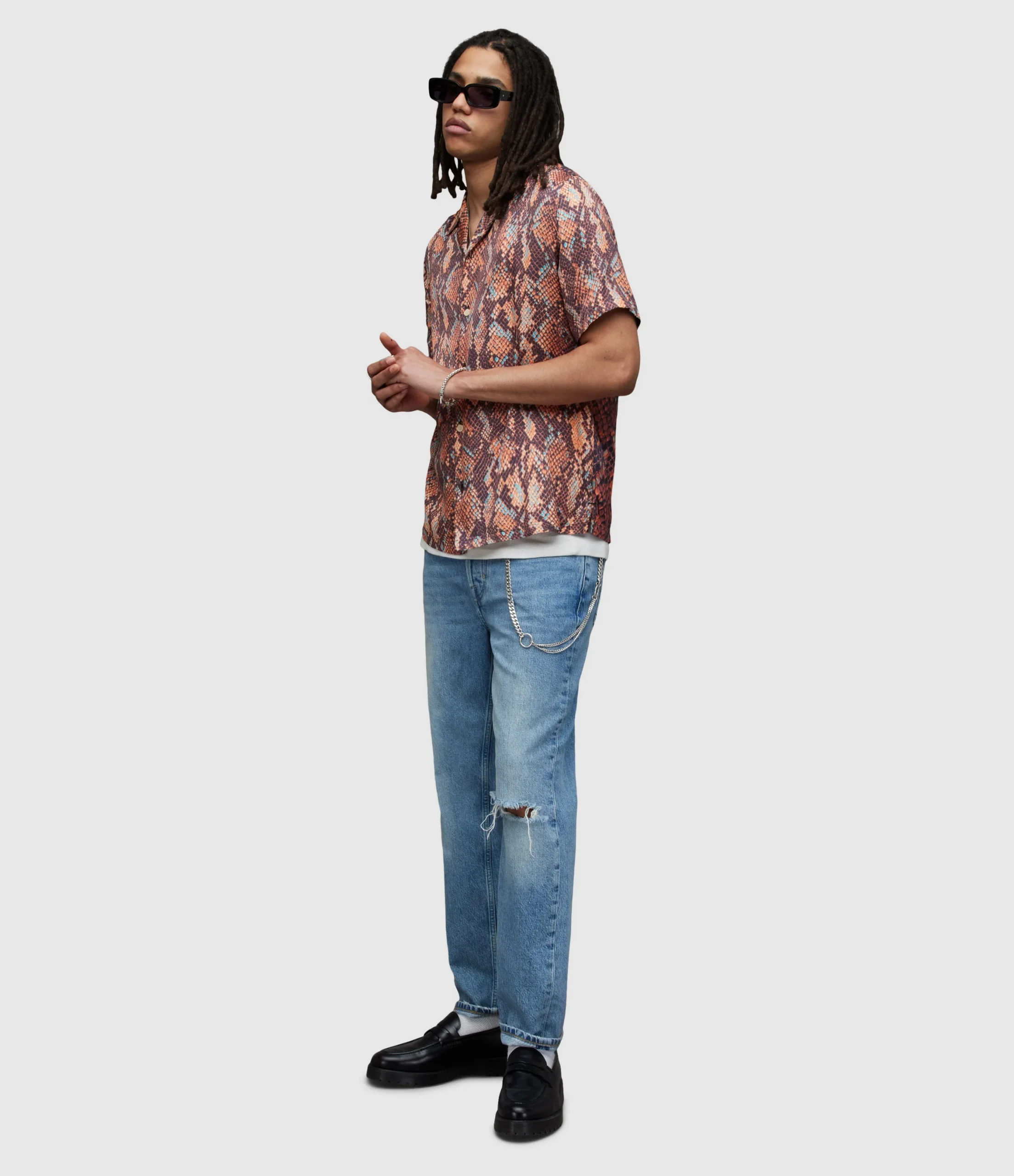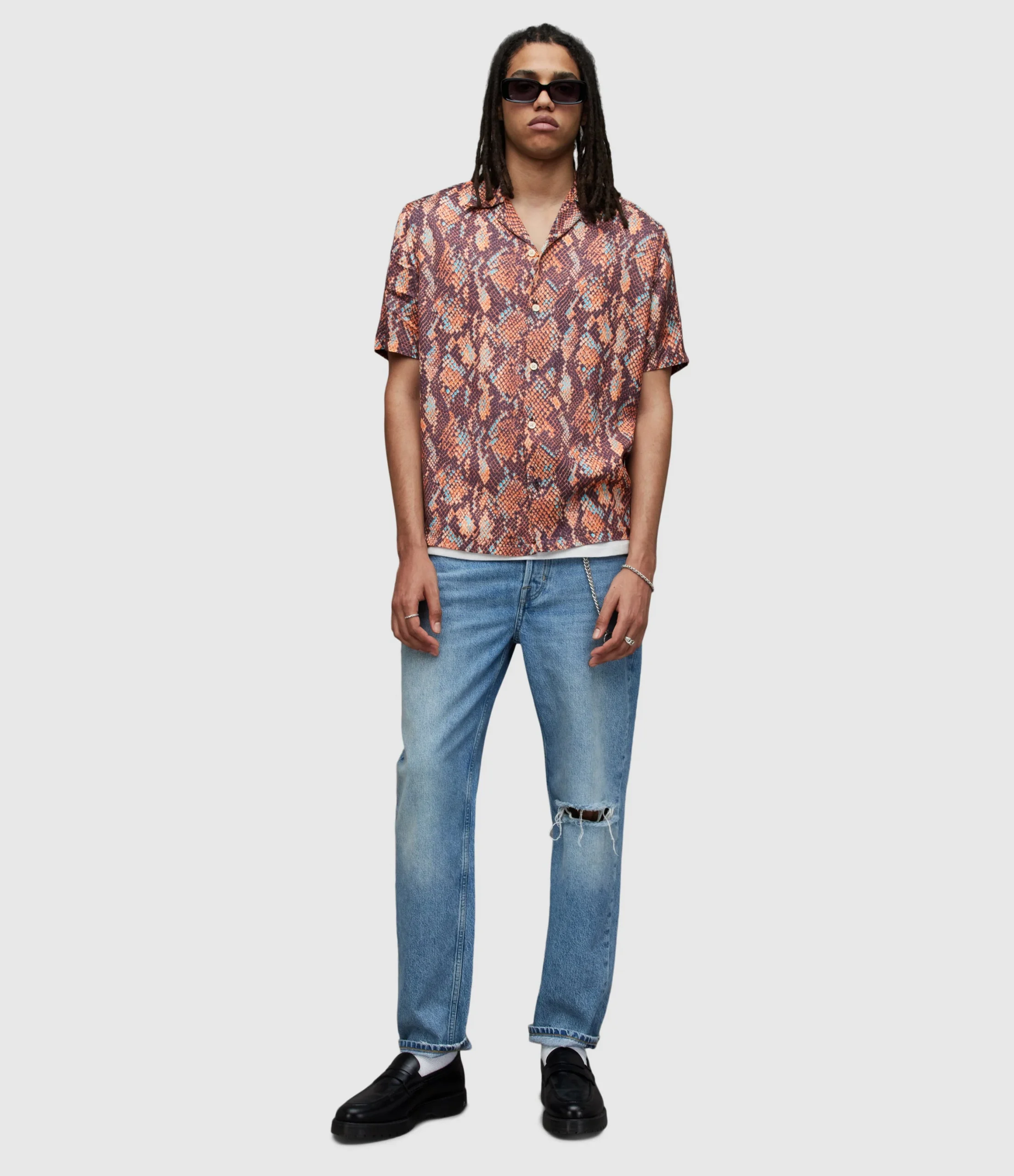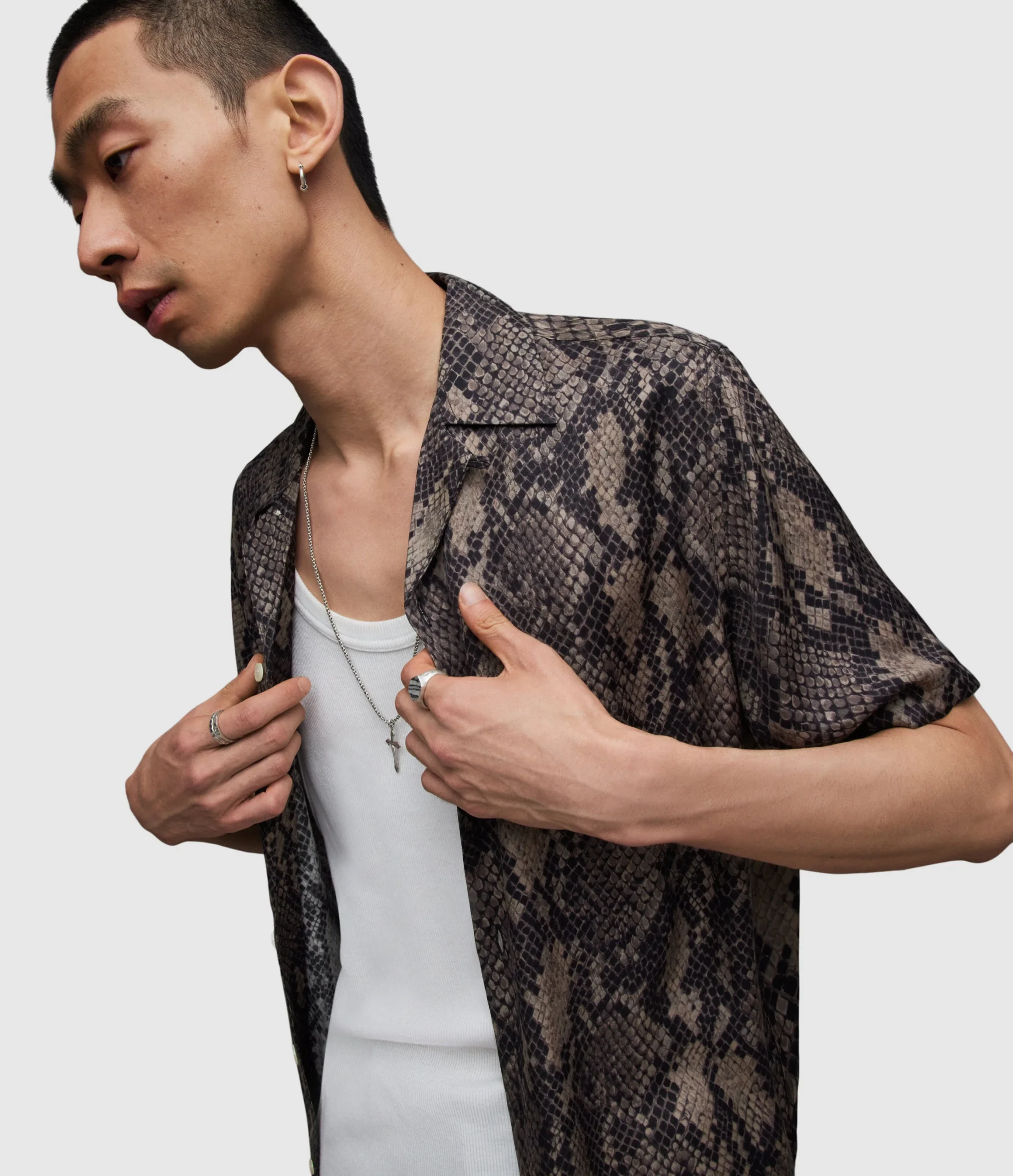 RATTLE SS SHIRT MS059Z BLACK AUG Button closure Relaxed fit Camp collar Short sleeve Mixing 2 different scales Snake skin print motif. Hawaiian shirt details with camp collar & straight hem N/A N Woven Light Digital RInse Wash 1 1