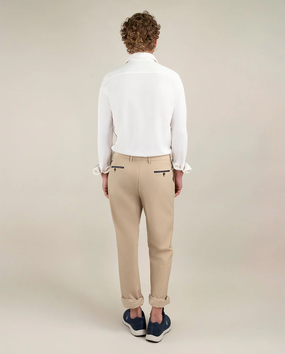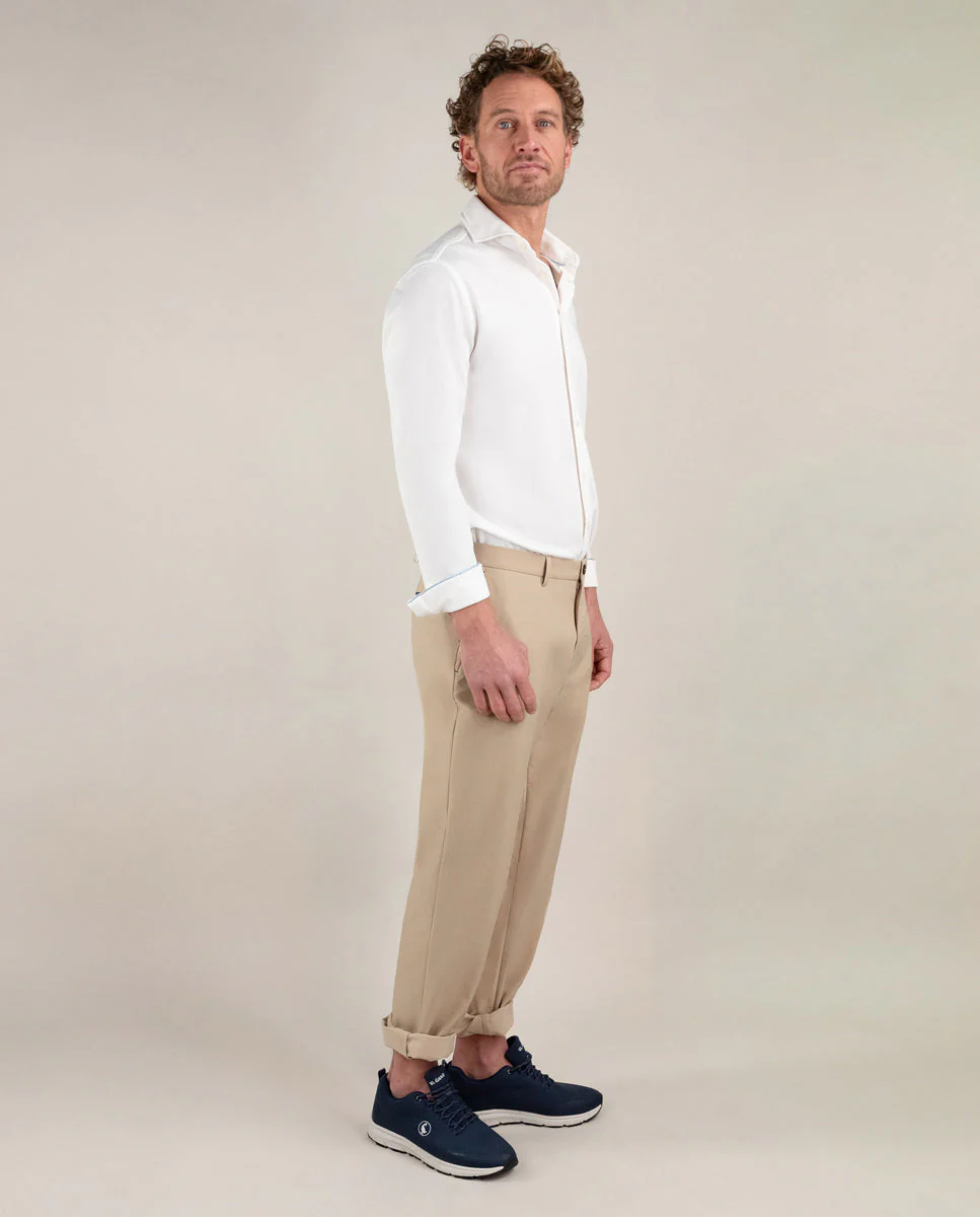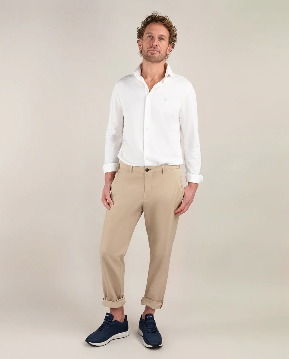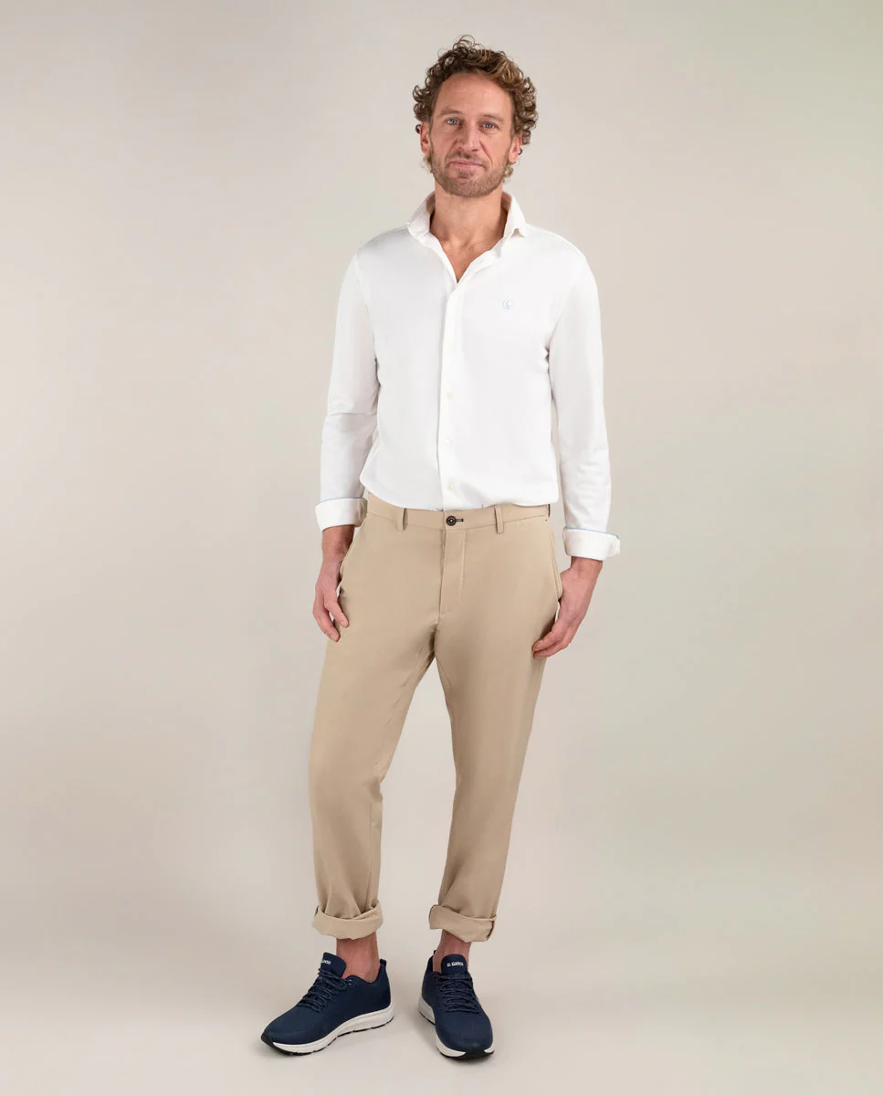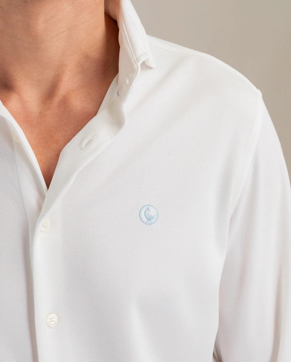 Camisa de hombre lisa con tecnología Sepiia confeccionada en 100% poliéster técnico antibacteriano reciclable. Corte Slim Fit, cuello buttondown y cierre con botones. Manga larga terminada en puño simple y logo bordado en el pecho a contraste. Tiene cortes en la espalda que permite ajustarse ligeramente al cuerpo, manteniendo la comodidad. Costura del hombro reforzada, para prevenir el desgaste por el uso. Bajo redondeado. Estos tejidos han sido producidos en España y las prendas han sido confeccionadas en Portugal de una forma sostenible.