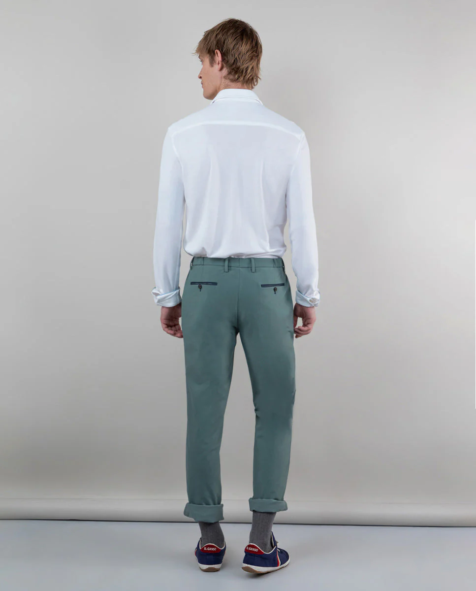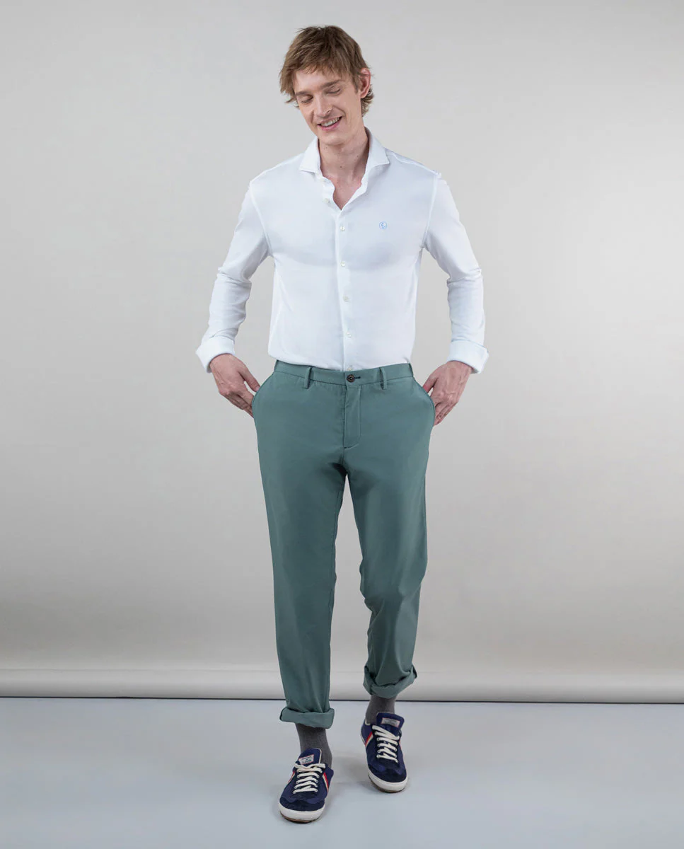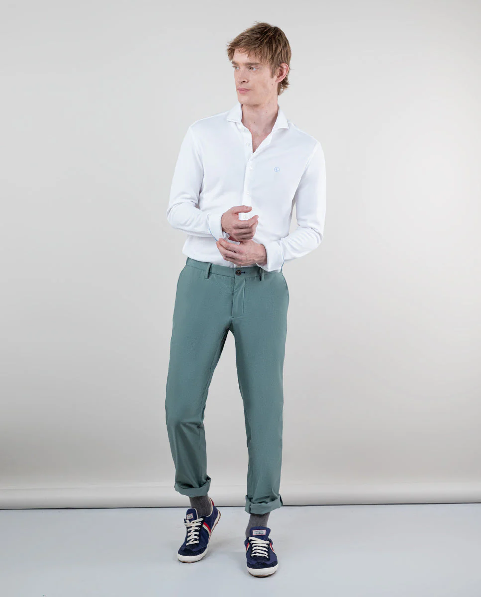Camisa de hombre lisa con tecnología Sepiia confeccionada en 100% poliéster técnico antibacteriano reciclable. Corte Slim Fit, cuello buttondown y cierre con botones. Manga larga terminada en puño simple y logo bordado en el pecho a contraste. Tiene cortes en la espalda que permite ajustarse ligeramente al cuerpo, manteniendo la comodidad. Costura del hombro reforzada, para prevenir el desgaste por el uso. Bajo redondeado. Estos tejidos han sido producidos en España y las prendas han sido confeccionadas en Portugal de una forma sostenible.