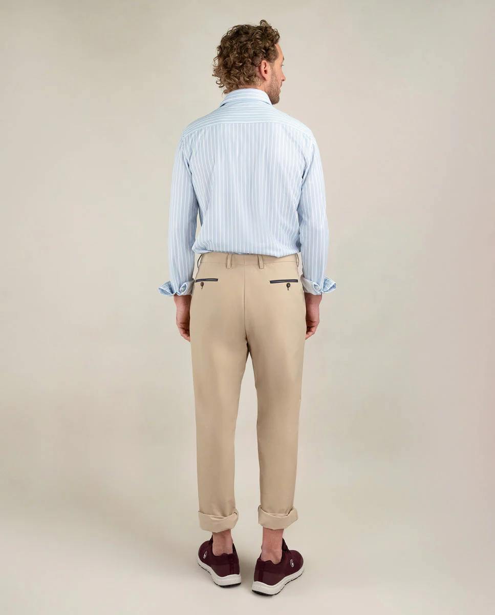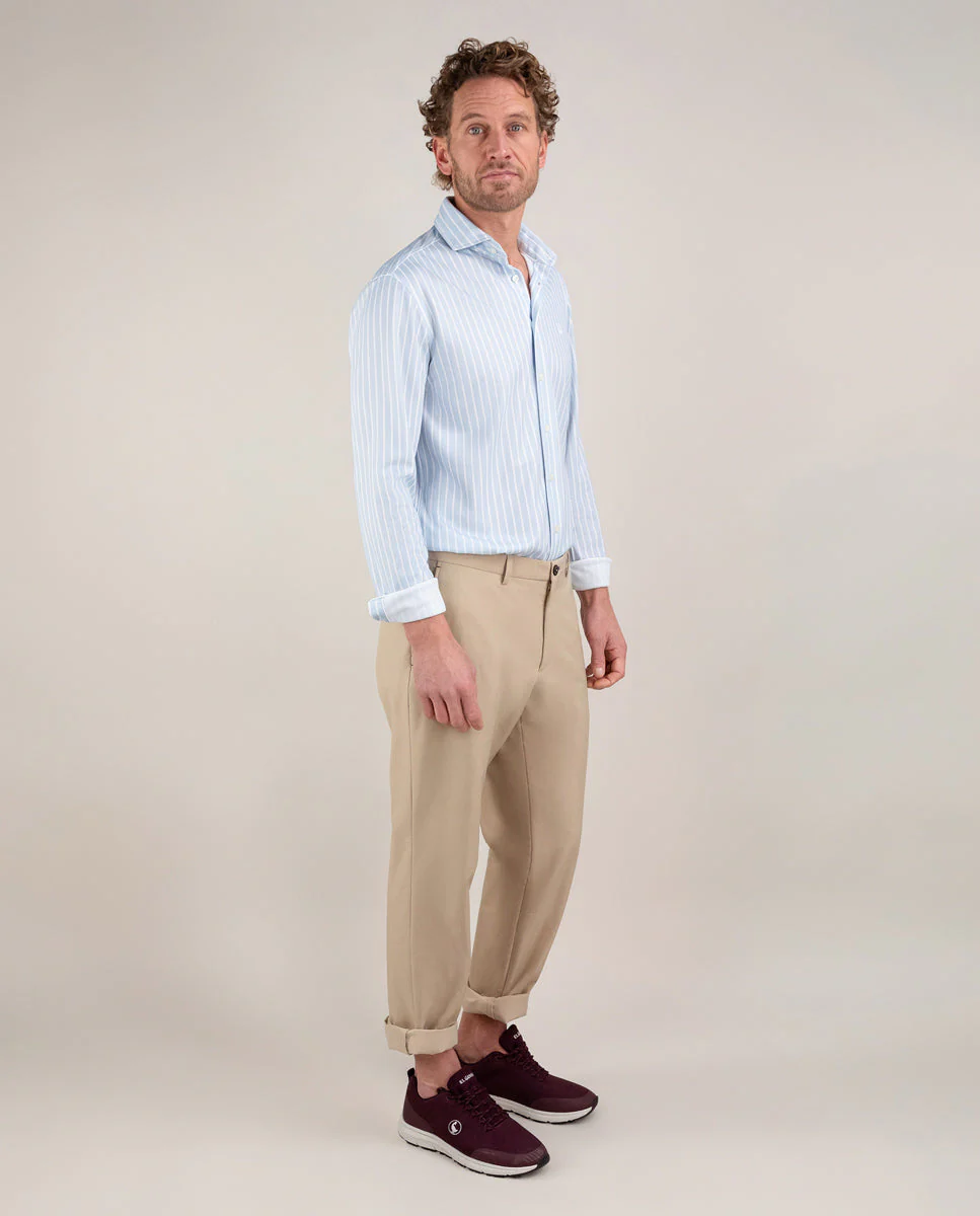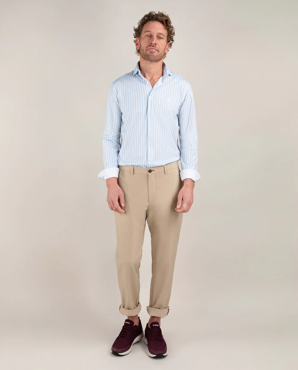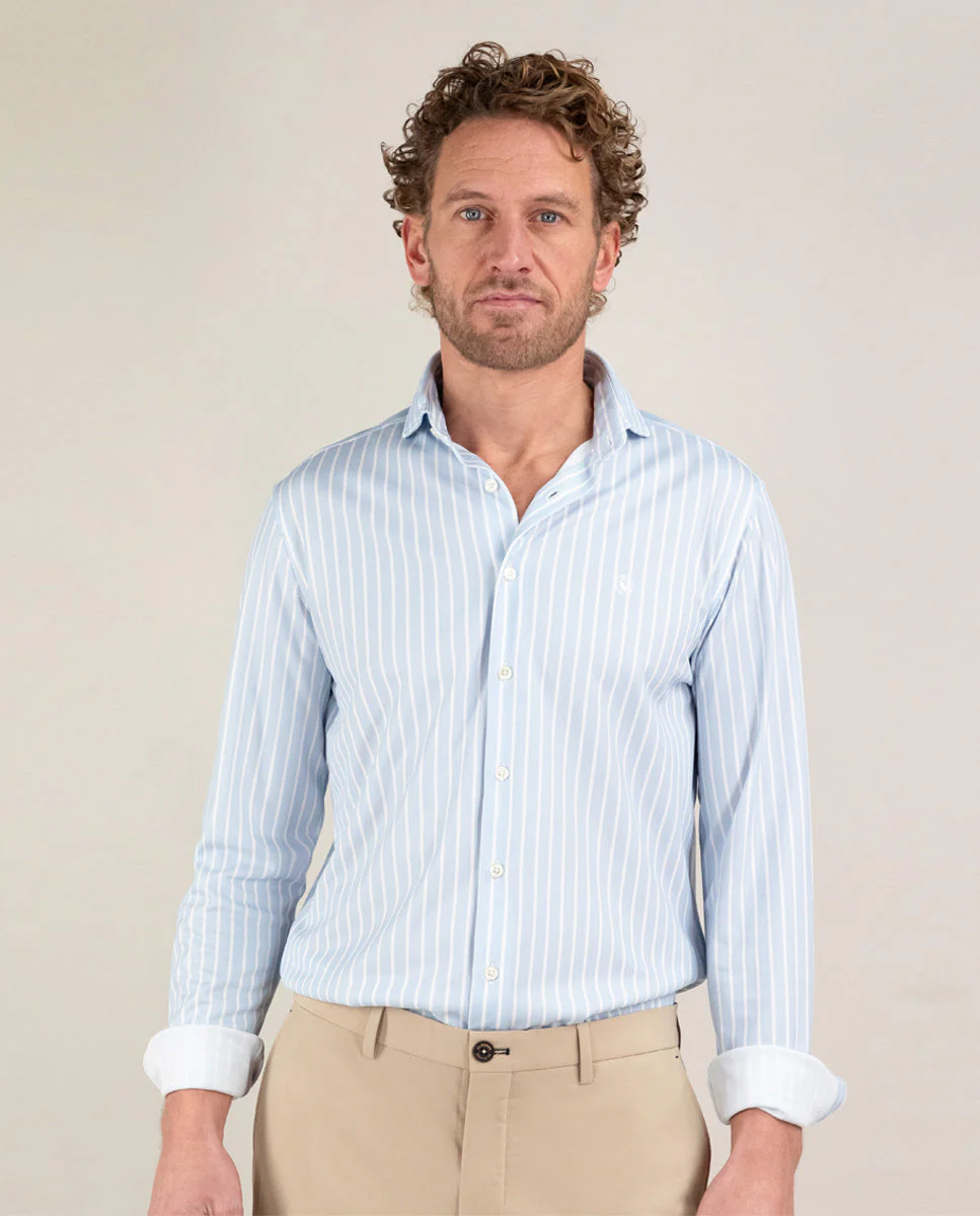 Camisa de hombre raya butcher con tecnología Sepiia confeccionada en 100% poliéster técnico antibacteriano reciclable. Corte Slim Fit, cuello buttondown y cierre con botones. Manga larga terminada en puño simple y logo bordado en el pecho a contraste. Tiene cortes en la espalda que permite ajustarse ligeramente al cuerpo, manteniendo la comodidad. Costura del hombro reforzada, para prevenir el desgaste por el uso. Bajo redondeado. Estos tejidos han sido producidos en España y las prendas han sido confeccionadas en Portugal de una forma sostenible.